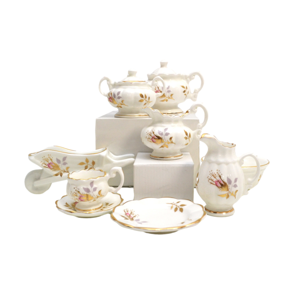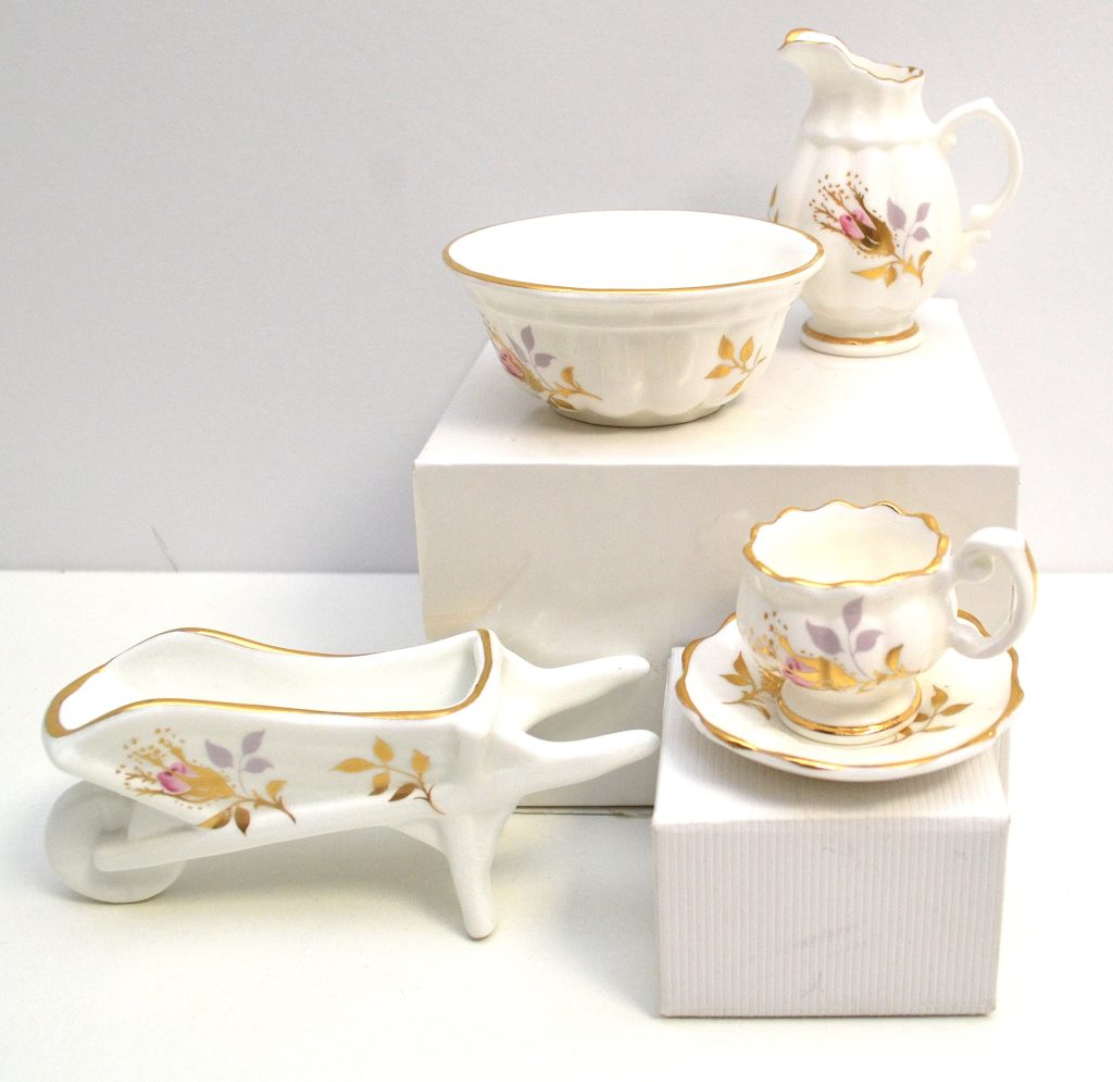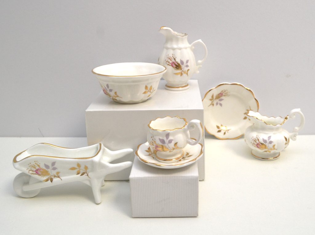 Miniatuur porseleinen serviesdelen en kruiwagen. Merk: Healacraft Made in England. Met roze roos motiefje en gouden bies.