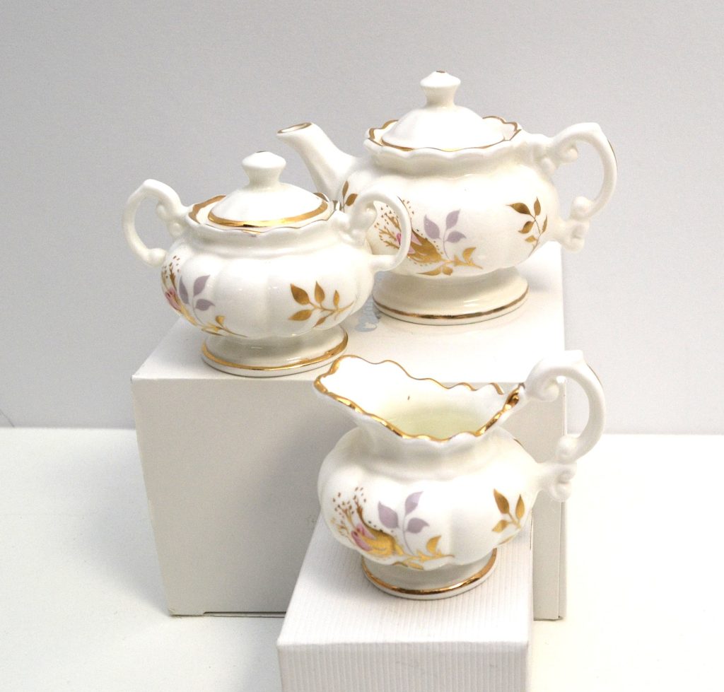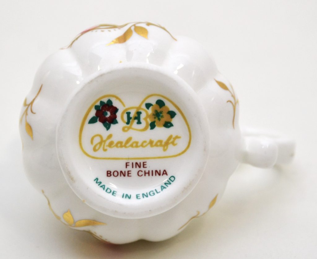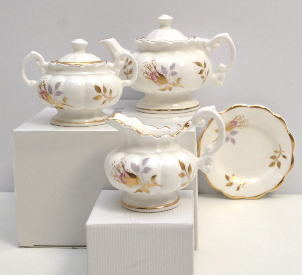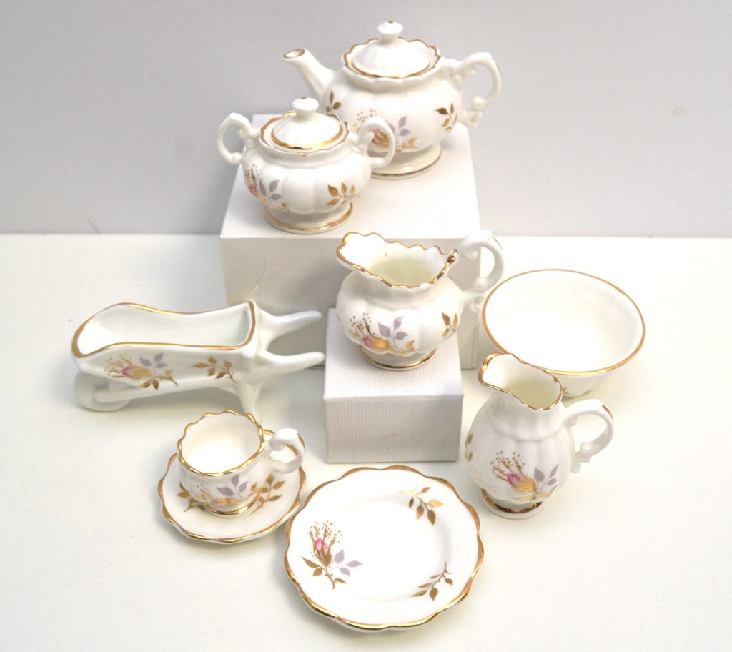 Miniatuur porseleinen serviesdelen en kruiwagen. Merk: Healacraft Made in England. Met roze roos motiefje en gouden bies.