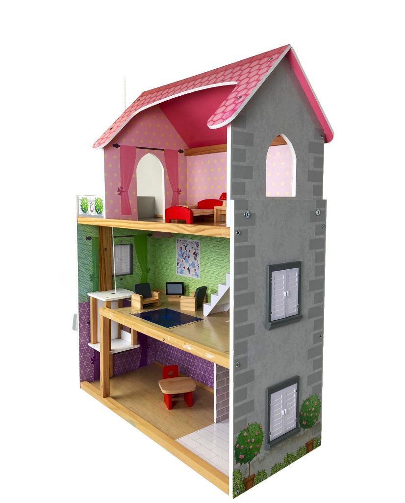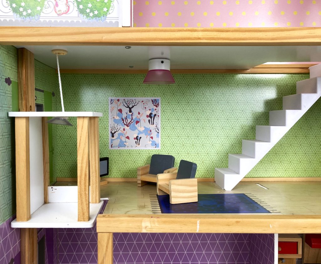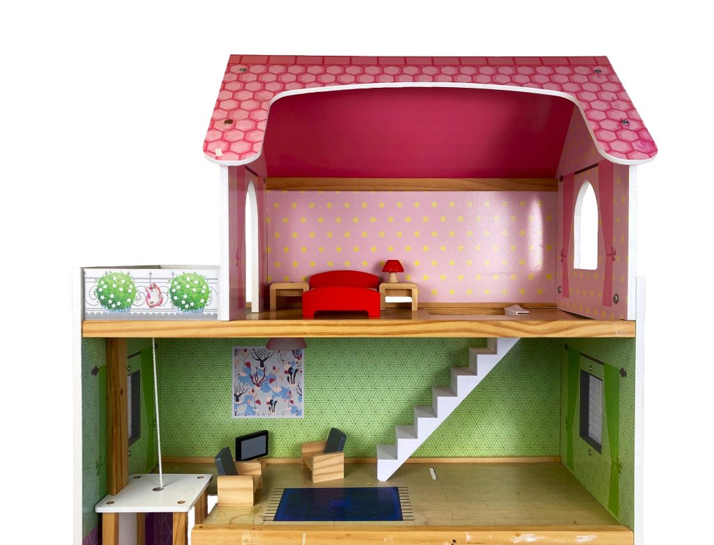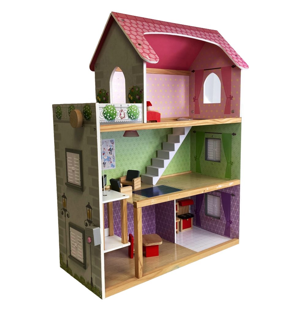 Houten poppenhuis met enkele bijbehorende meubels, werkende lift, bel en verlichting. Afmeting: 85 h x 61 b x 26 d. Uitsluitend afhalen.