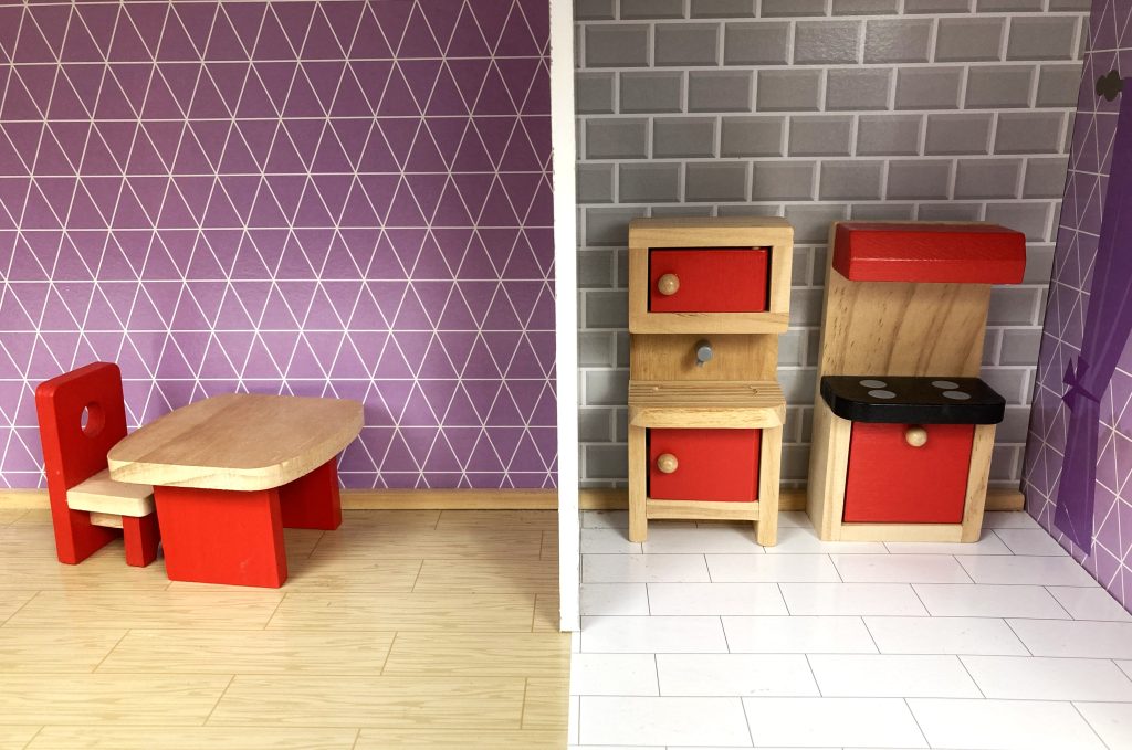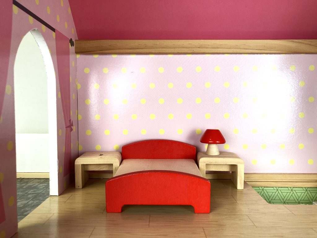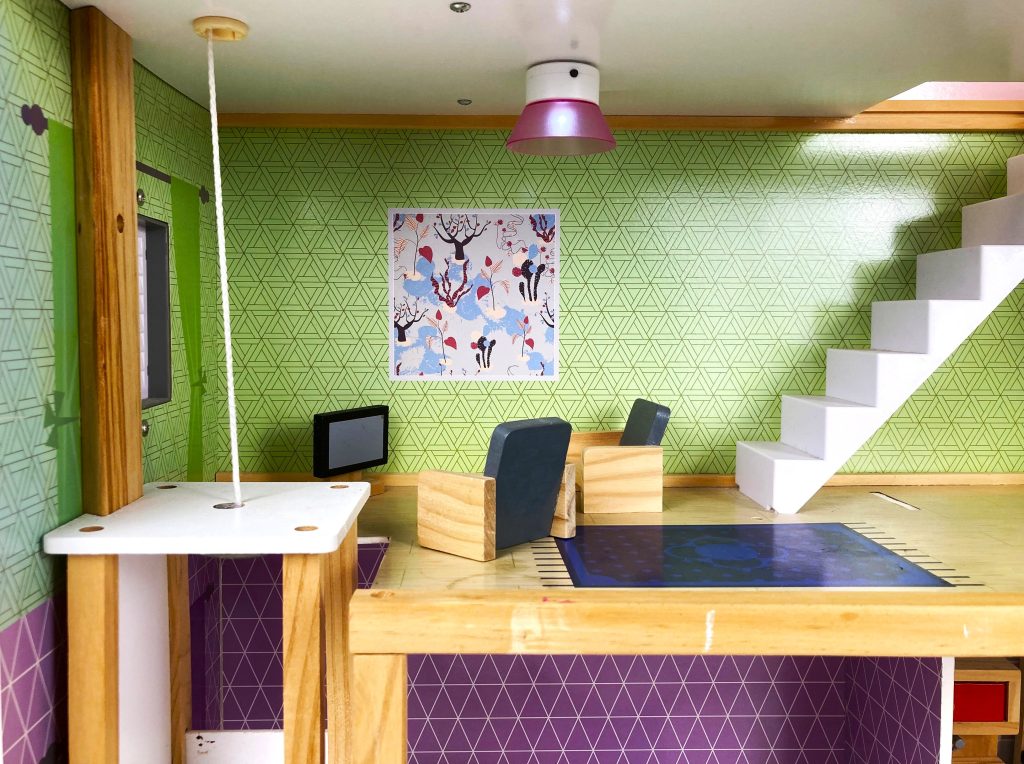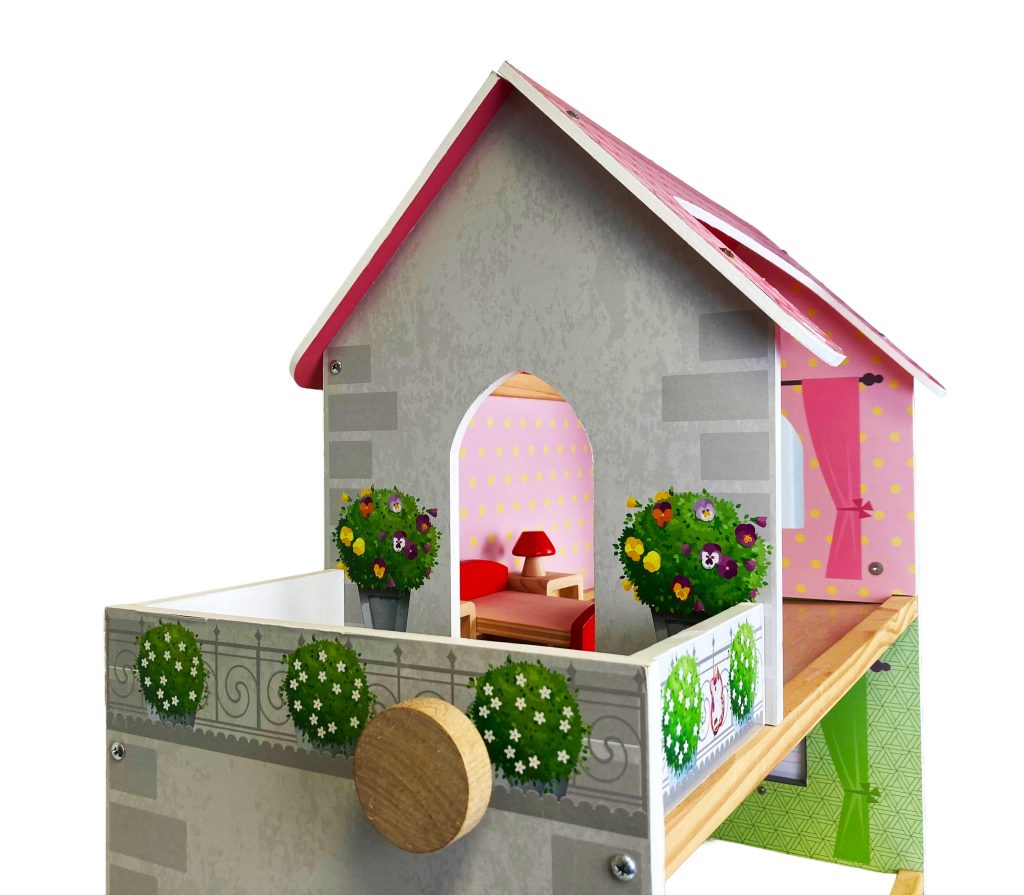 Houten poppenhuis met enkele bijbehorende meubels, werkende lift, bel en verlichting. Afmeting: 85 h x 61 b x 26 d. Uitsluitend afhalen.