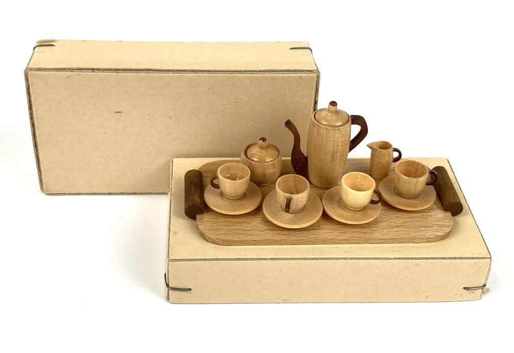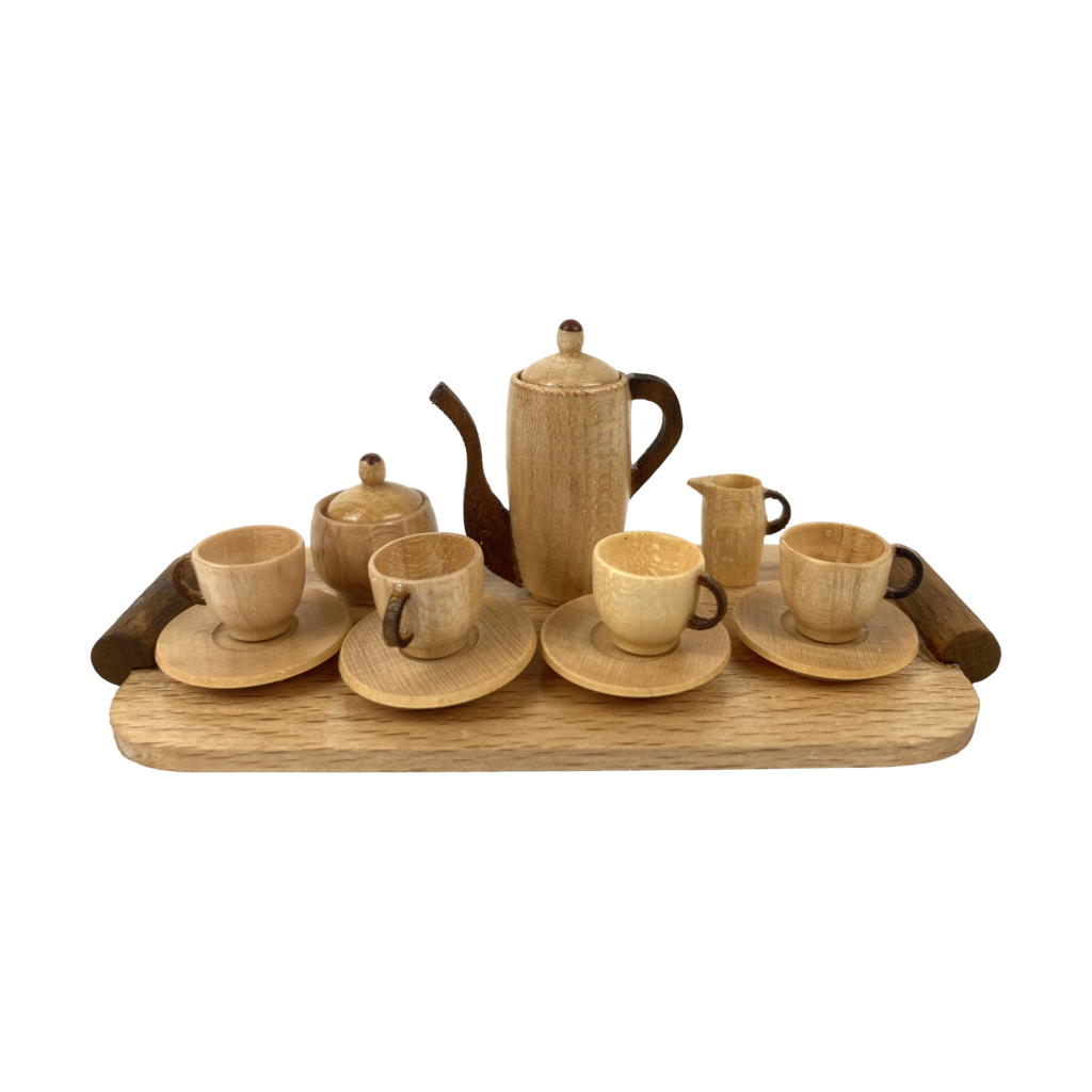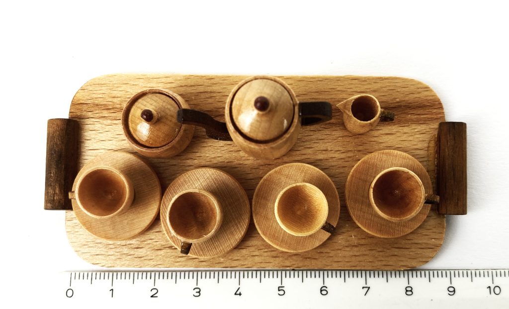 Compleet houten mini poppenhuis theeserviesje op houten dienblaadje (10×5 cm).