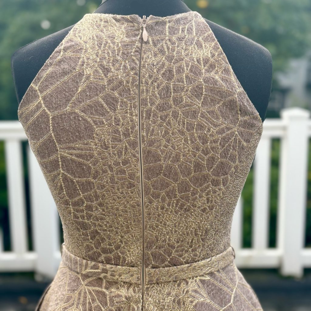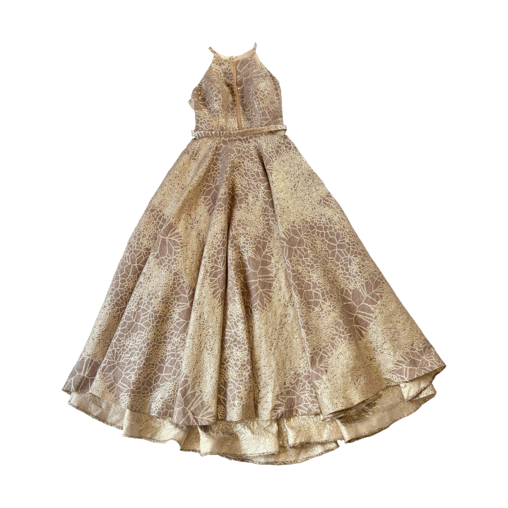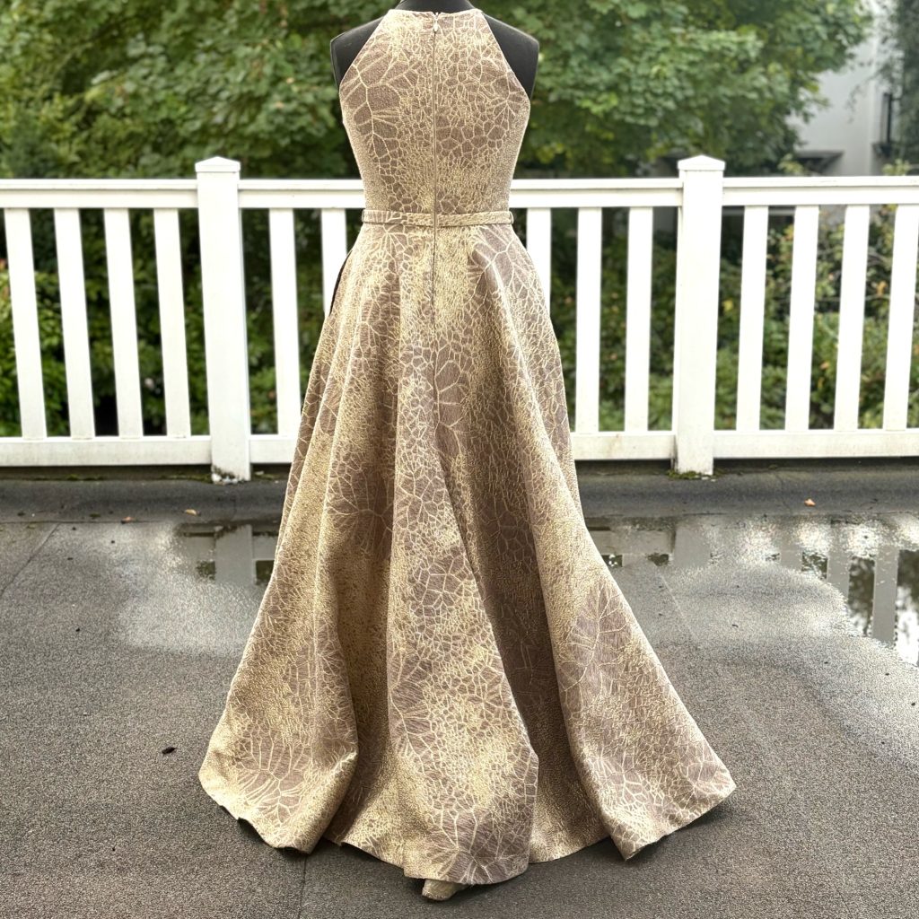 Deze avondjurk, met zijn opvallende patroon en jacquardtextuur, heeft een karaktervolle halterhalslijn en getailleerde taille. De wijde rok voelt bijna koninklijk.