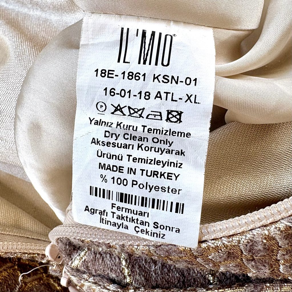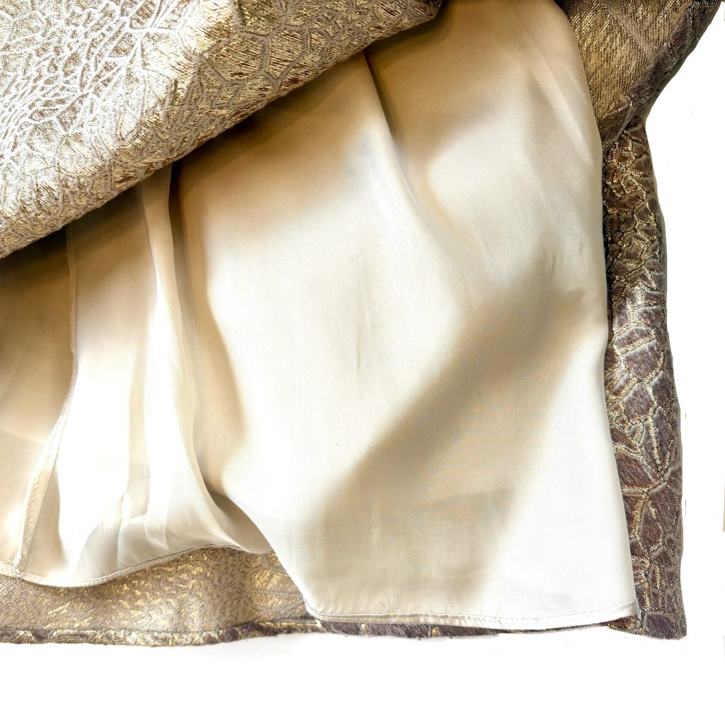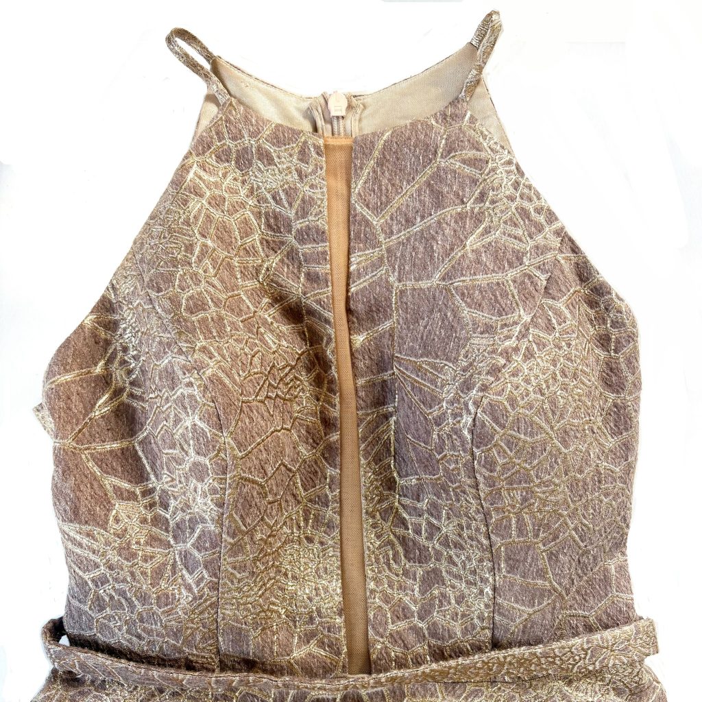 Deze avondjurk, met zijn opvallende patroon en jacquardtextuur, heeft een karaktervolle halterhalslijn en getailleerde taille. De wijde rok voelt bijna koninklijk.