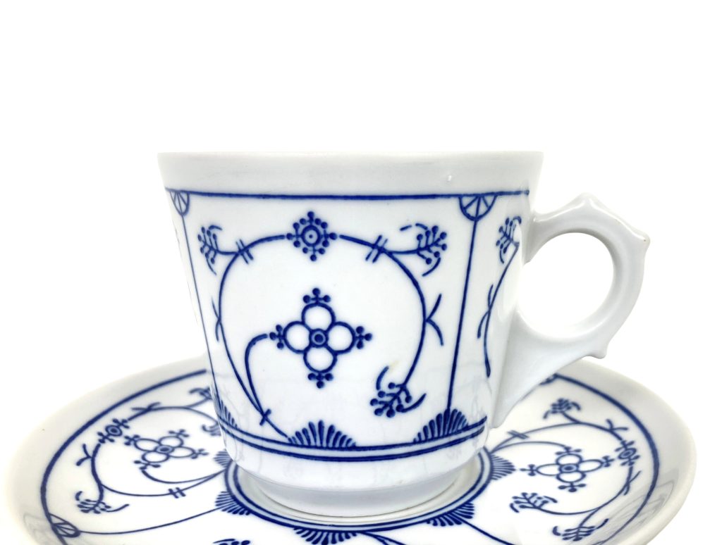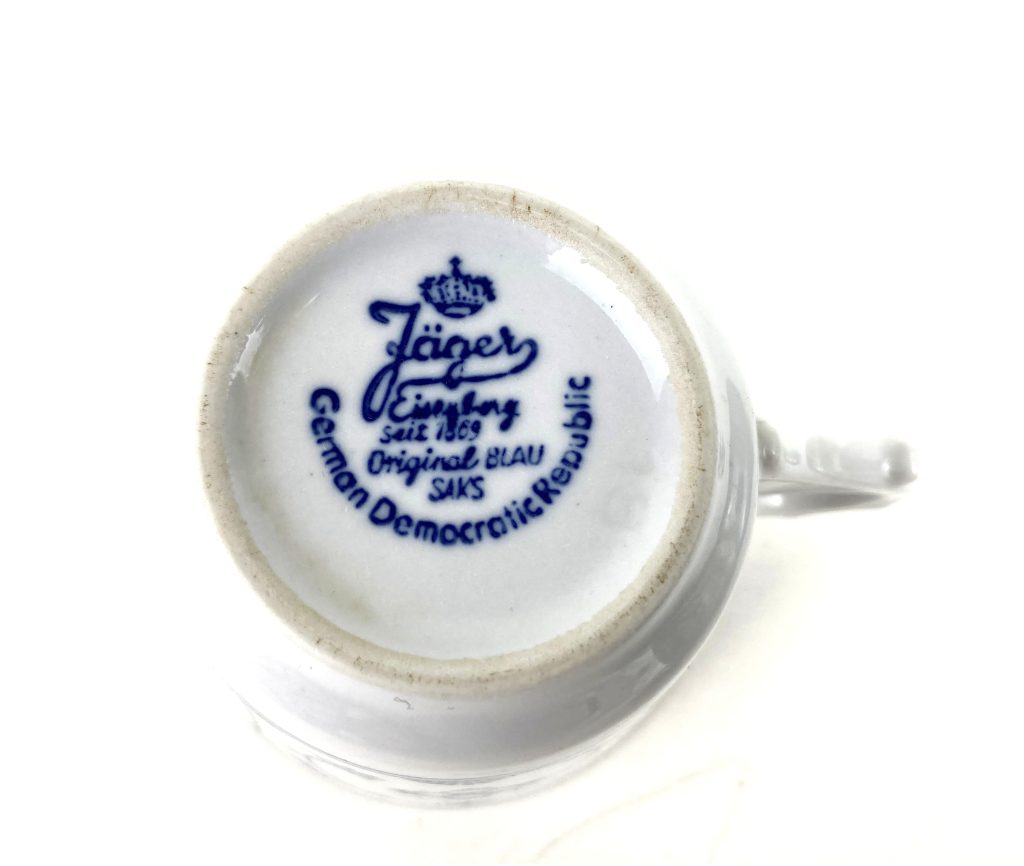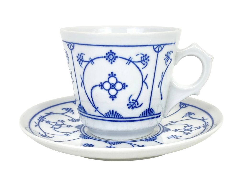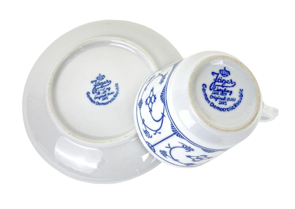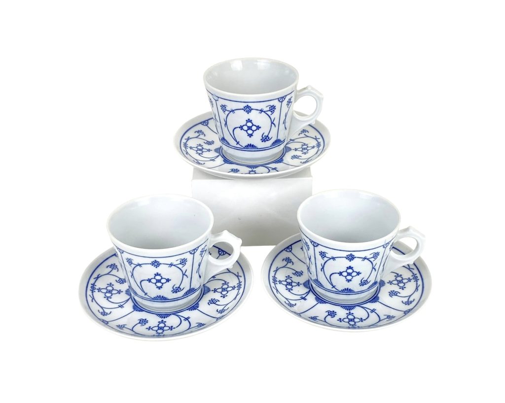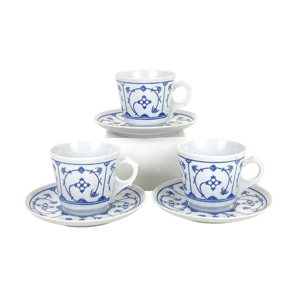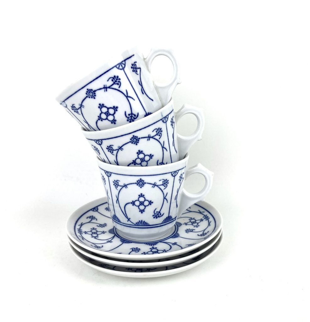 3 Porseleinen koffie kop- en schotels van Jäger Eisenberg. Décor Blau Saks. Afmeting: Kopje: diameter 8 cm, hoog: 7 cm. Schotel: diameter 13 cm. In uitstekende staat.
