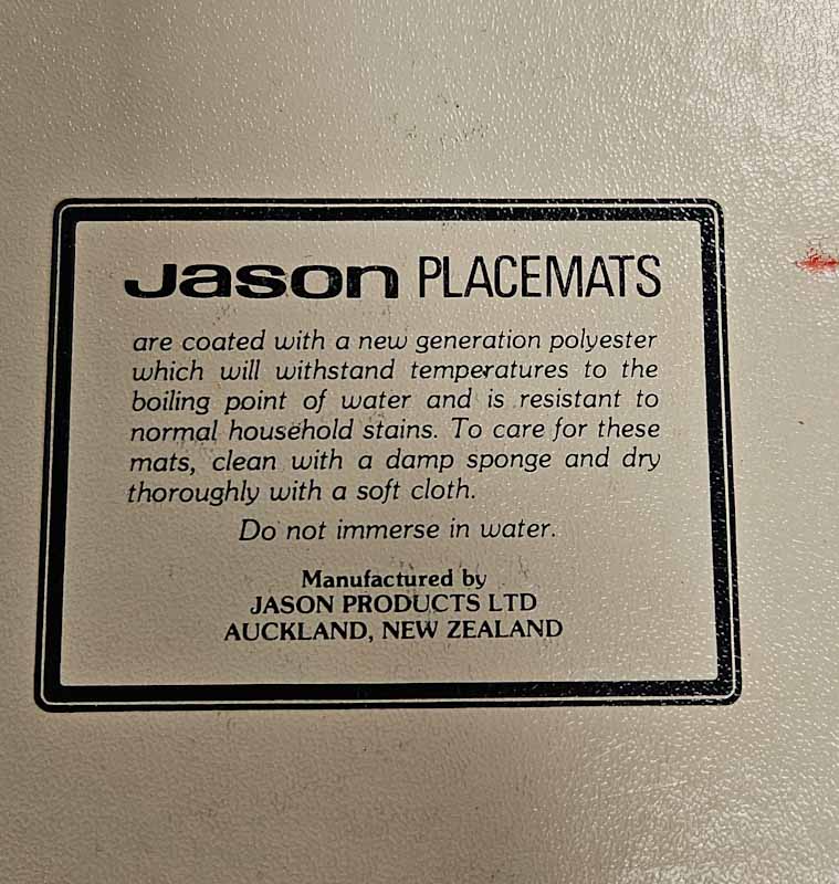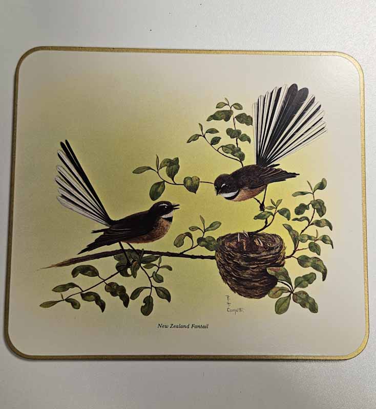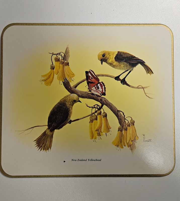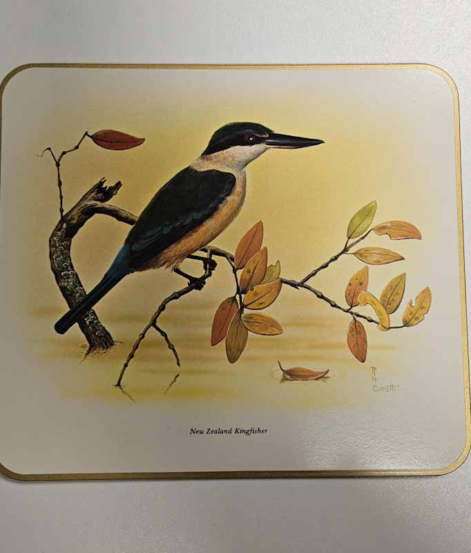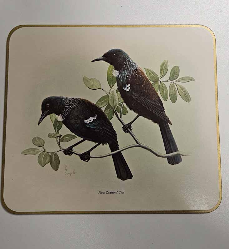 Mooie vintage set van 6 Jason placemats met afbeeldingen van inheemse Nieuw-Zeelandse vogels. De set bevat Tui, Kiwi, Fantail (Pīwakawaka), Wood Pigeon (Kererū), Yellowhead (Mohua) en Kingfisher (Kōtare).