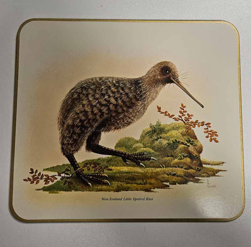 Vintage set van 6 Jason placemats met Nieuw-Zeelandse vogels (Tui, Kiwi, Fantail, Pigeon, Yellowhead, Kingfisher). Gemaakt door Jason Products in de jaren ’70/’80.