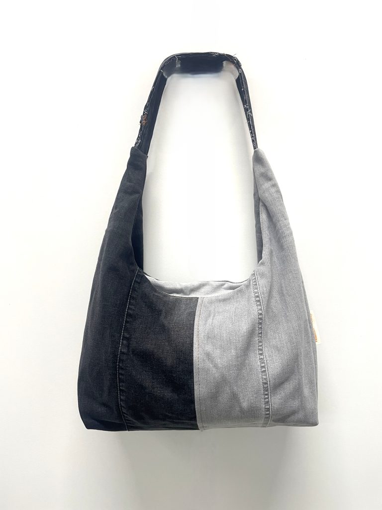 Deze handige en modieuze schoudertas is samengesteld uit opnieuw gebruikte verschillende stukjes zwarte jeansstof, hierdoor kan jouw tas dus net iets anders zijn dan op de foto.