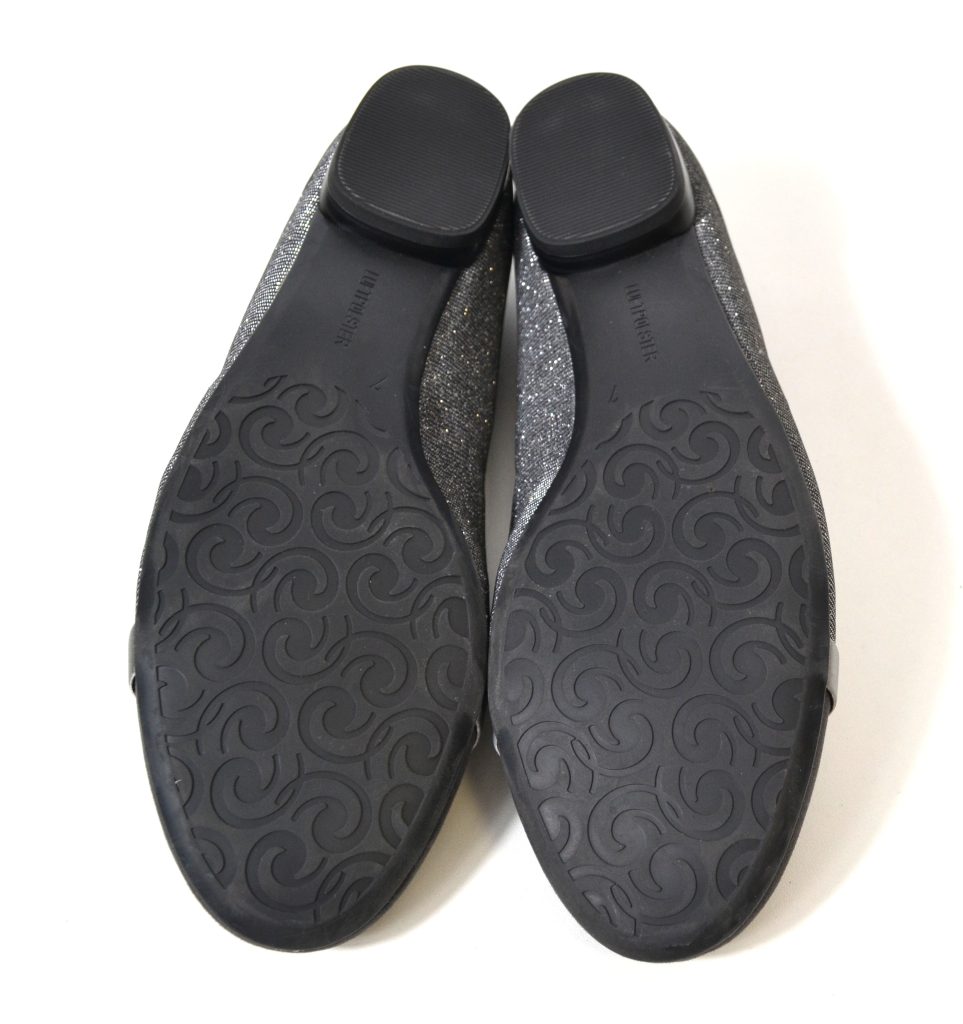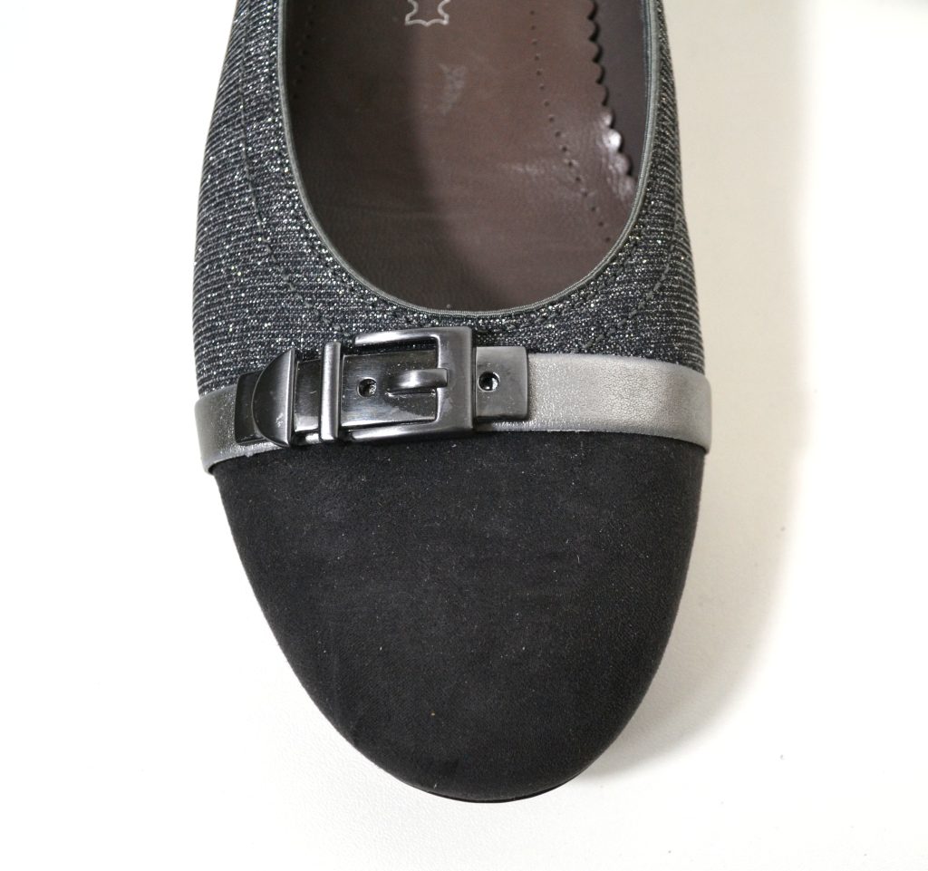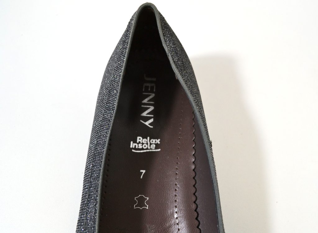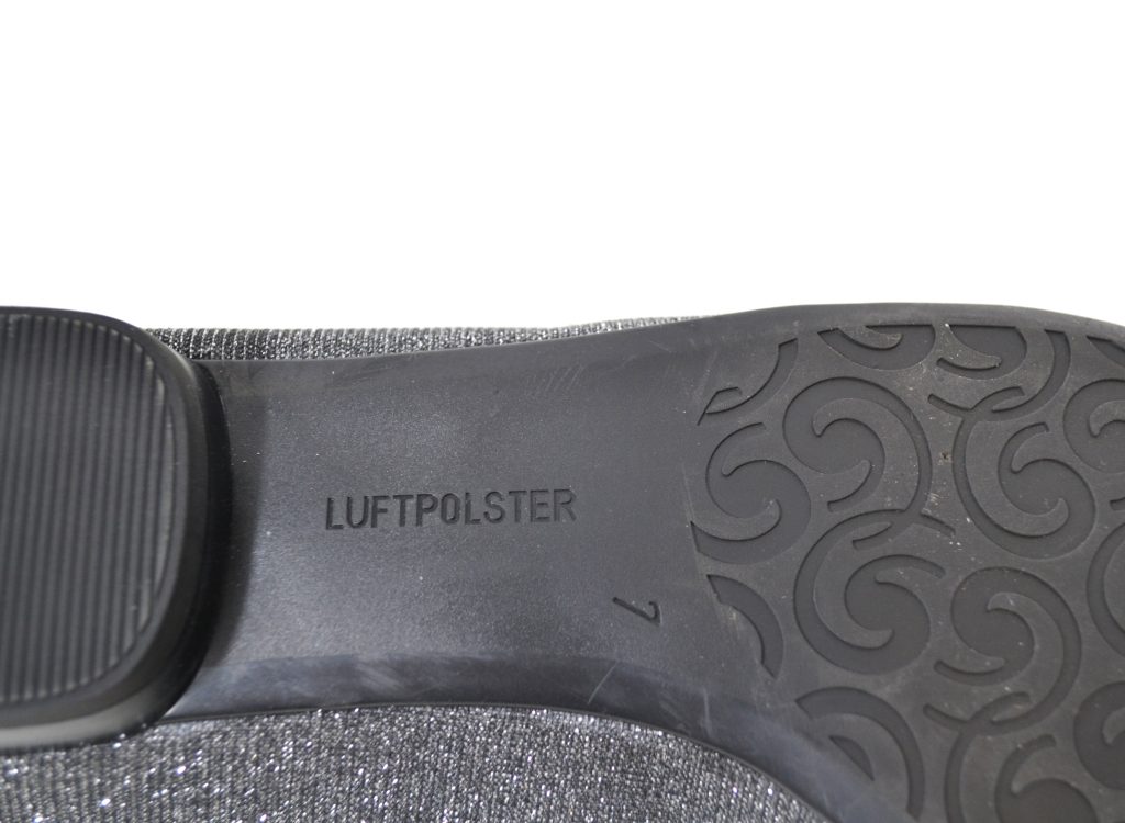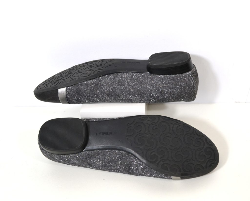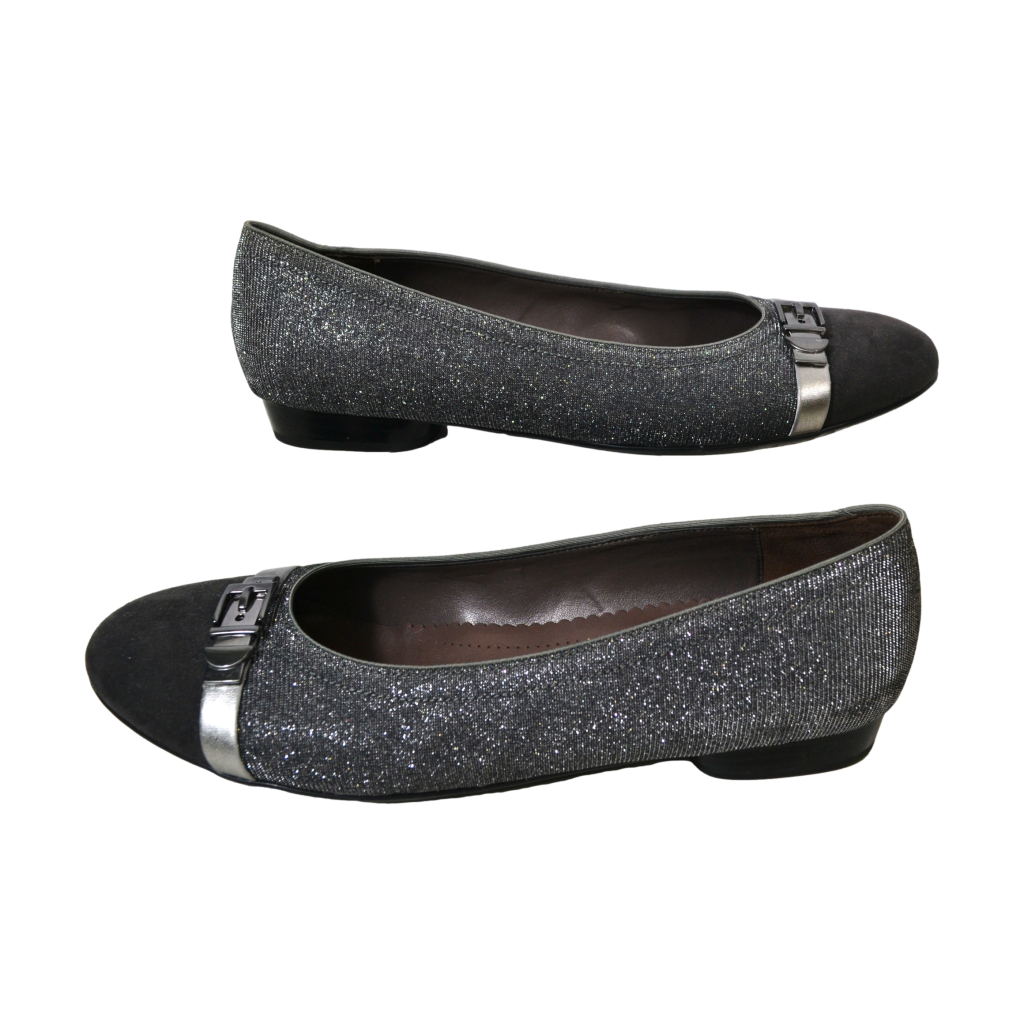 Met luftpolster zool. Suède grijze neus en glitter zilveren stof met leer gevoerde zijkanten.