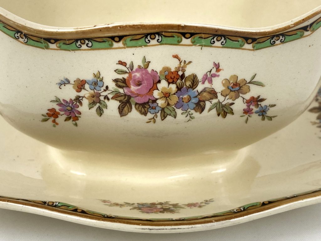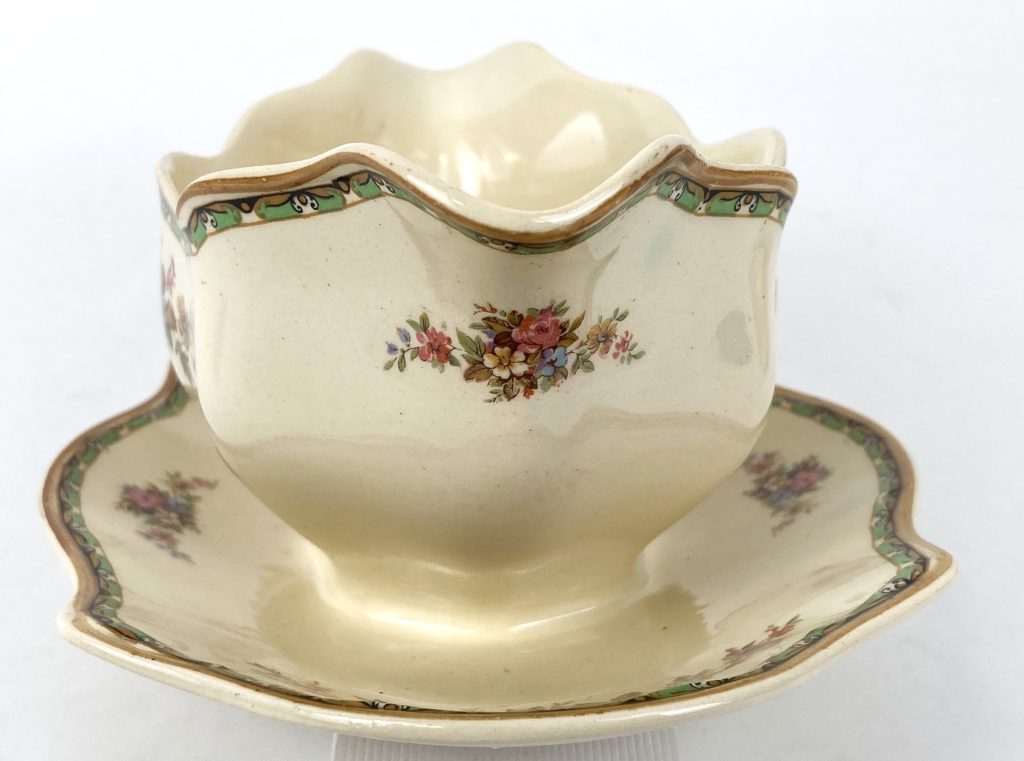 In crème met bloemmotief en groen met goud randje. Gemerkt aan onderzijde.