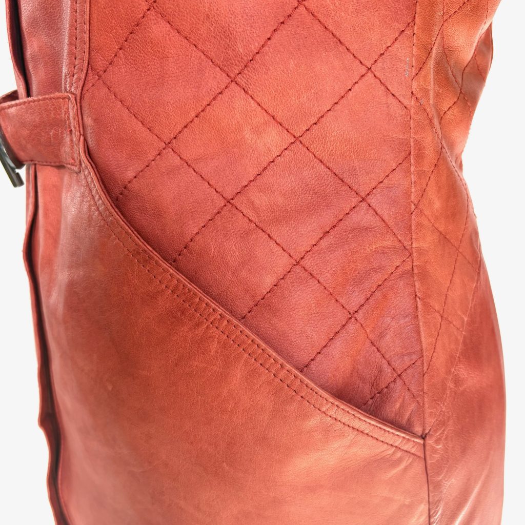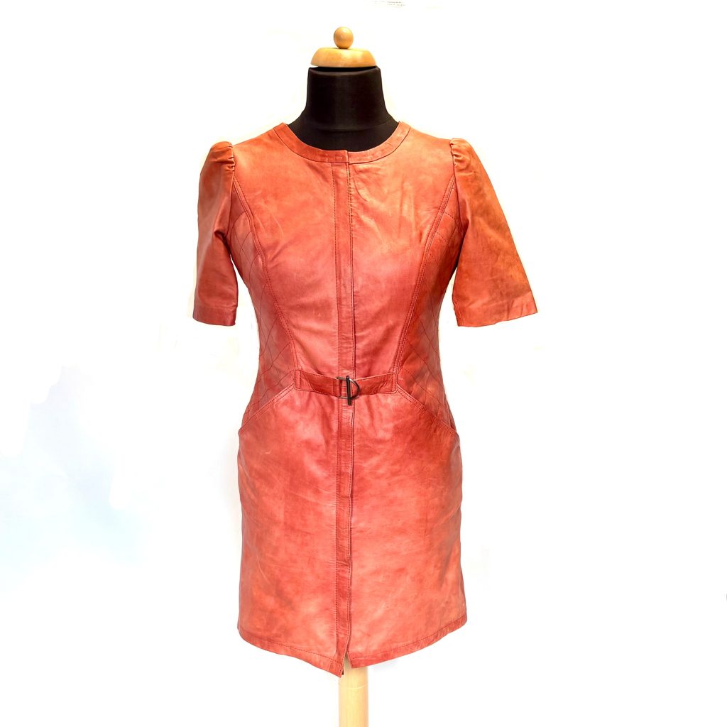 Deze prachtige leren jurk combineert een elegante snit met een warme, rijke kleur. De jurk straalt klasse uit en past perfect bij laarzen of hakken.