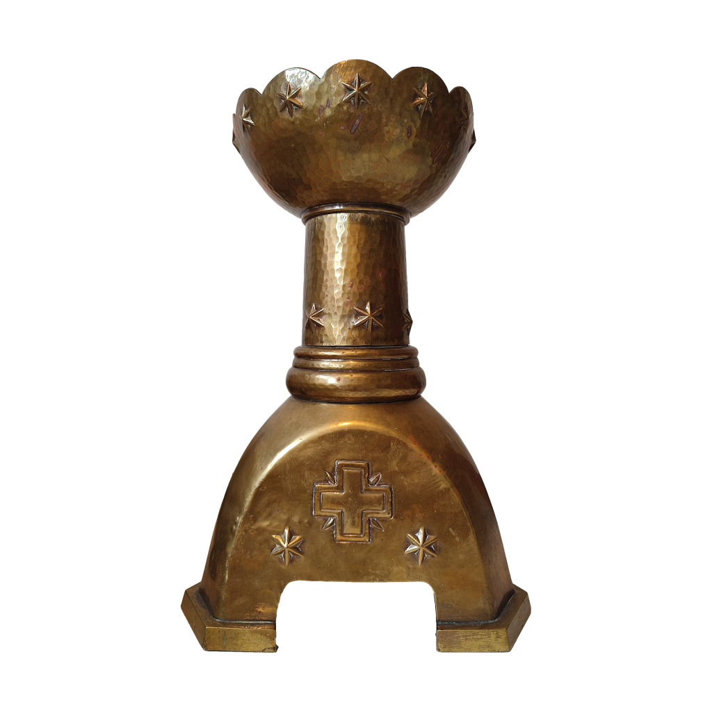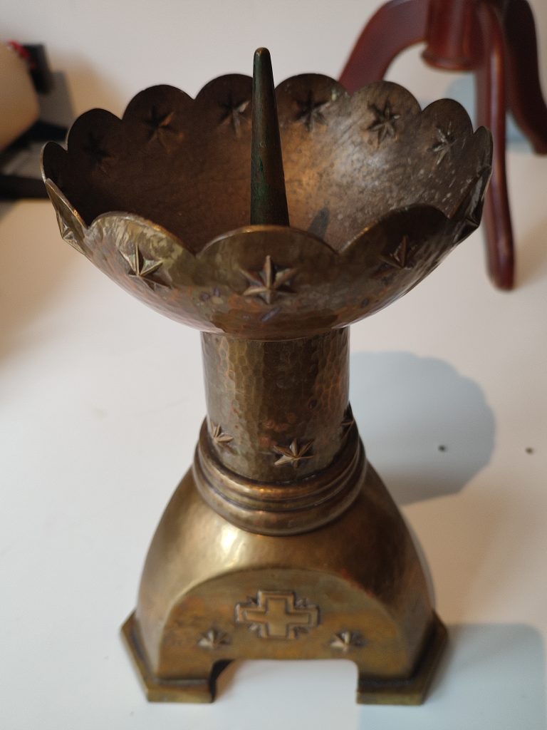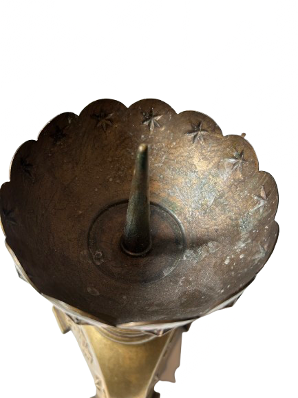 De vintage kandelaar  is afkomstig uit een kerk. Enkel geschikt voor brede kaarsen. Denk hierbij aan de dikte van een doopkaars.