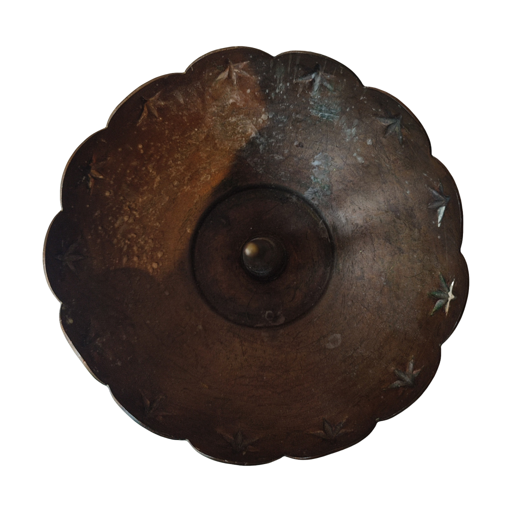Deze robuuste kandelaar staat op drie poten en heeft een geschulpte opstaande schaalvormige bovenkant. De doorsnede van de kelk is 14 cm.