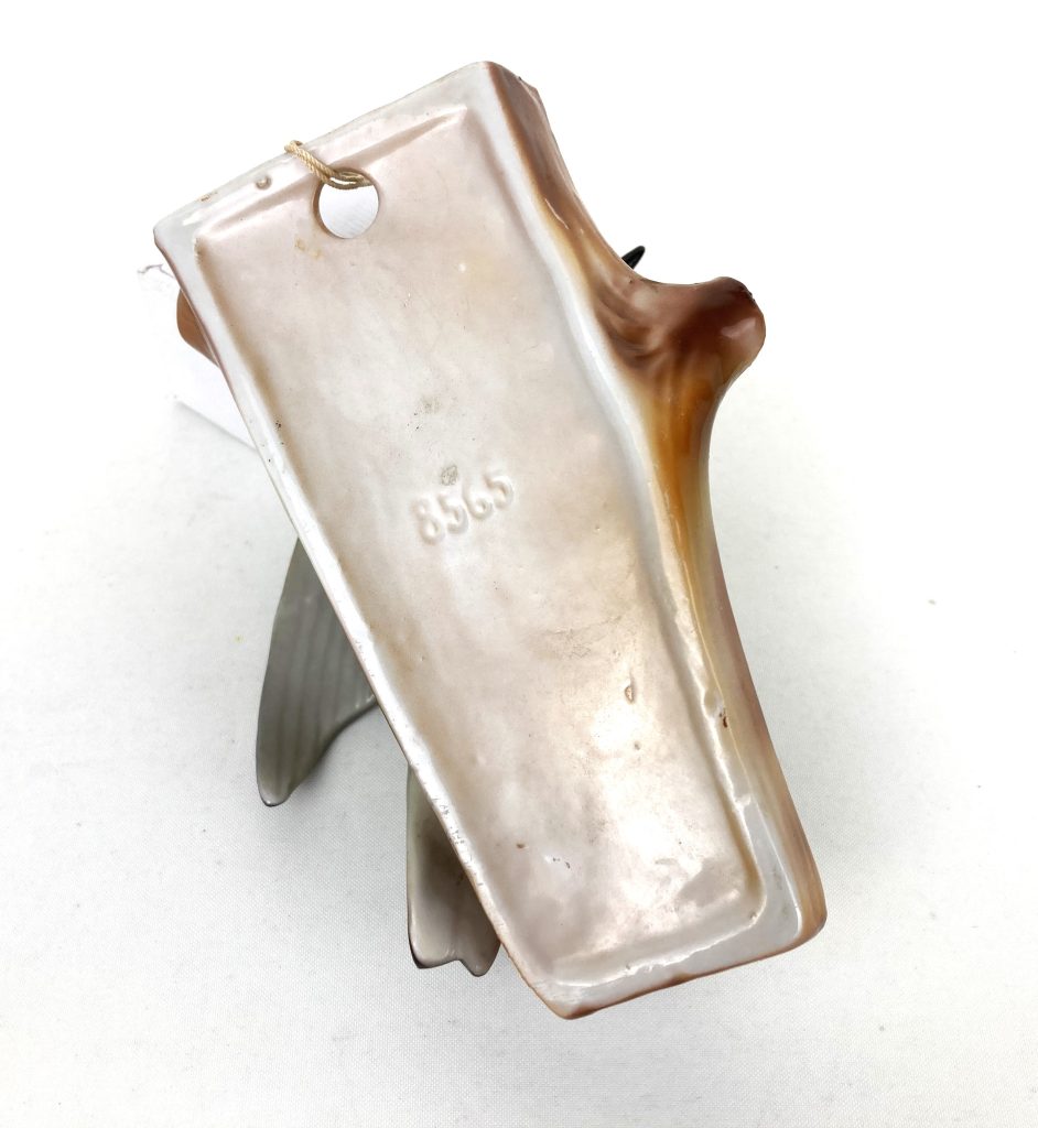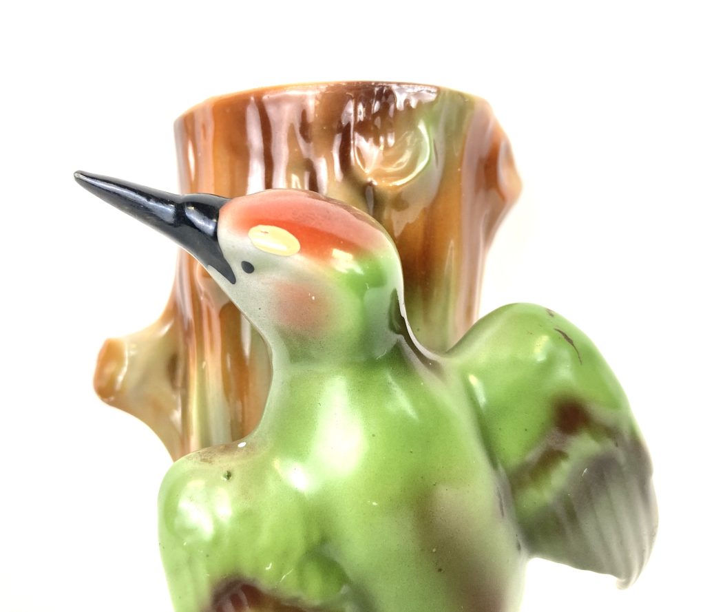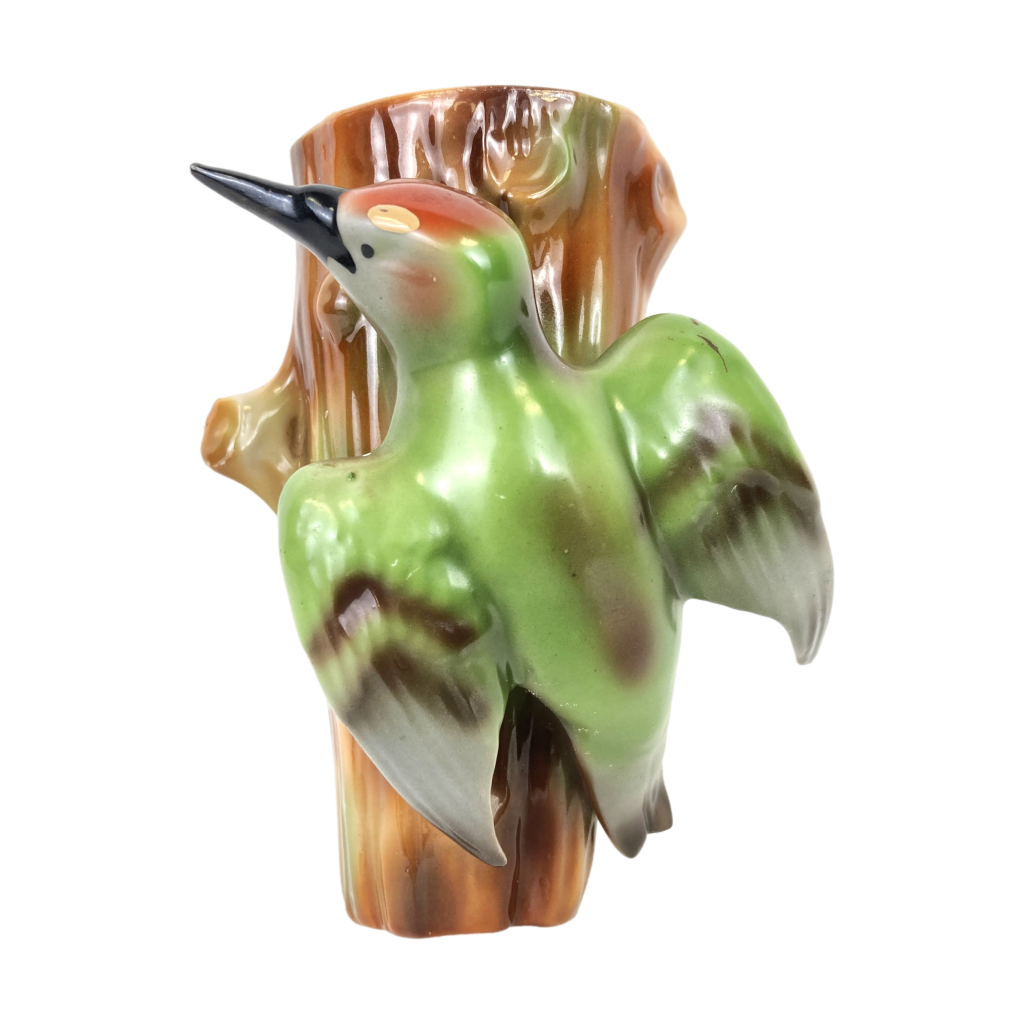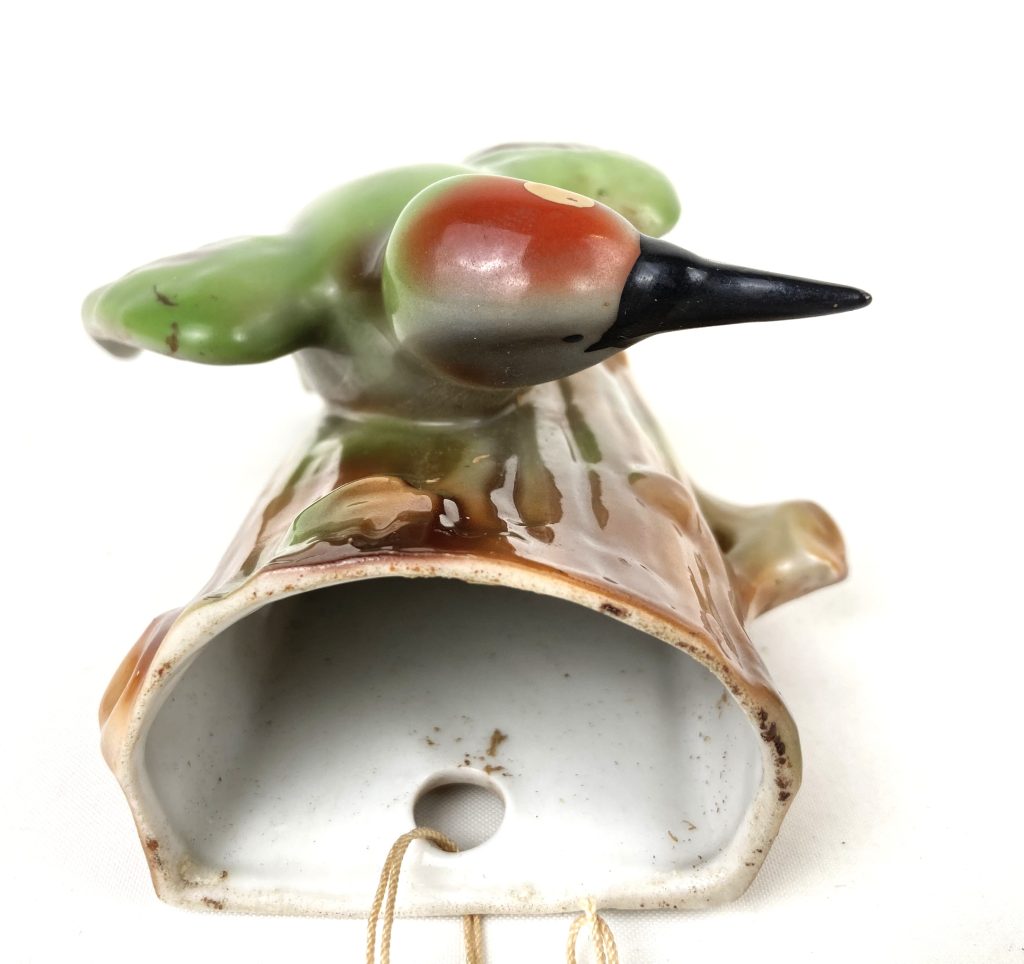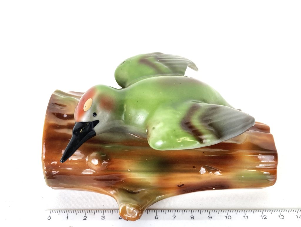 Keramieken vintage muurhanger met groene specht op boomstam. Genummerd: 8565. Vermoedelijk gemaakt in Tsjechië. Hoog: 12,5 cm. Breed: ca. 10 cm. In prachtige staat. Zonder beschadigingen.