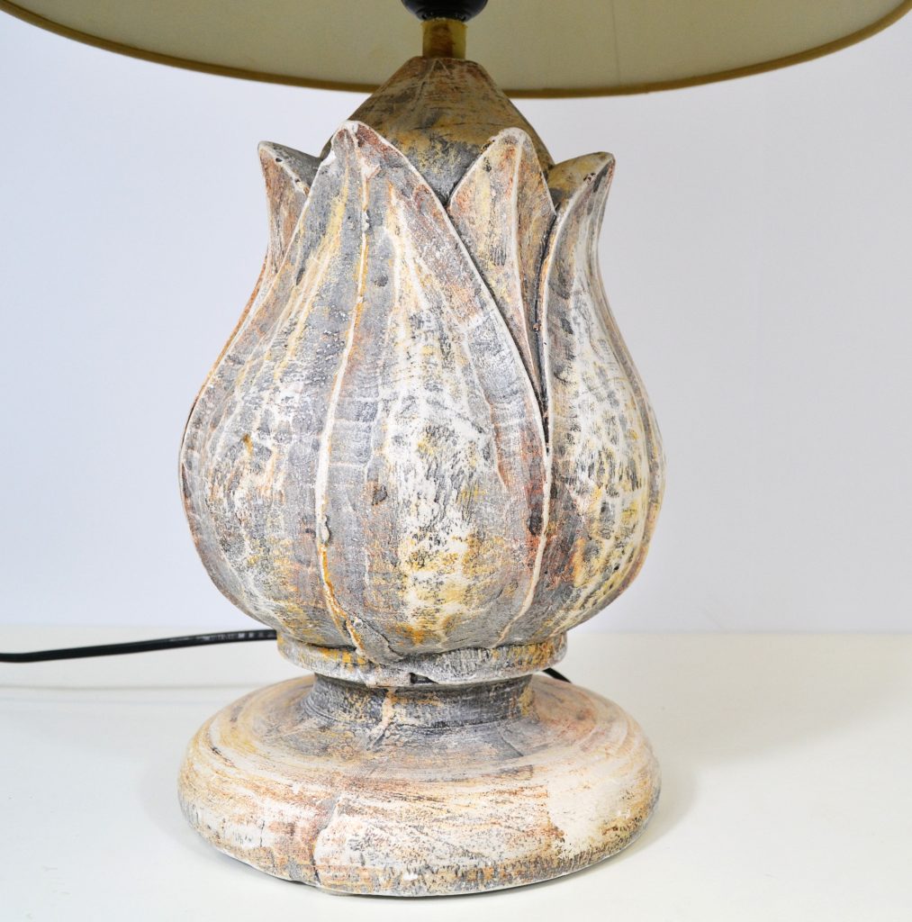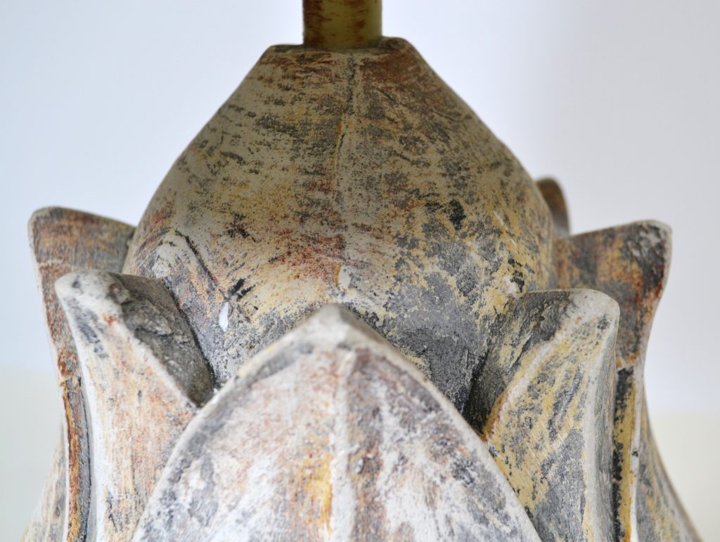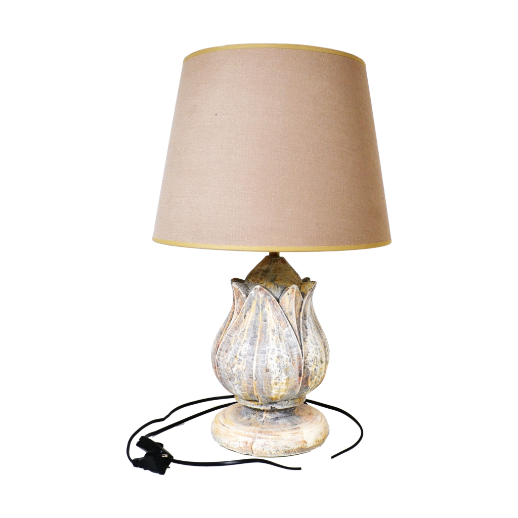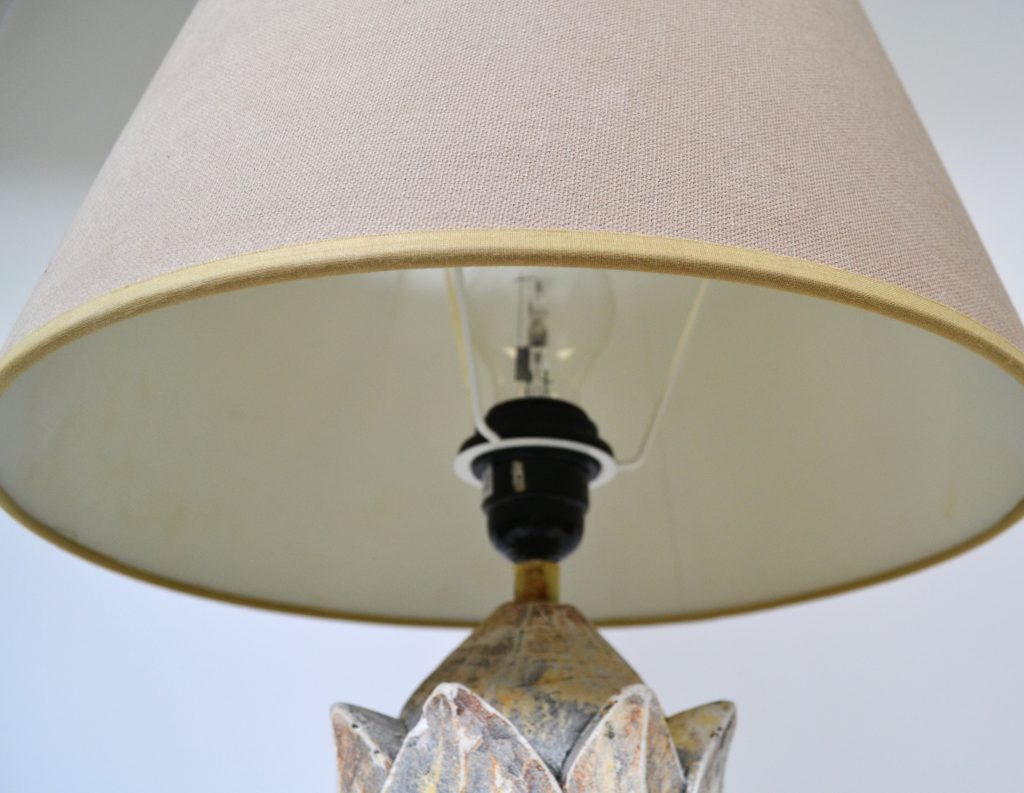 Zware keramieken tafellamp in bijzondere tulpvorm. Met ecru-kleurige stoffen kap.