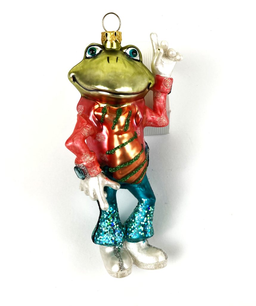 5 Kleurige Kerst ornamenten fun glas c.q. Kerstboom hangers in de vorm van een draak, clown, winkelwagen, 2x kikker en schaap. Mondgeblazen en handbeschilderd. Nieuwprijs: ca. 20,00/st.