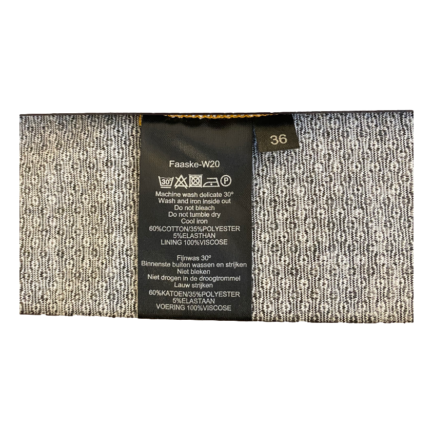 - Bovenzijde stof: 60% katoen, 35% polyester, 5% elastan - Binnenzijde tegenvoering stof: 100% viscose