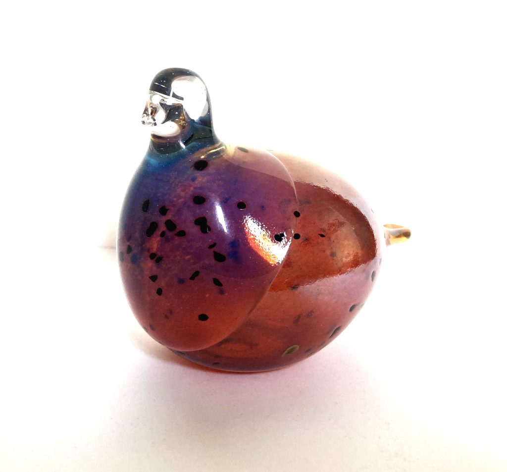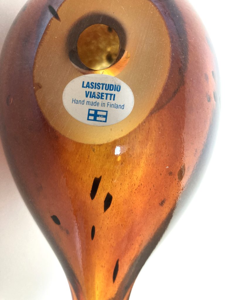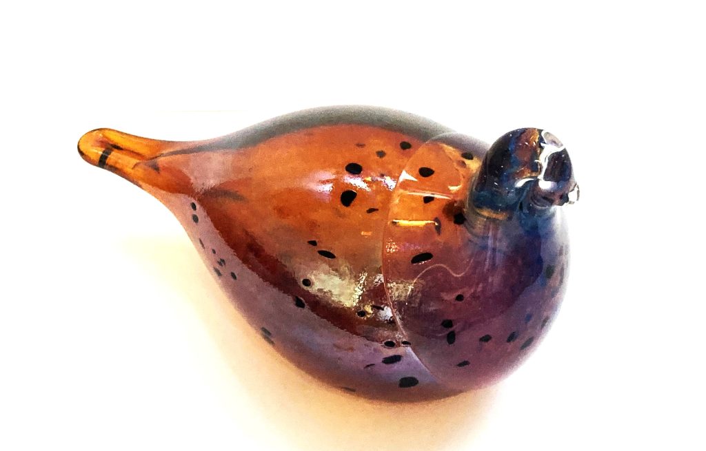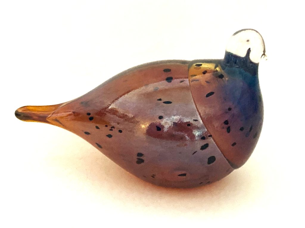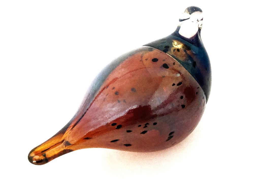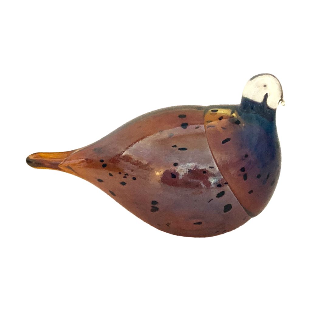 Handgemaakte glazen vogel. Merk: Lasistudio Viasetti (Finland). In glanzend lichtbruin met zwarte vlekjes. Aan onderzijde gemerkt. In prachtige staat.