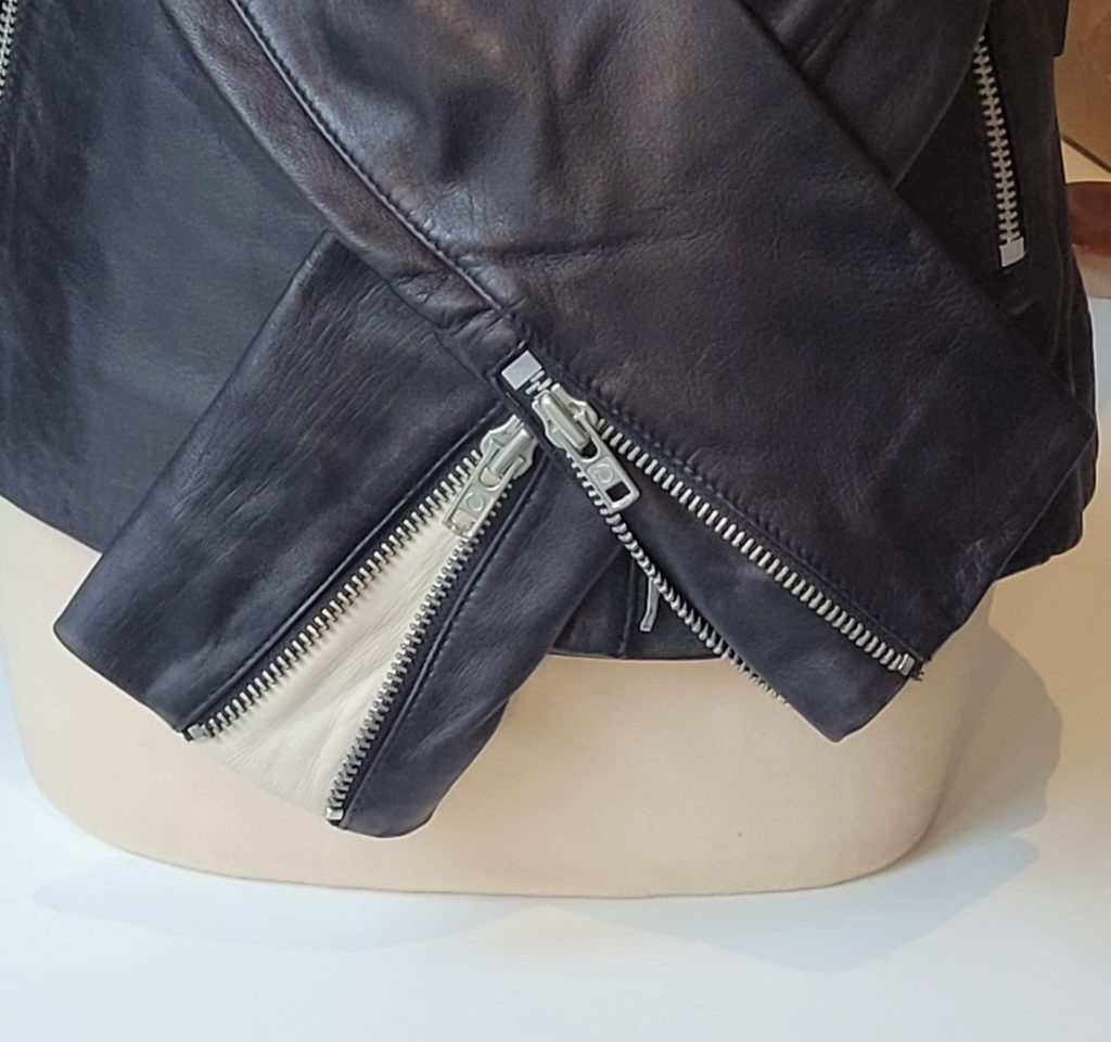 Dames jack van schapenleer,  met deelbare rits, 1 manchet binnenkant wit, andere manchet zwart – voering 52% polyester en 48% viscose