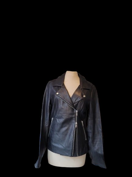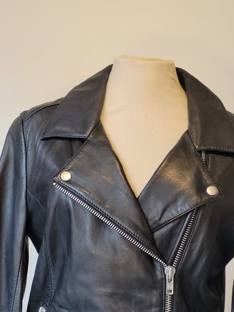 Biker style leather jacket with metal hardware, zip pockets and slightly oversized shape for a rebellious look.