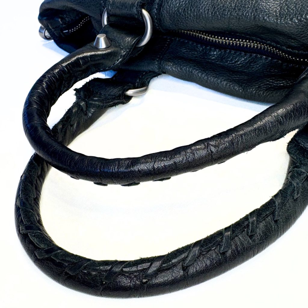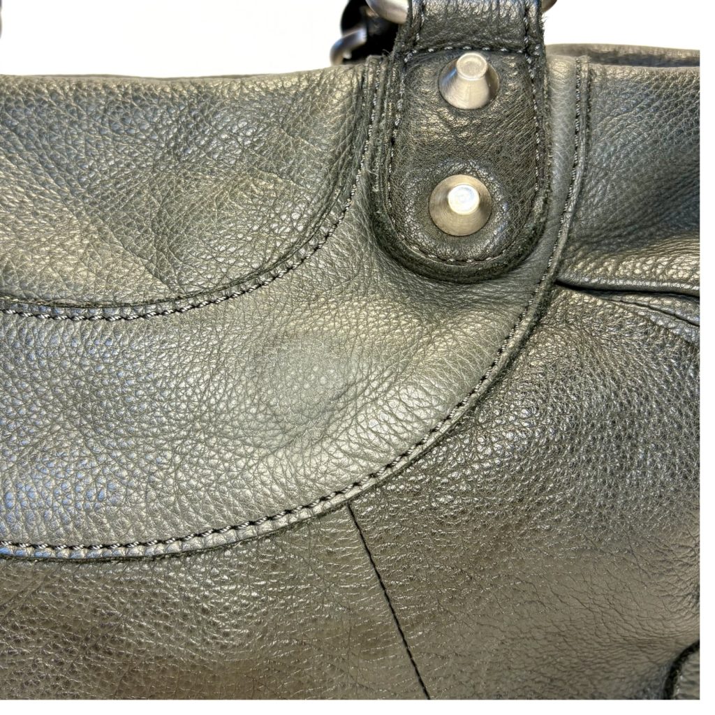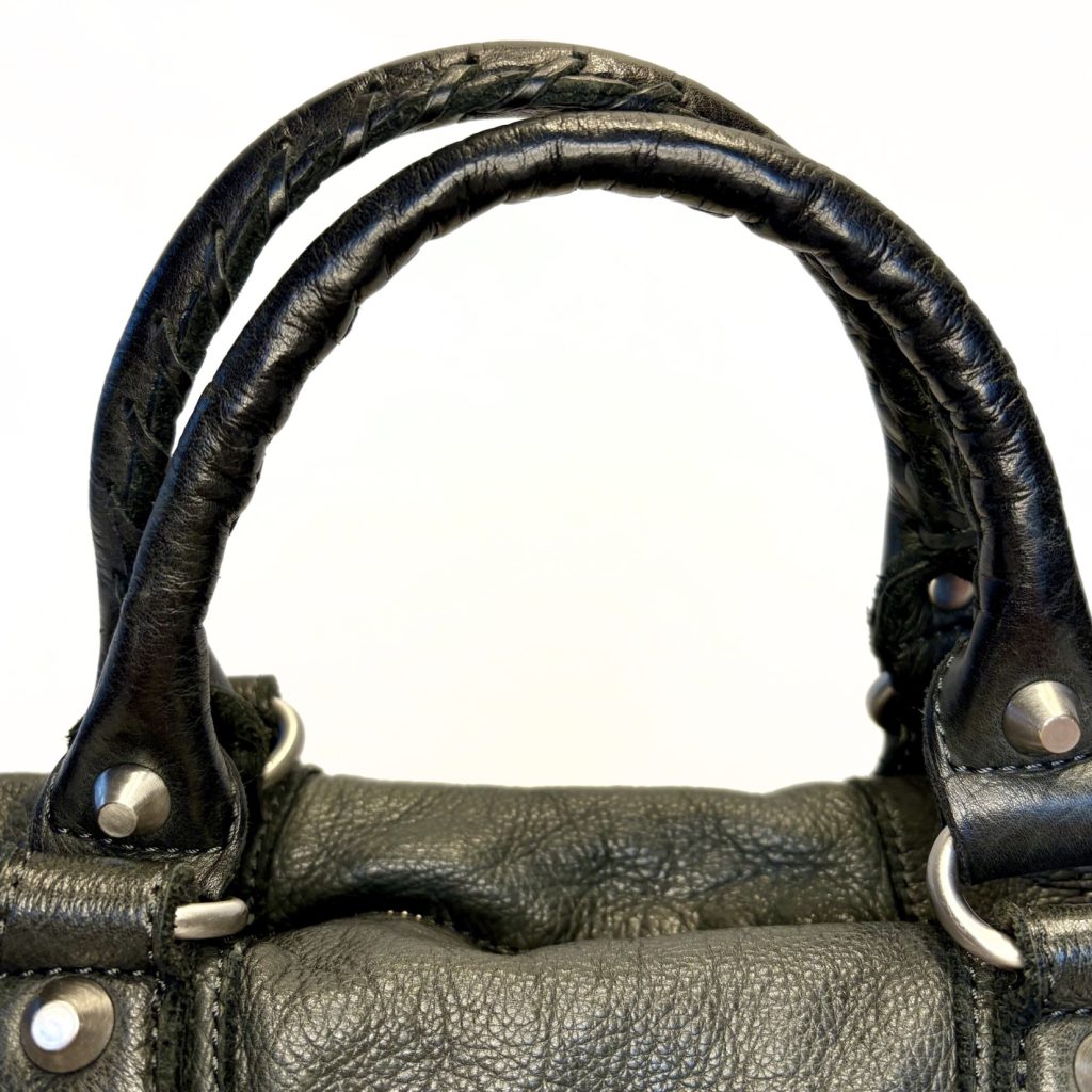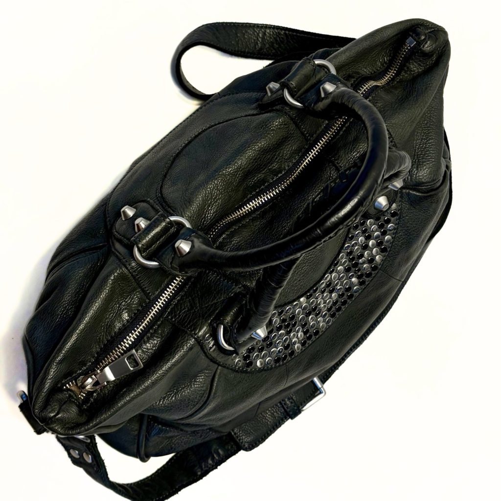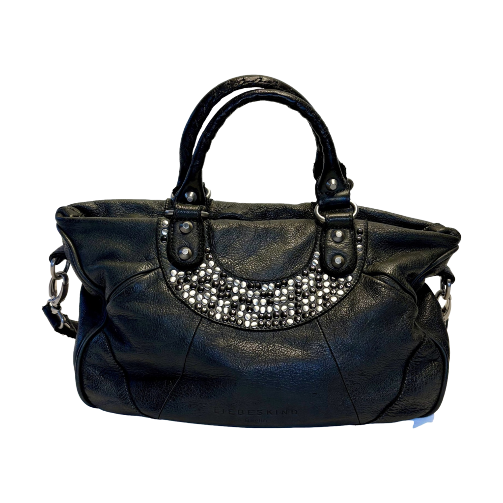 De bovenrand is versierd met zilveren en zwarte studs in een strak patroon. Dat geeft de tas een edgy, bijna rock‑chic vibe zonder overdreven te worden.