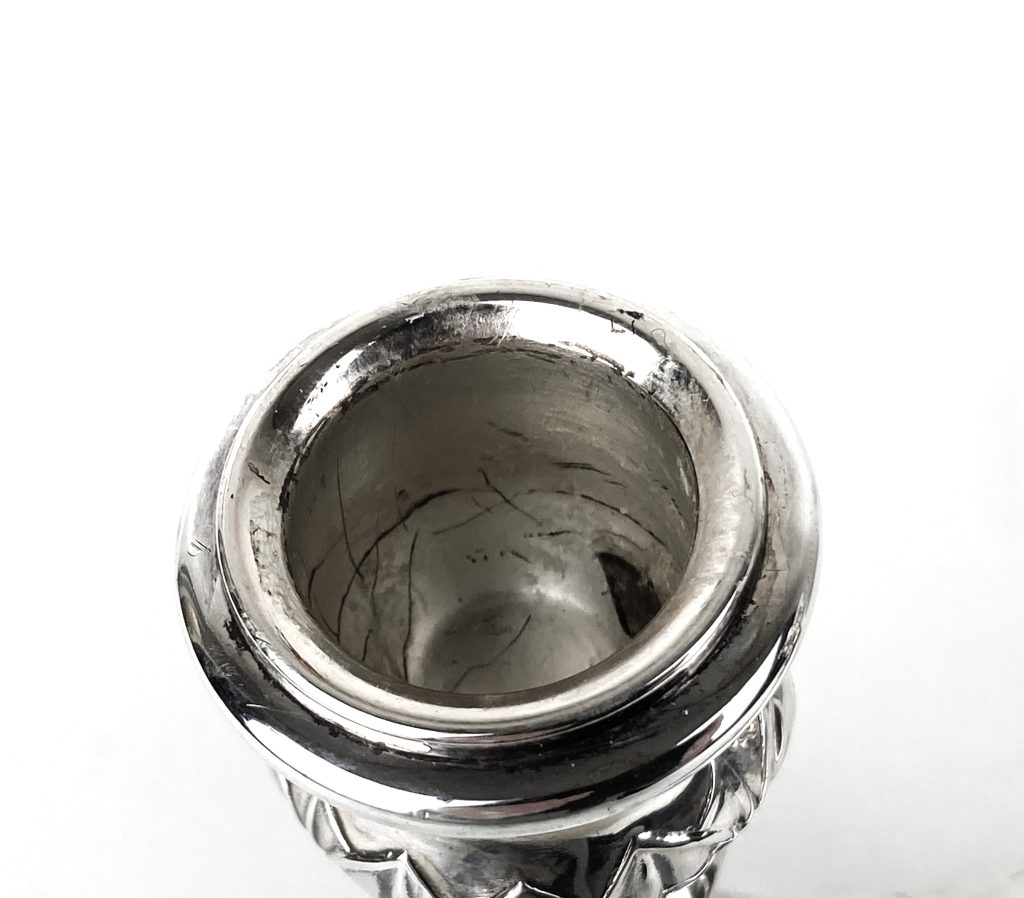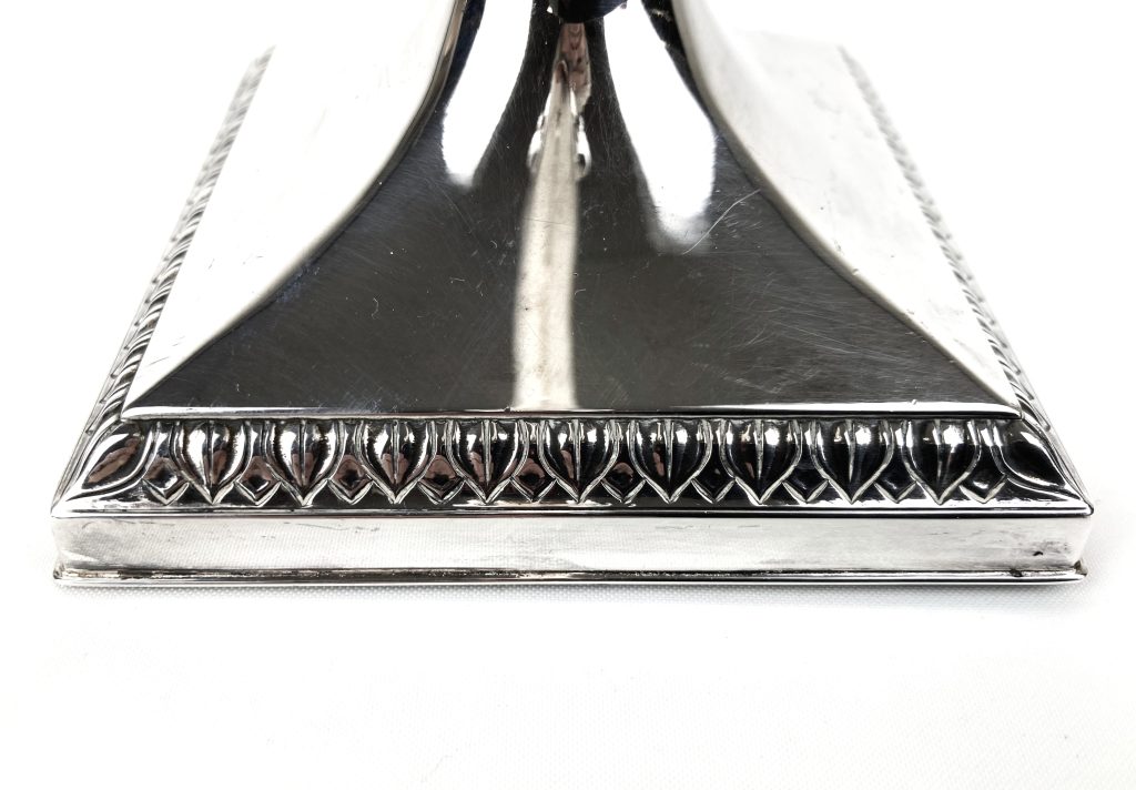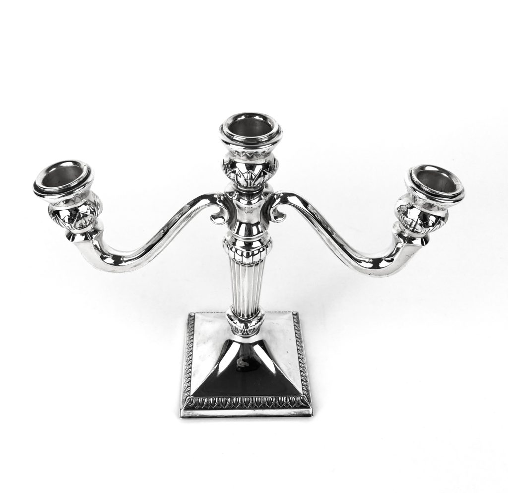 De kandelaar staat op een vierkante voet met een bladrand en heeft een conische, gecanneleerde schacht. Aan de schacht zitten twee sierlijke, gebogen armen met drie vaasvormige kaarsenhouders, versierd met een bladmotief. De voet is 9,5 bij 9,5 cm.