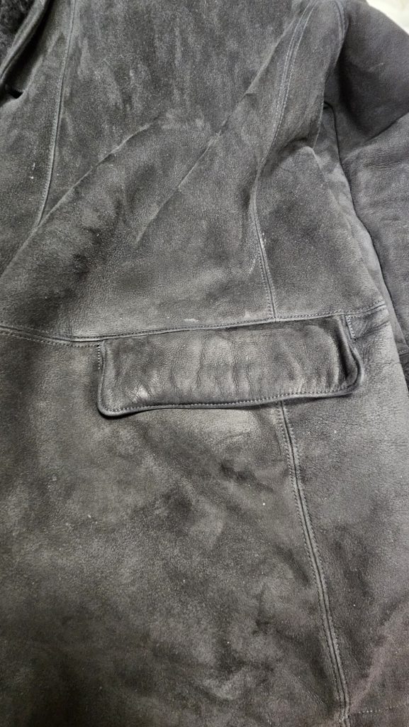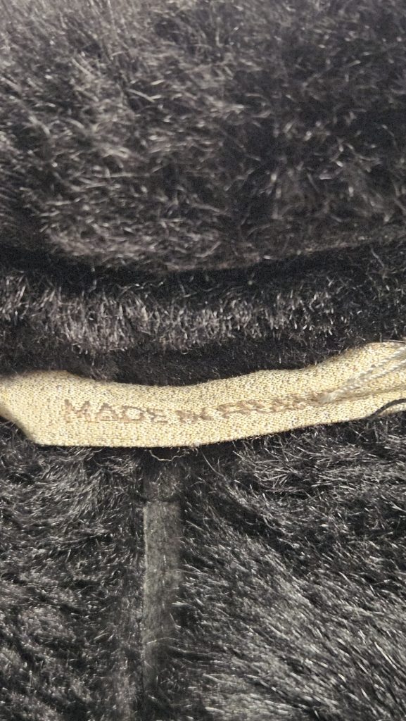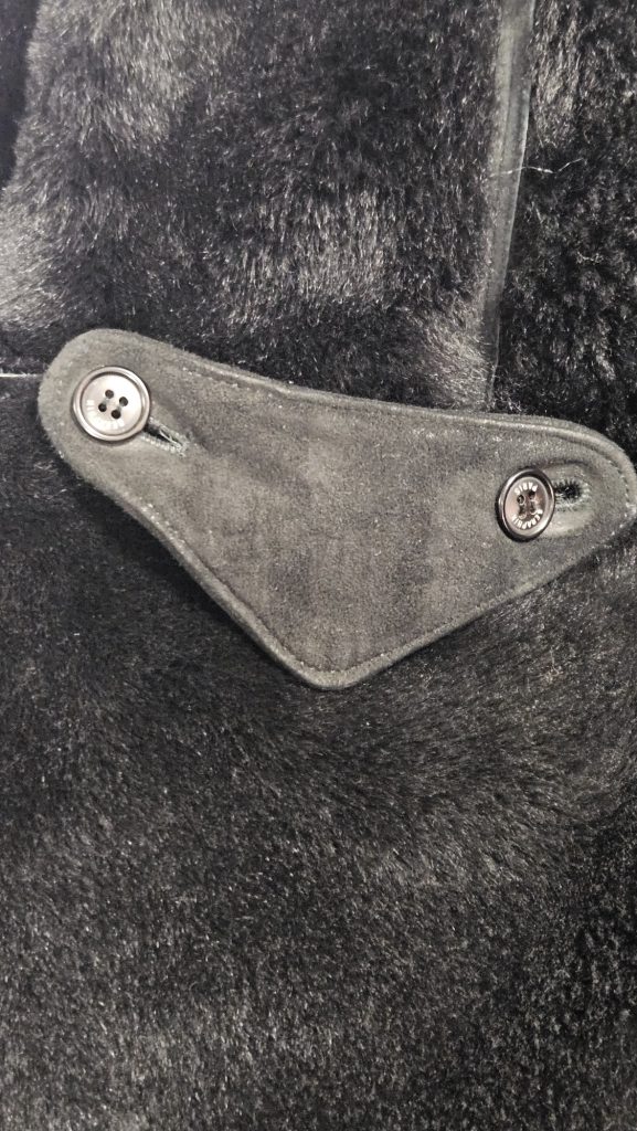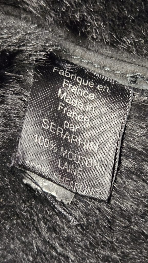Exclusieve zwarte jas van het Franse luxemerk Seraphin, gemaakt van echte schapenvacht (mouton laine) – luxe, warmte en tijdloze klasse