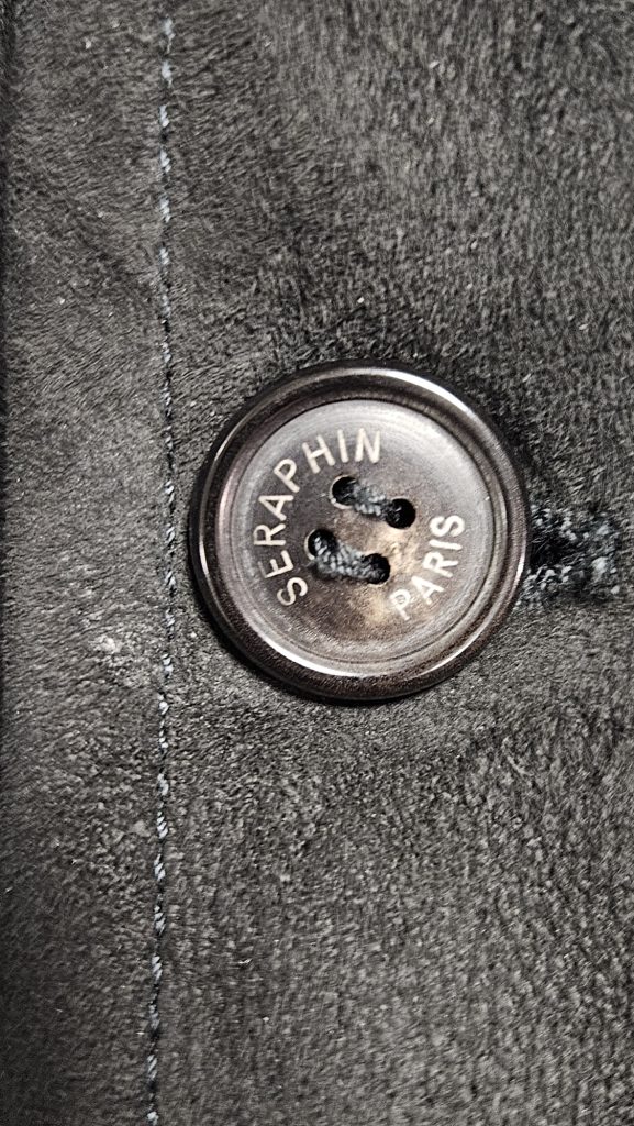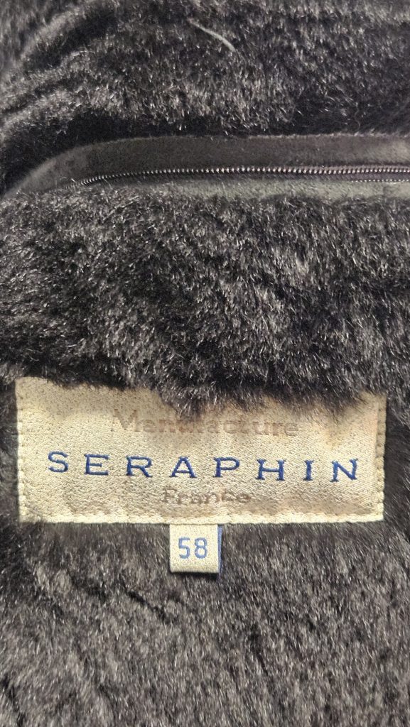 Exclusieve zwarte jas van het Franse luxemerk Seraphin, vervaardigd van 100% mouton laine (echte schapenvacht met wol). Dit hoogwaardige materiaal biedt natuurlijke warmte, comfort en een luxe uitstraling. De jas is voorzien van mooie details zoals knopen, zakken en kraag – made in France.