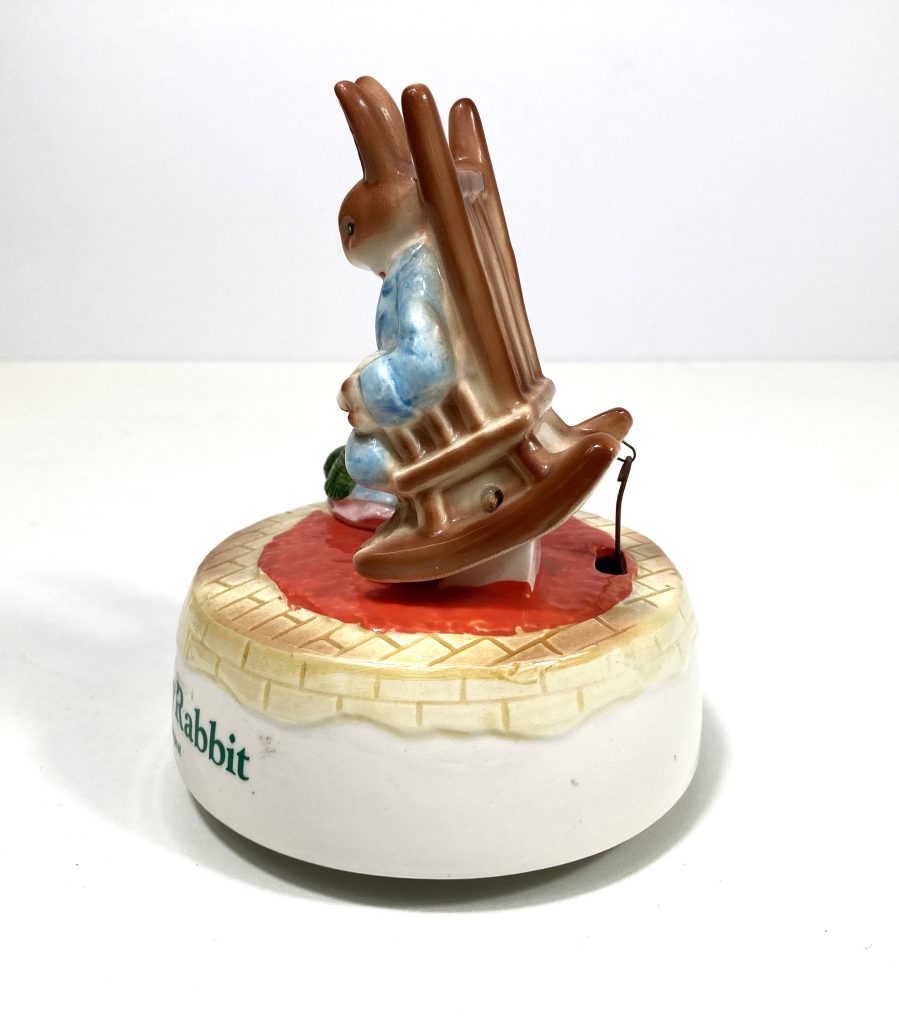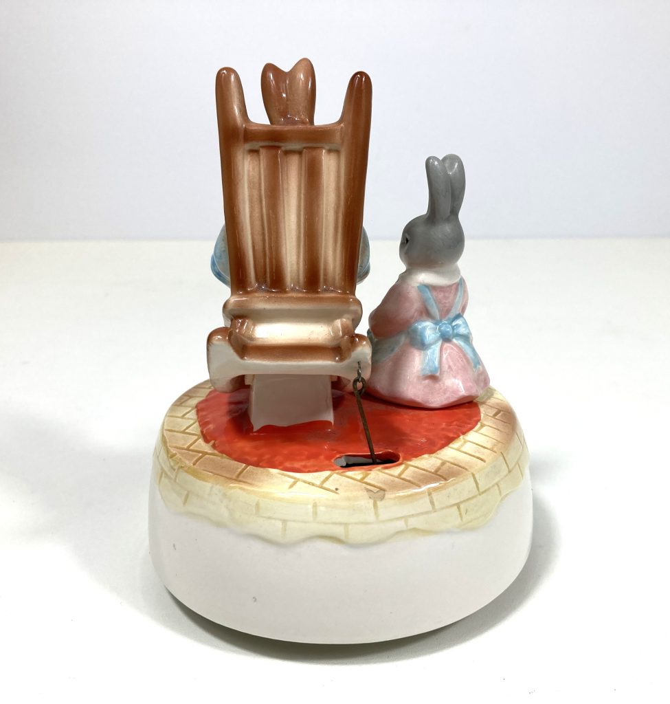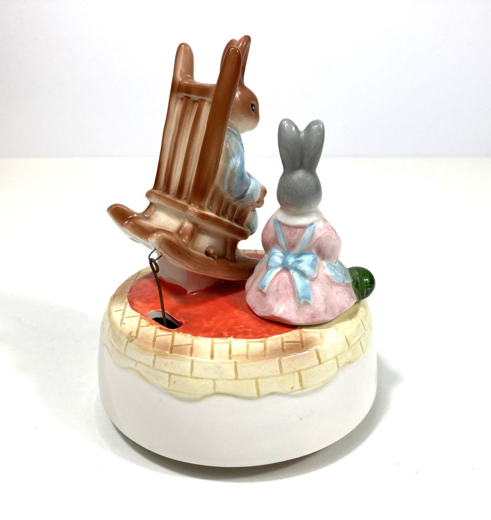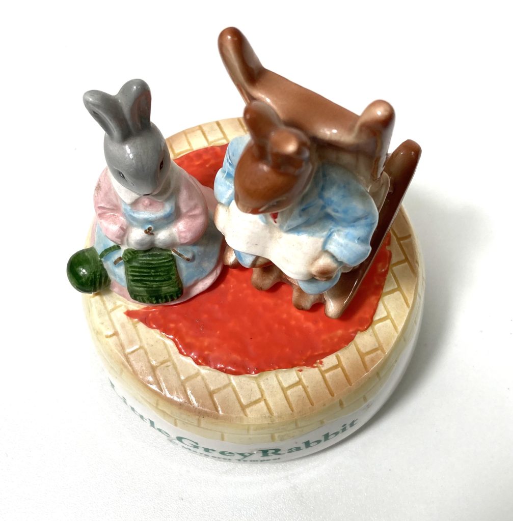 Vintage porseleinen muziekdoosje “Little Grey Rabbit” door Margaret Tempest. Gemaakt in Japan. Met muziekje “Home Sweet Home”. Met 2 haasjes waarvan de één breiend en de ander een boek lezend op een bewegende schommelstoel. Na opwinden draait tevens het geheel en komt er muziek uit.