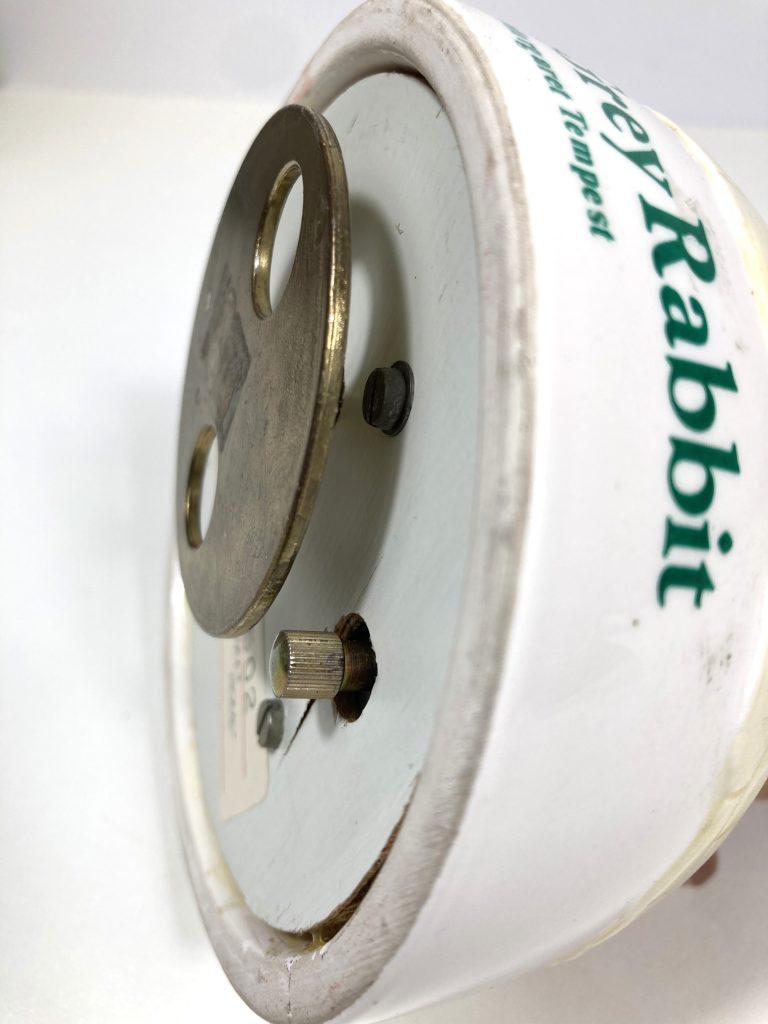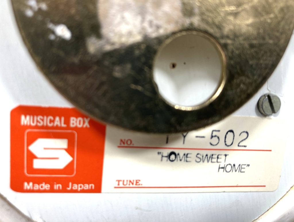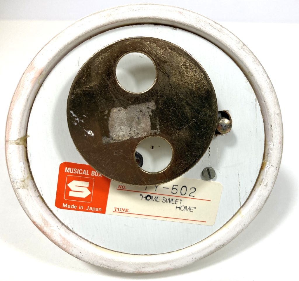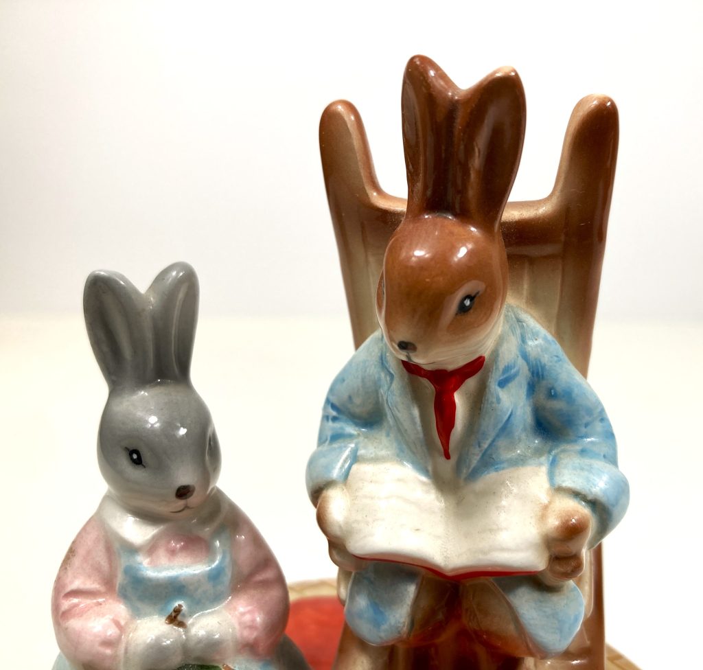 Vintage porseleinen muziekdoosje “Little Grey Rabbit” door Margaret Tempest. Gemaakt in Japan. Met muziekje “Home Sweet Home”. Met 2 haasjes waarvan de één breiend en de ander een boek lezend op een bewegende schommelstoel. Na opwinden draait tevens het geheel en komt er muziek uit.