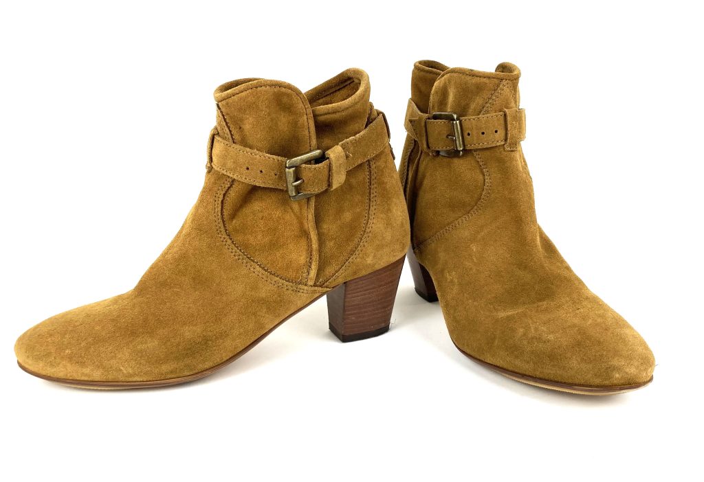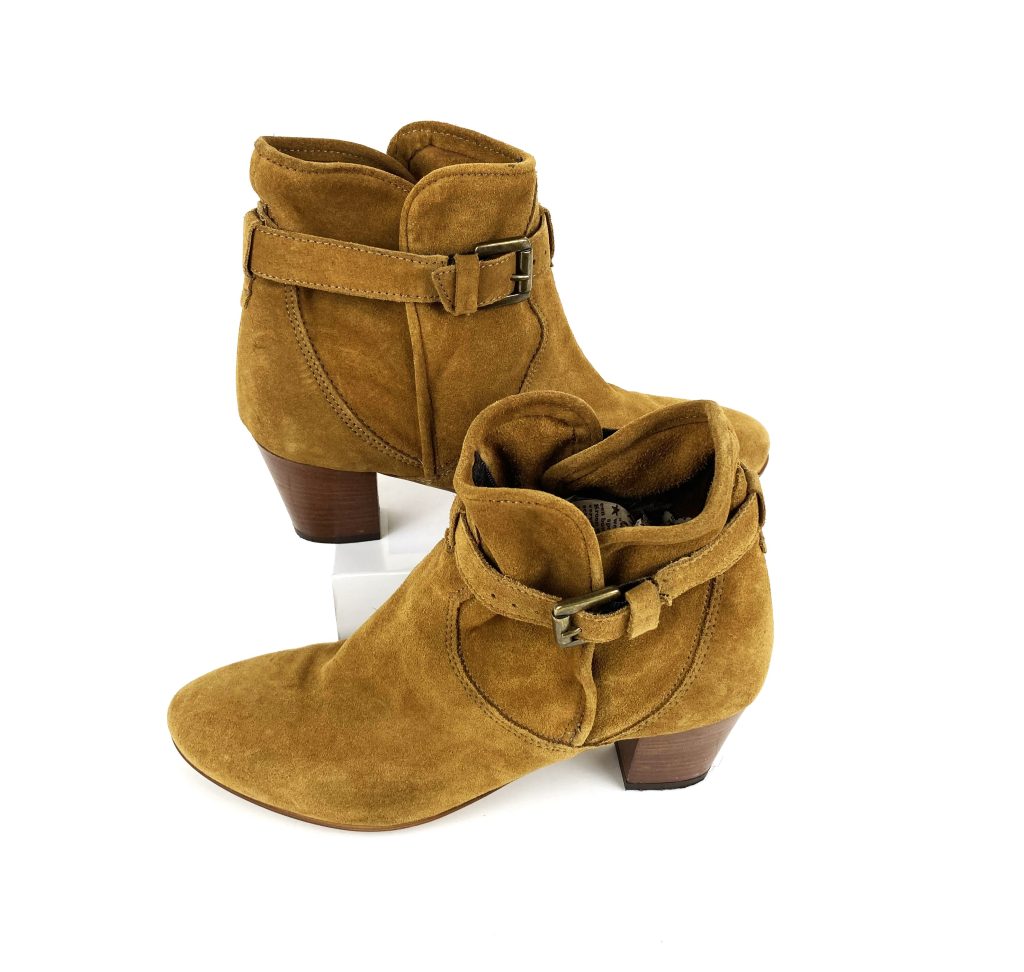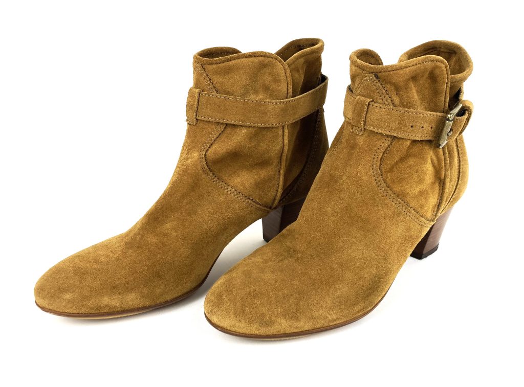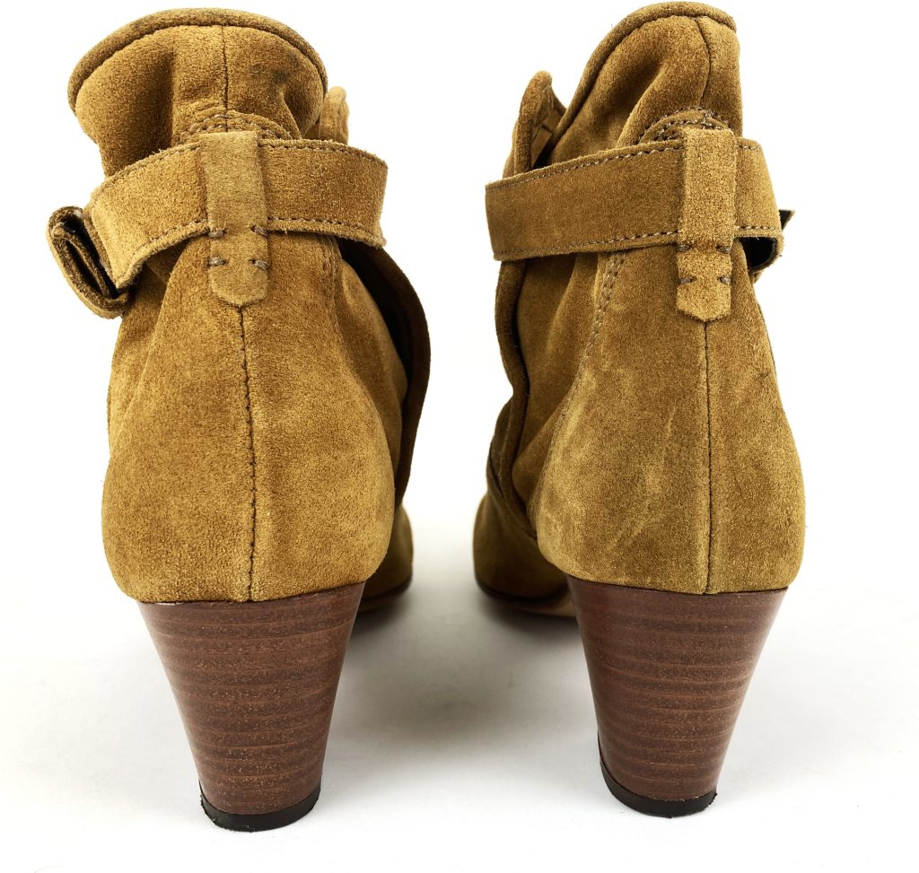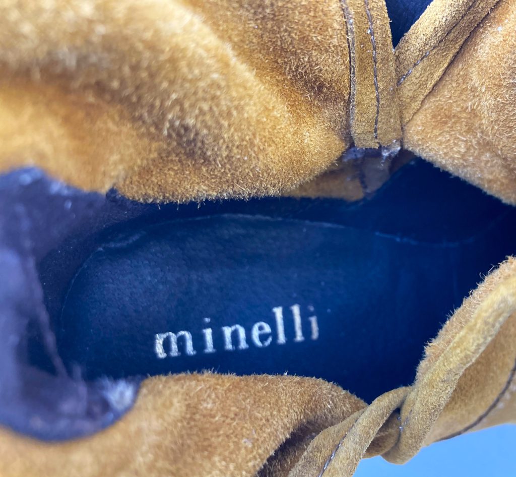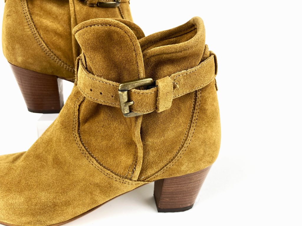 Mosterd gele suède dames enkellaarsjes. Merk: Minelli.