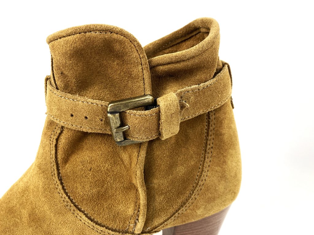 Met riempje en bruine hak.