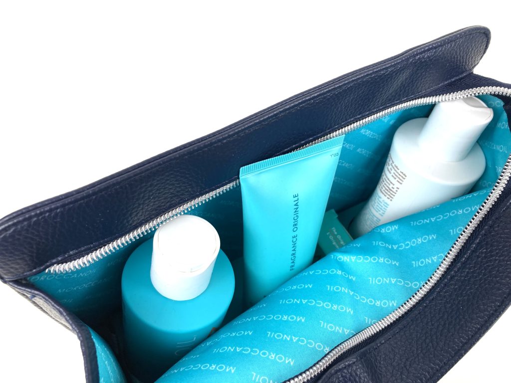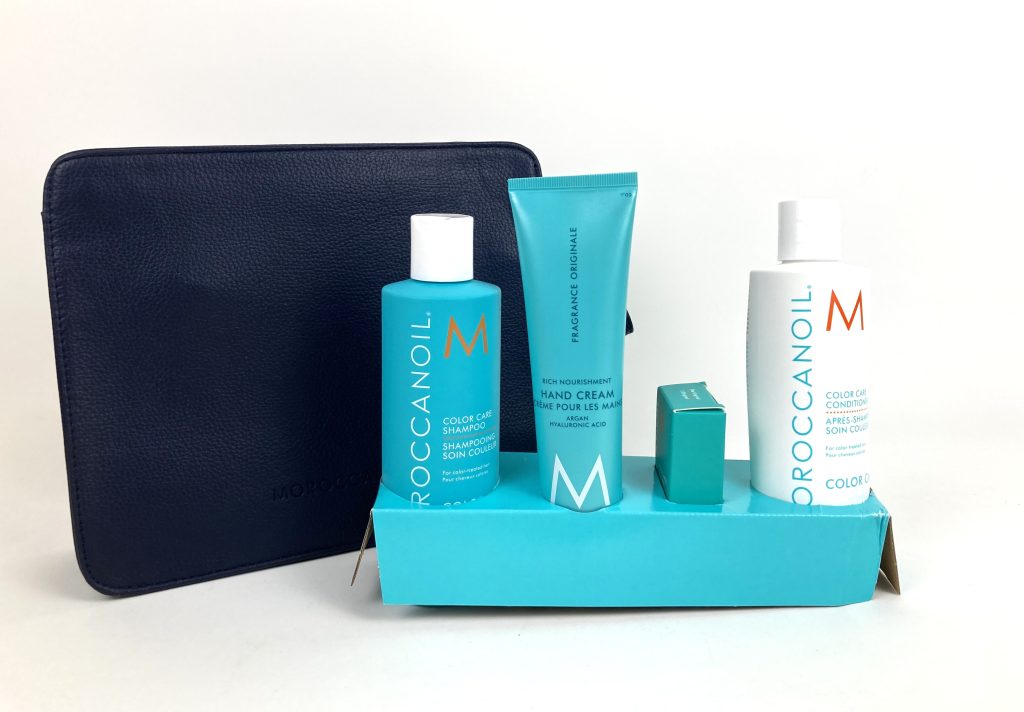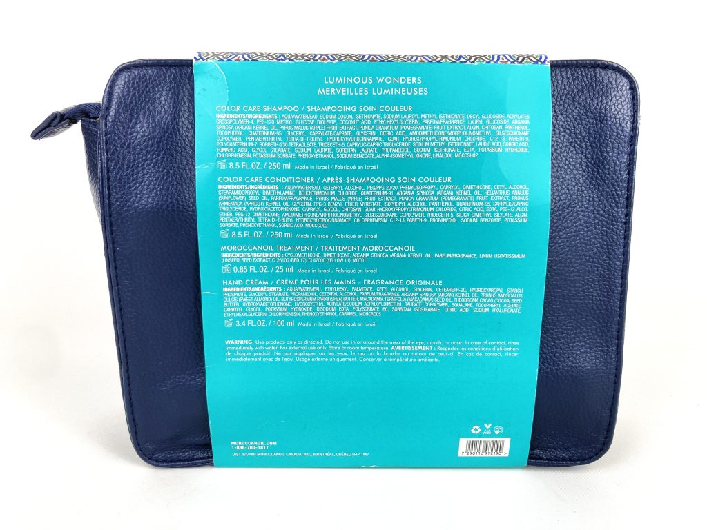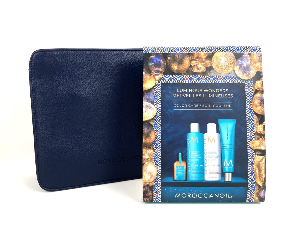 Nieuwe reis haar verzorging set Luminous wonders van Maroccanoil. Inhoud: 250 ml color care shampoo; 250 ml color care conditioner; 25 ml maroccanoil treatment; 100 ml handcrème en een donkerblauwe kunstleren toilettas.