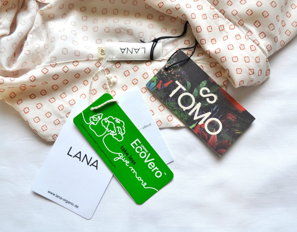 Kleur: ecru met koraal. Materiaal: viscose. Eco vriendelijk. Met boothals en knoopjes op de rug.