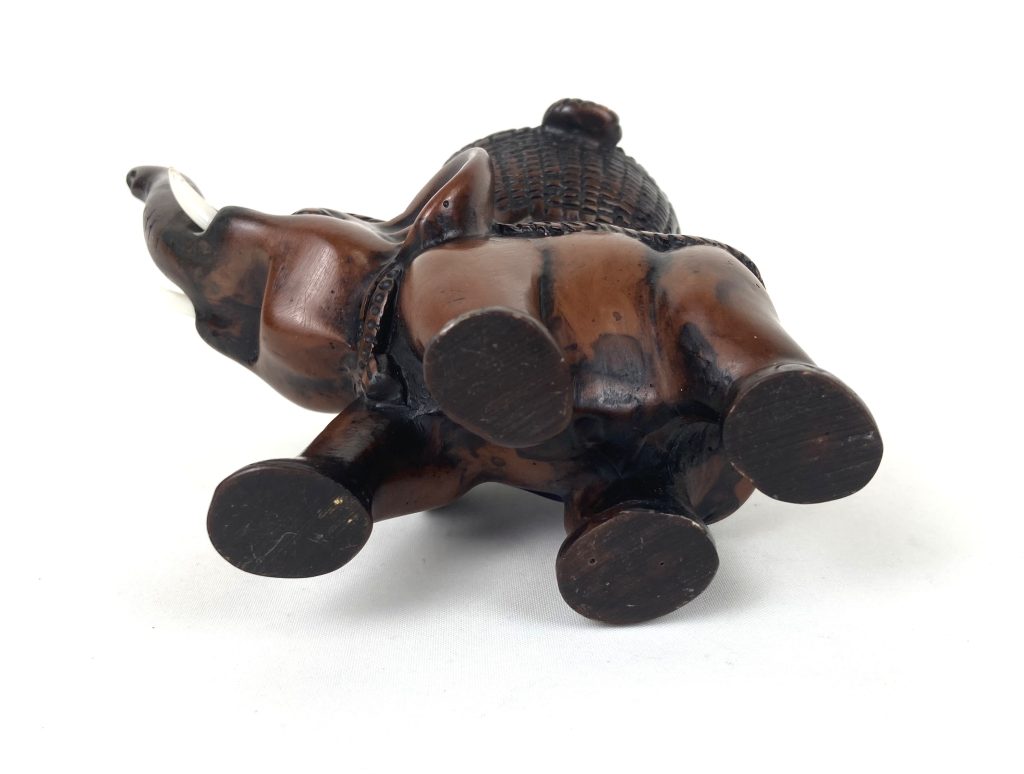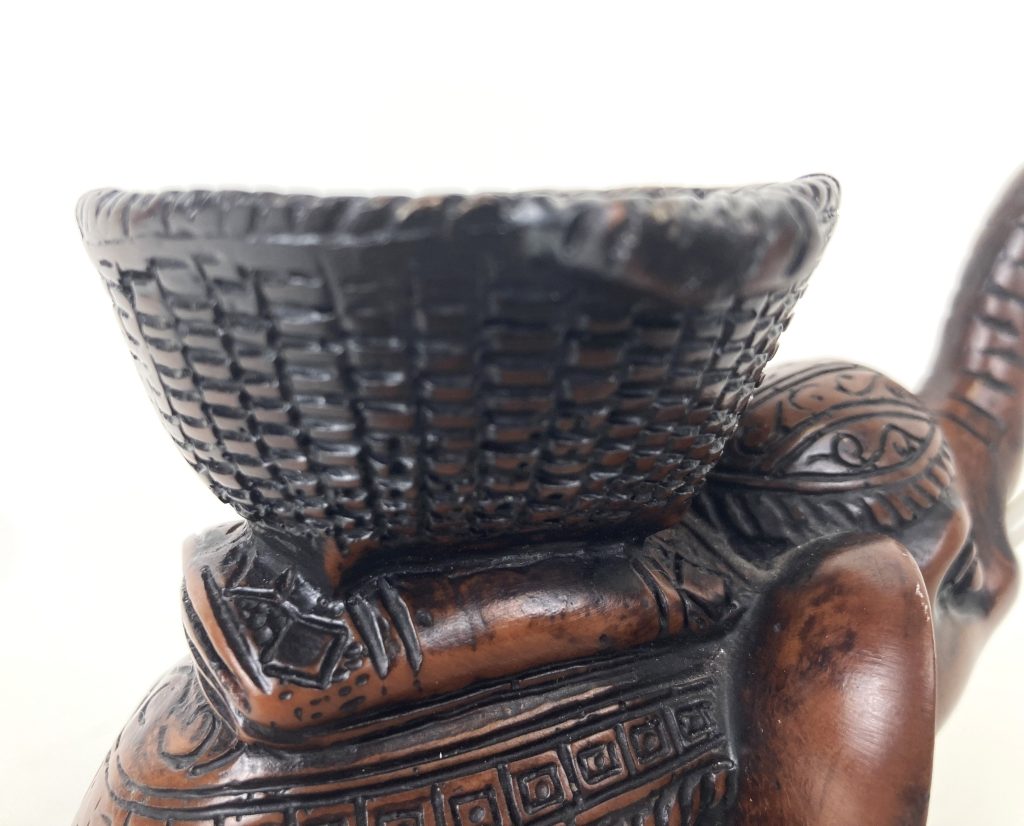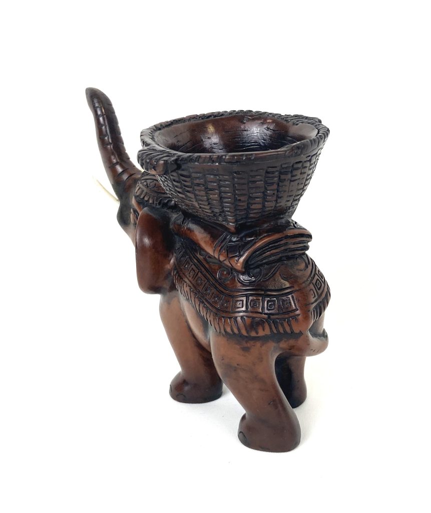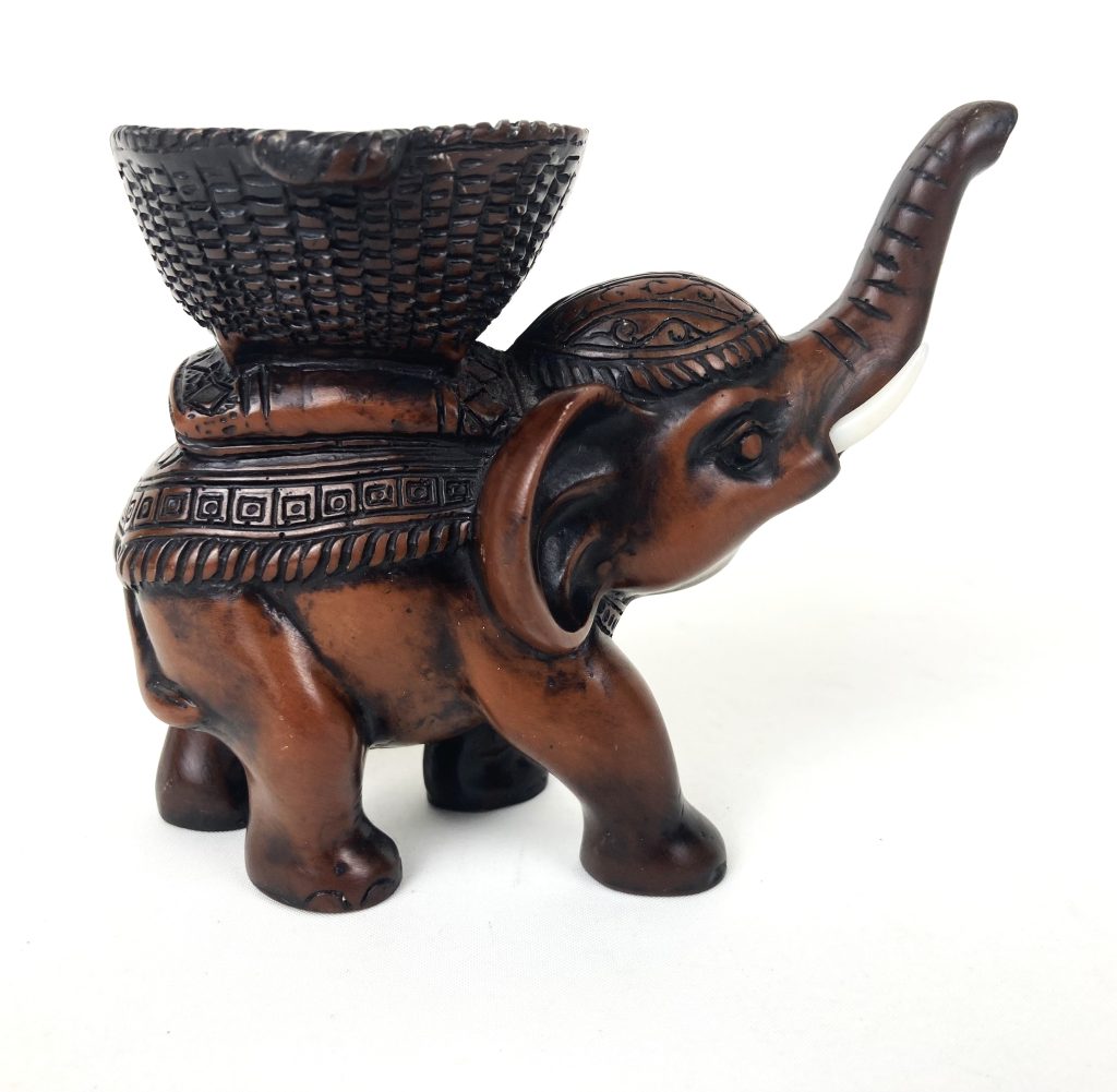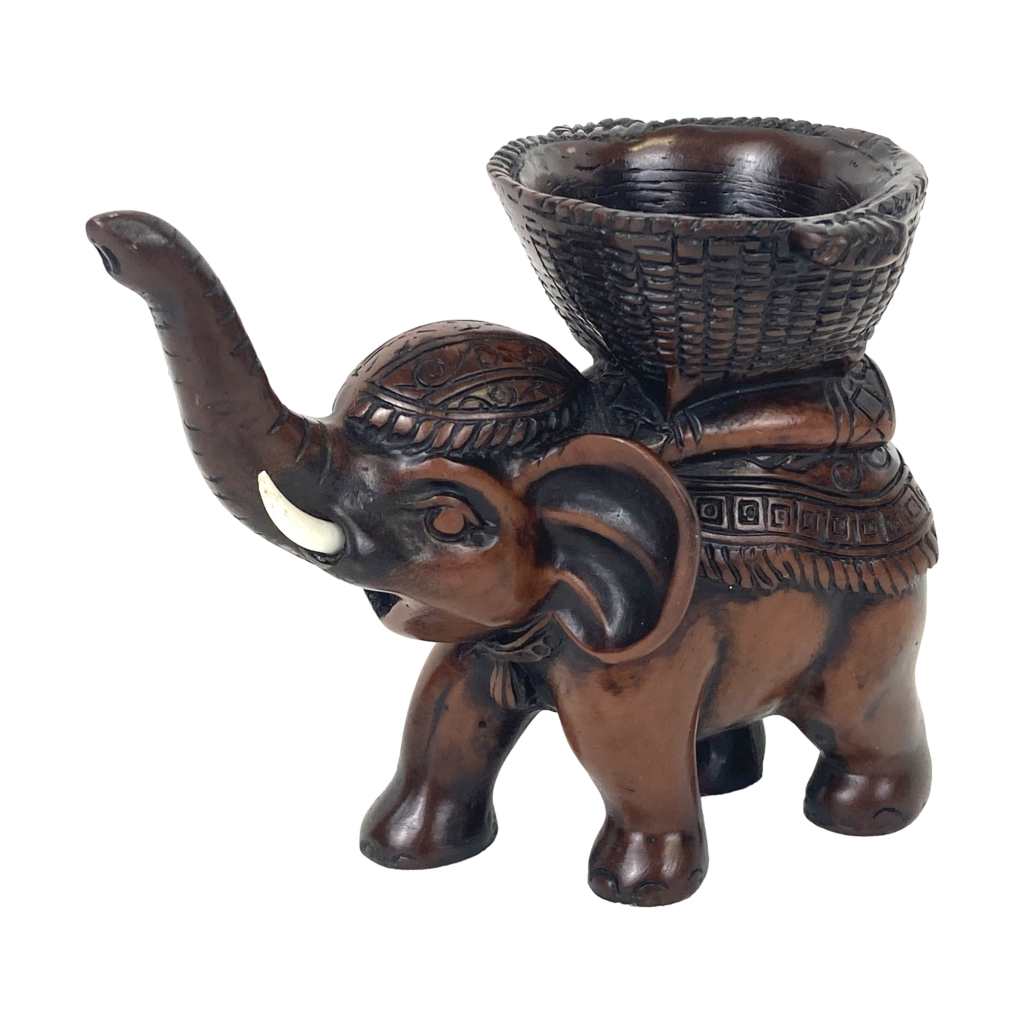 Bruin beeldje van een olifantje met waxinelichthouder op de rug. Materiaal: resin (giethars). Oogt als houtsnijwerk. Formaat: 14 l x 11 h x 8 b. In uitstekende staat.