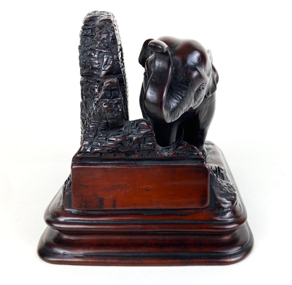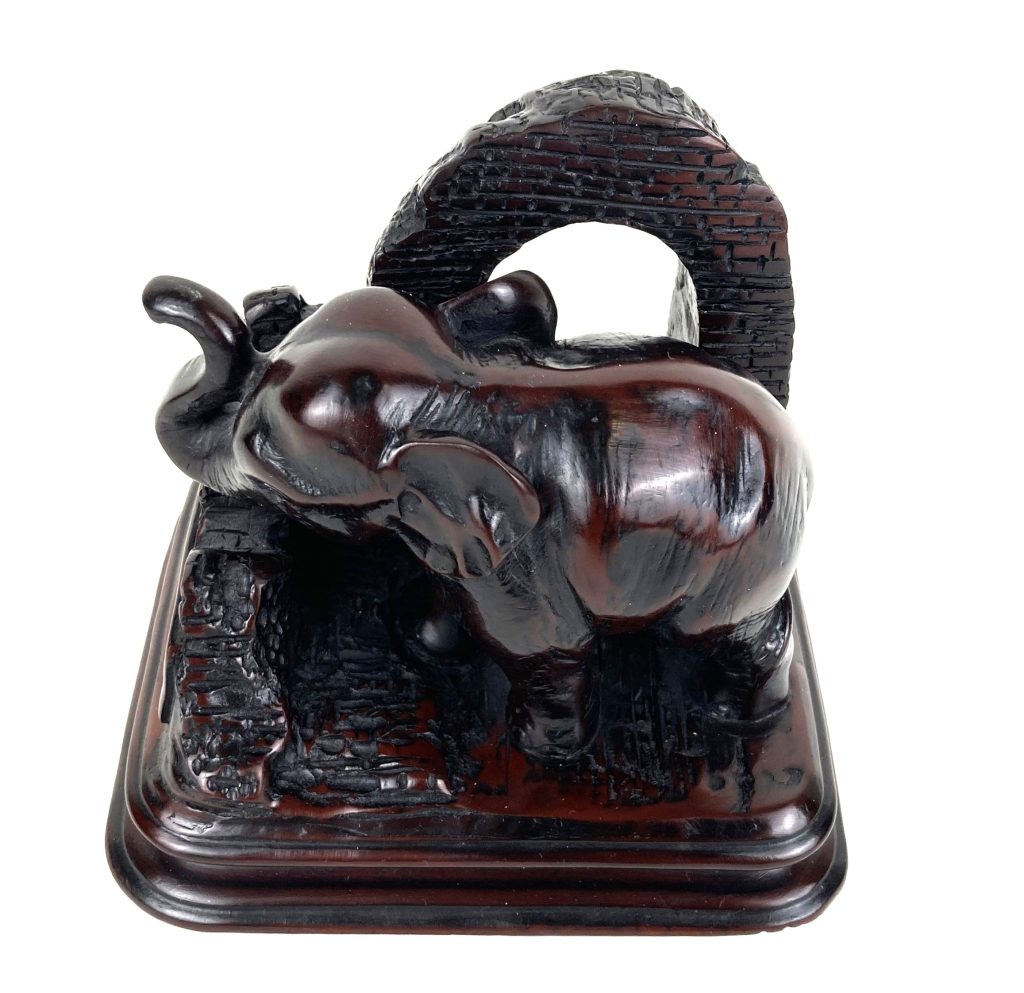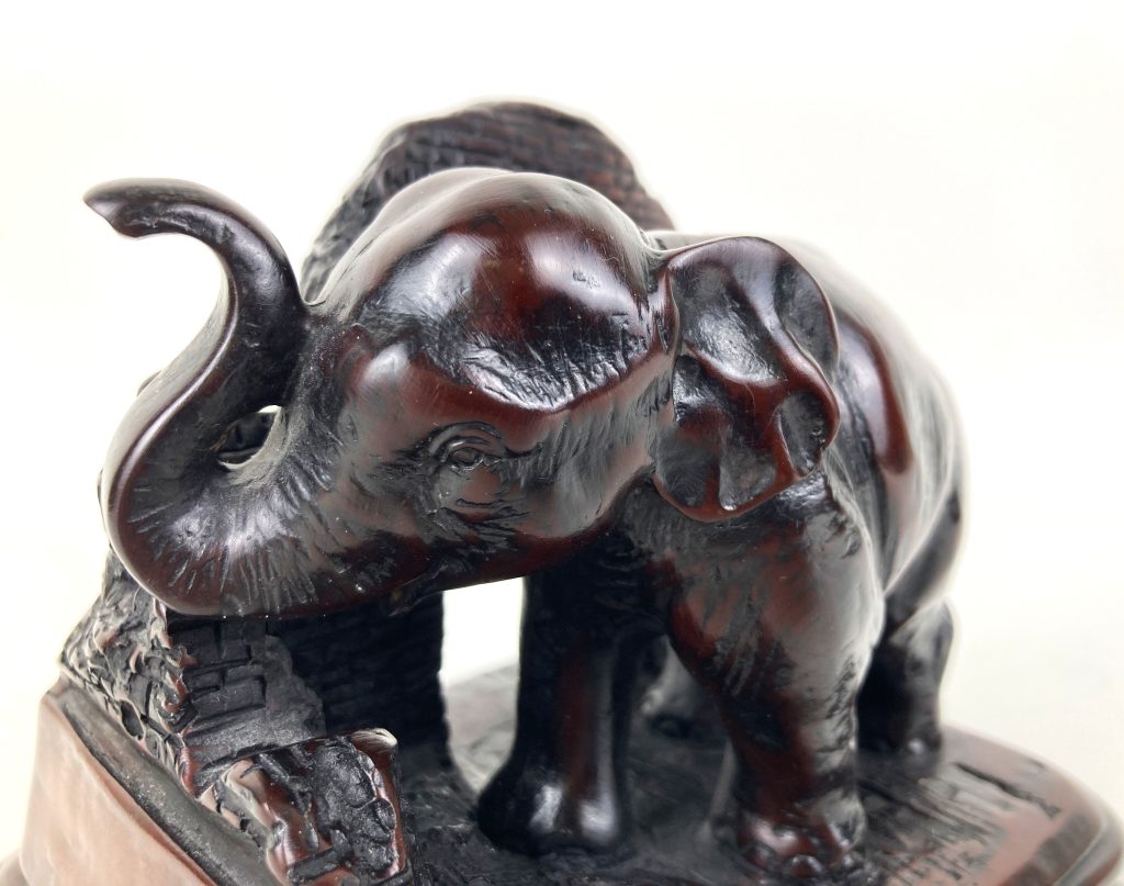 De olifant staat op een (vermoedelijk) houten voet en is van verbronsd metaal.
