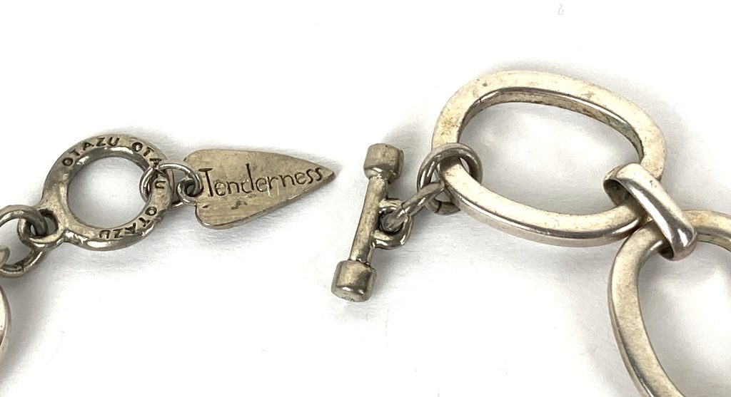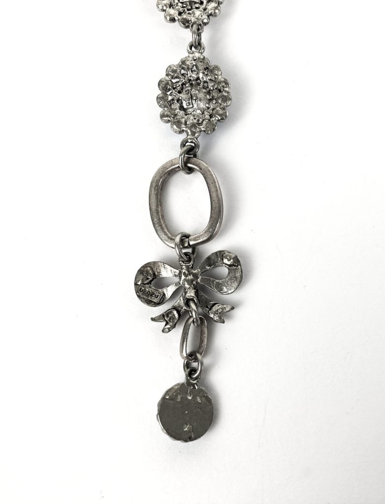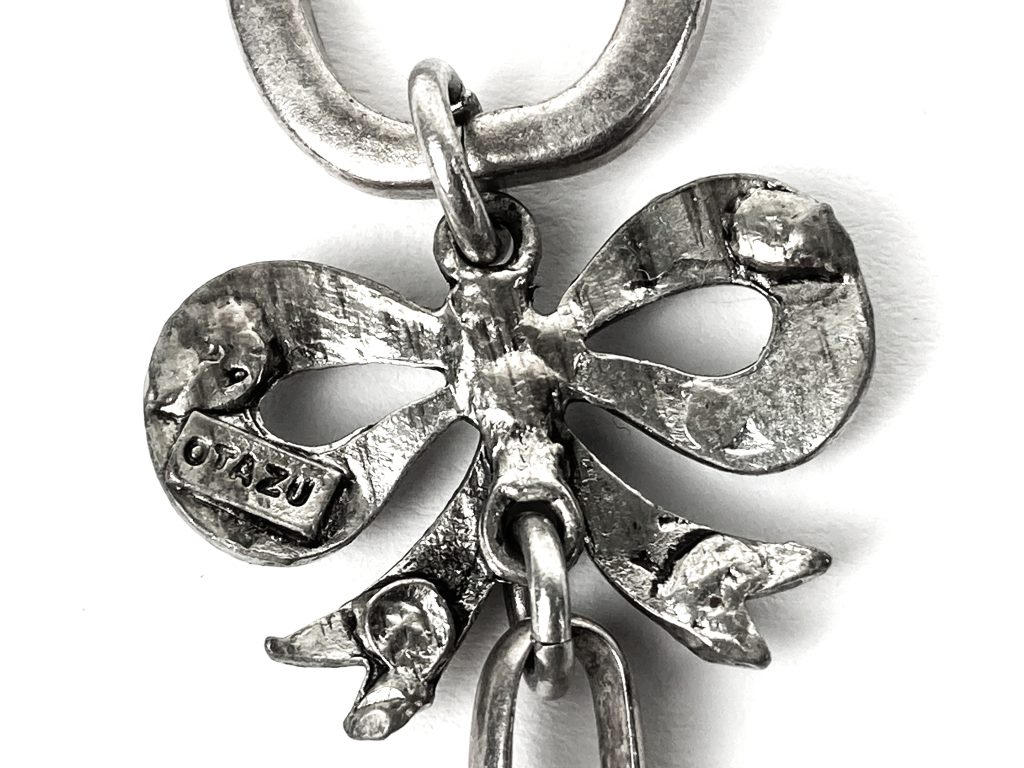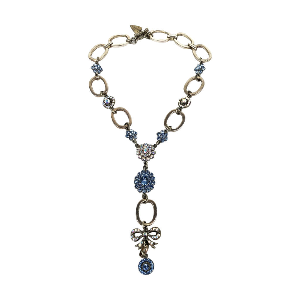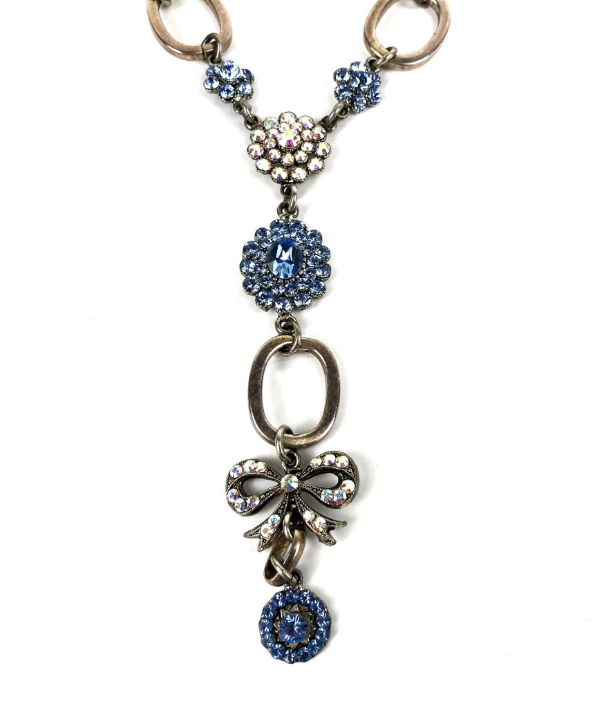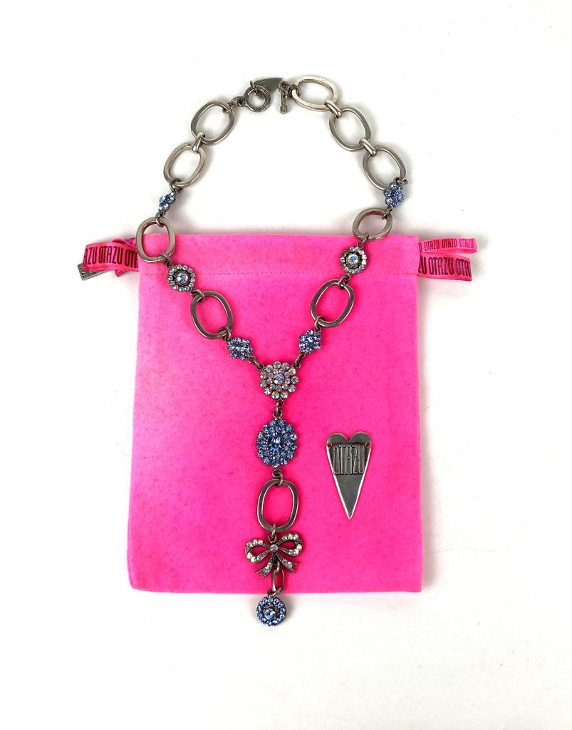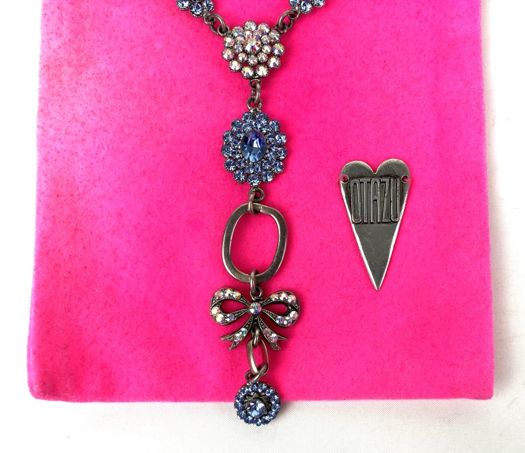 Vintage metalen ketting van Otazu. Met op de sluiting: Tendernes. Met prachtige kristallen bloemen en strik in blauw en roze. Totale hoogte: 32 cm. Halslengte: 43 cm. Met originele zakje.