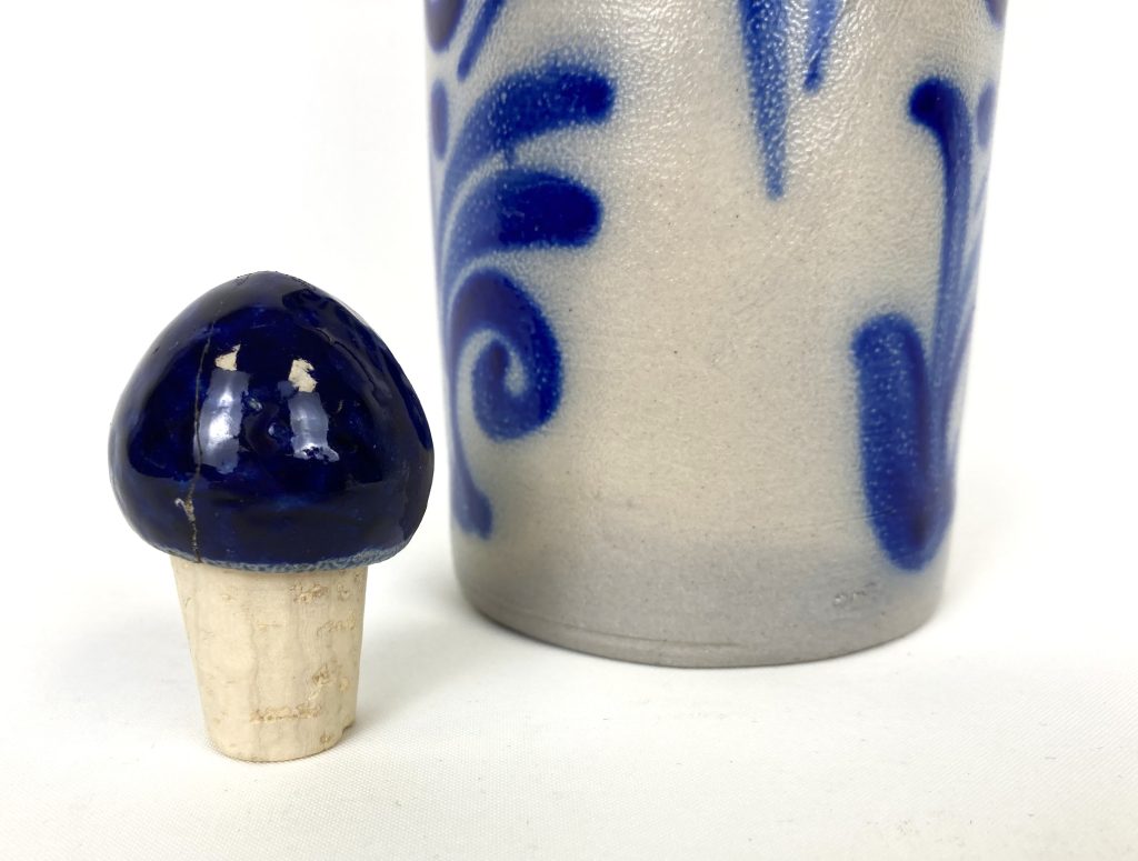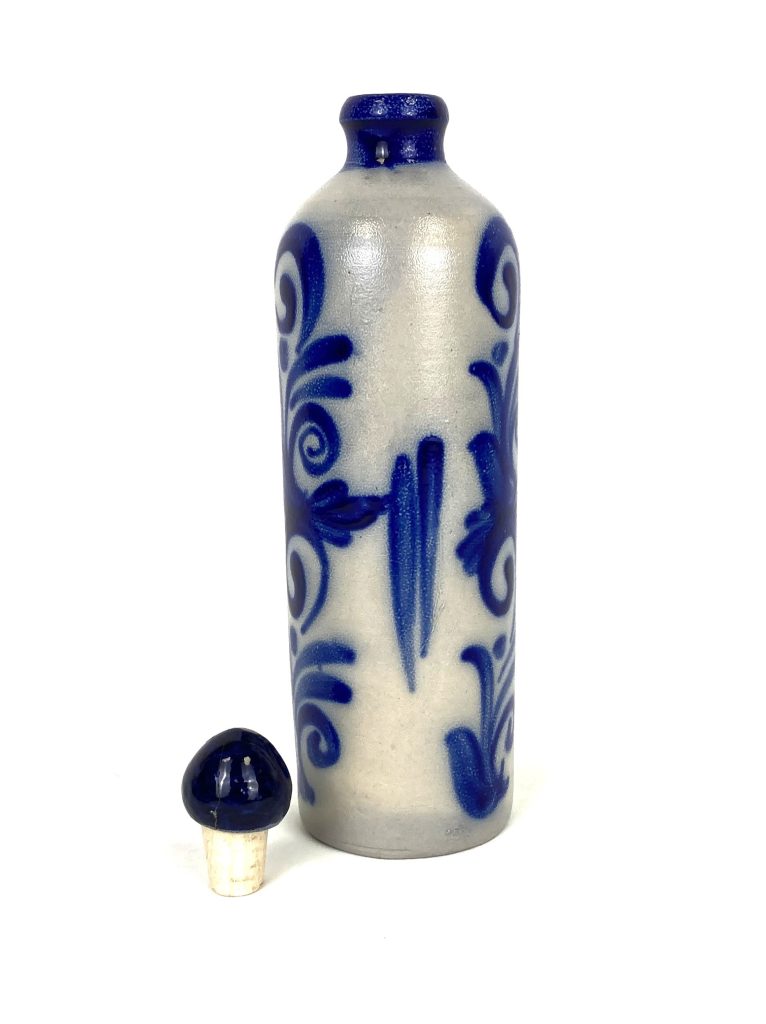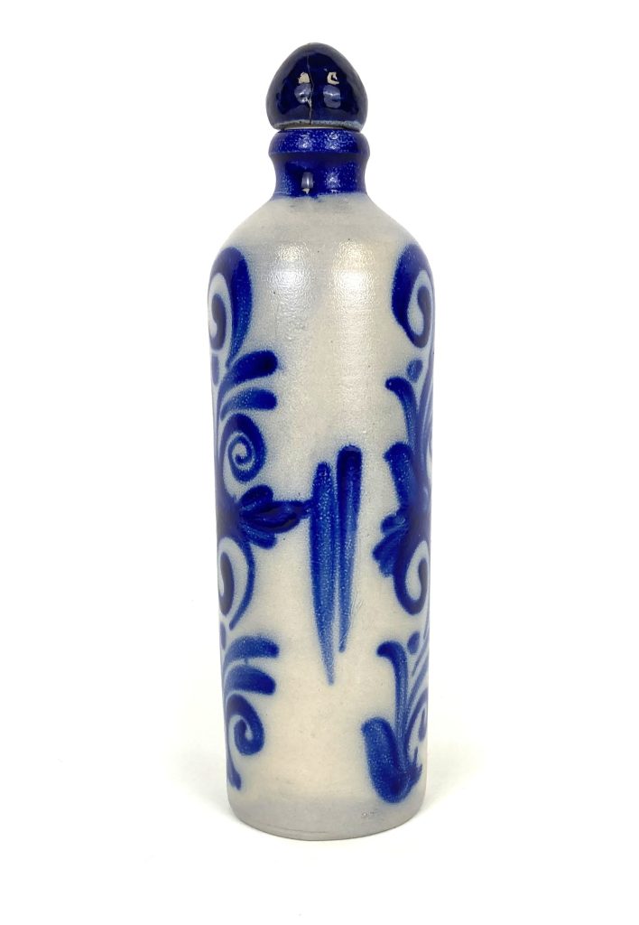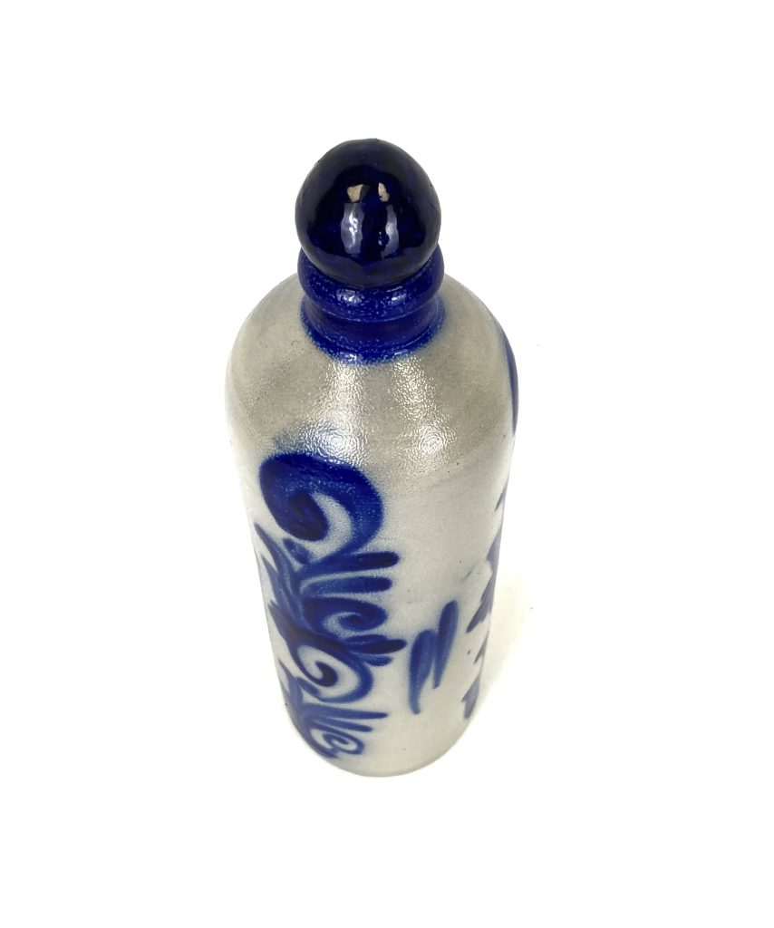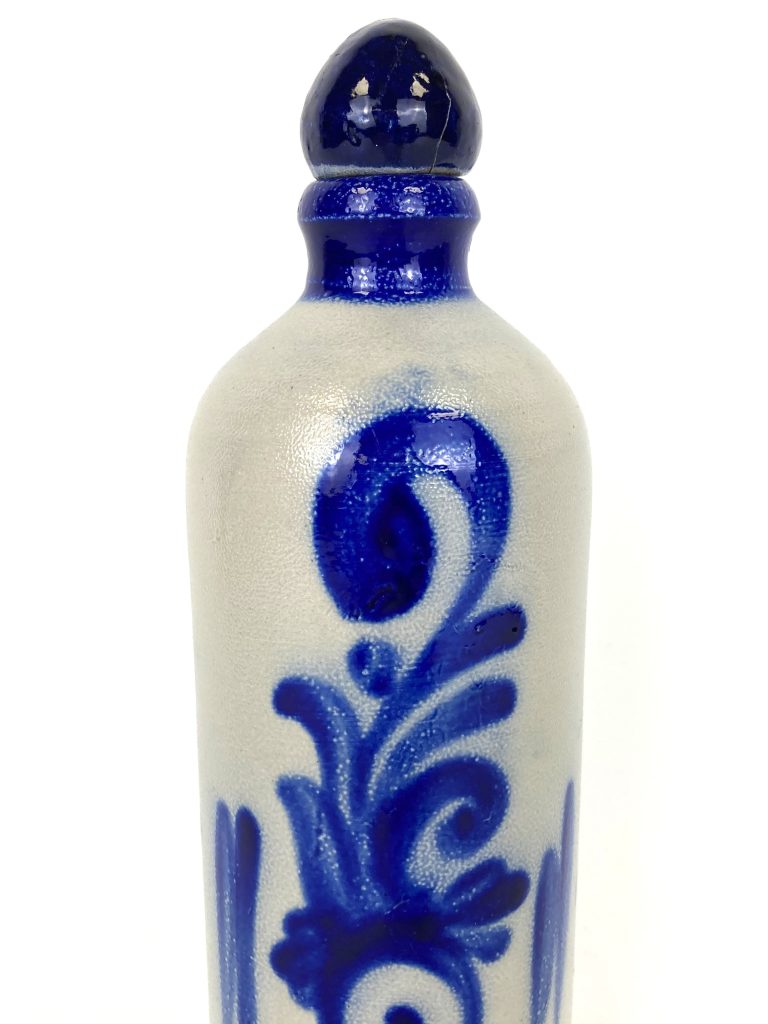 Oude keramieken jenever kruik. In crème met blauwe decoratie. Formaat: 26 cm hoog. Diameter: 7 cm.
