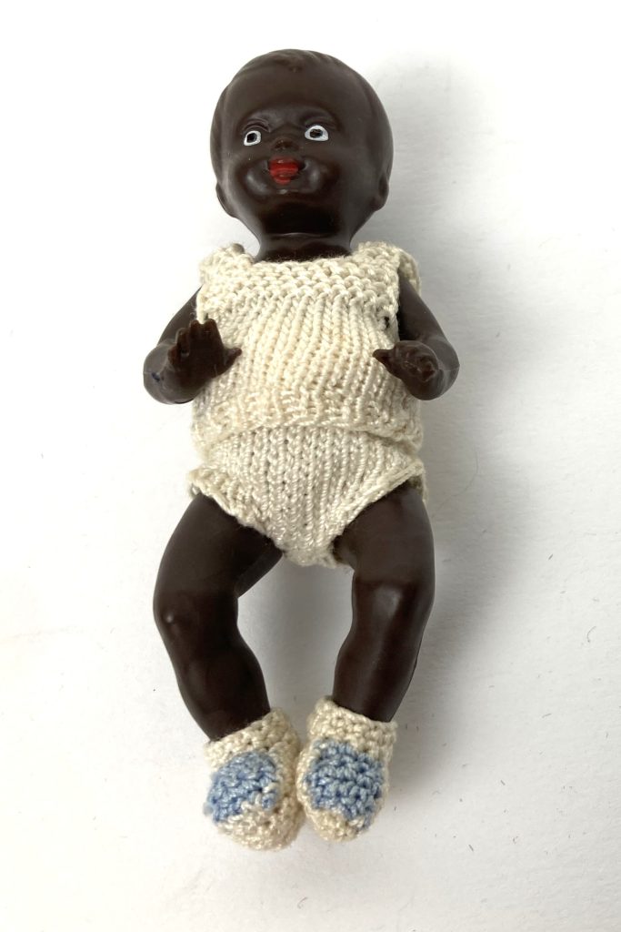 5 Oude poppenhuis poppetjes met beweegbare armpjes en beentjes. Popje met mutsje heeft ook slaapoogjes. Lengte: 9 cm. Donkere en naakte popje gemerkt E.S. W. Germany. Merk overige popjes onbekend. Materiaal: plastic/siliconen/celluloid?