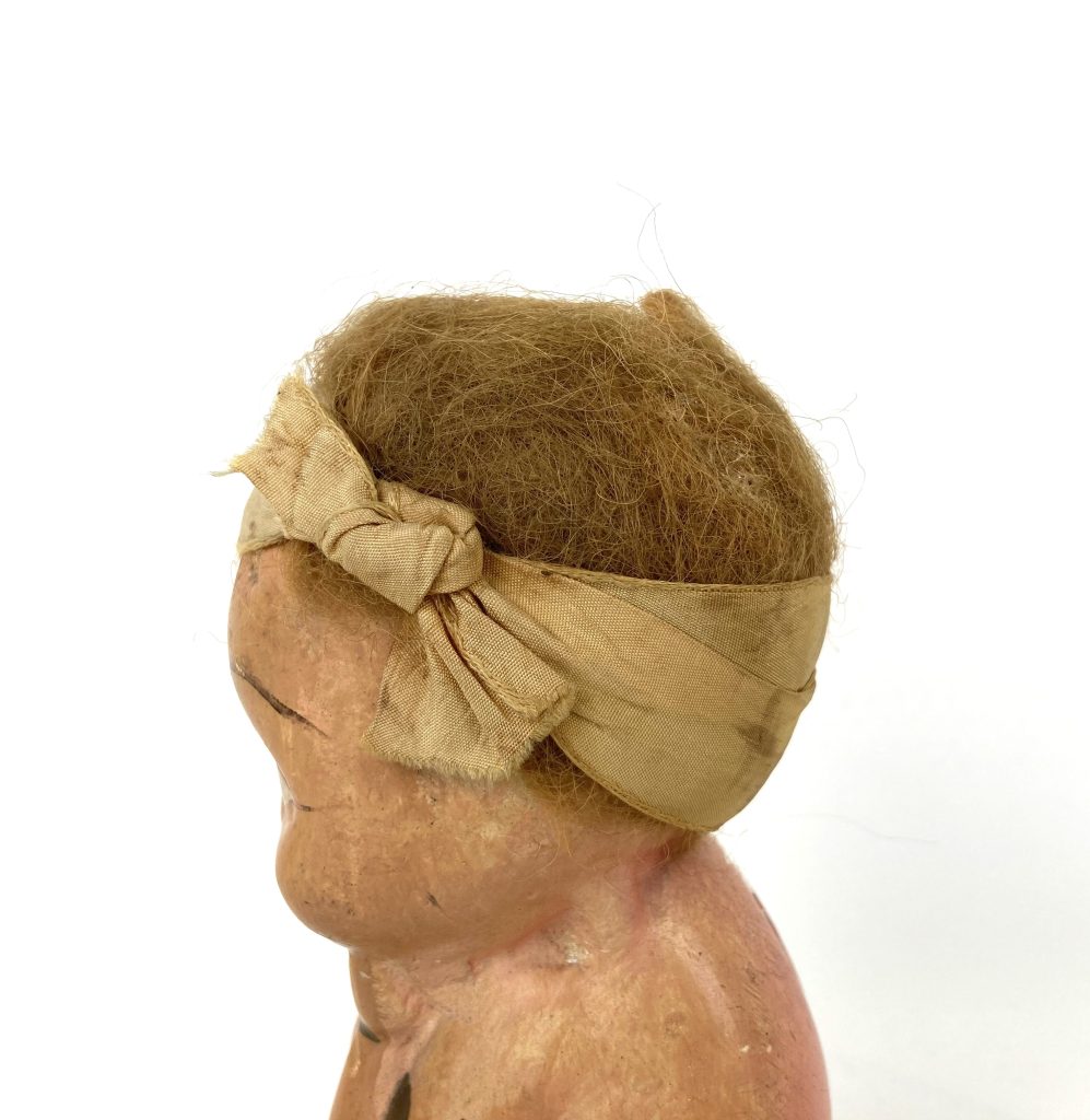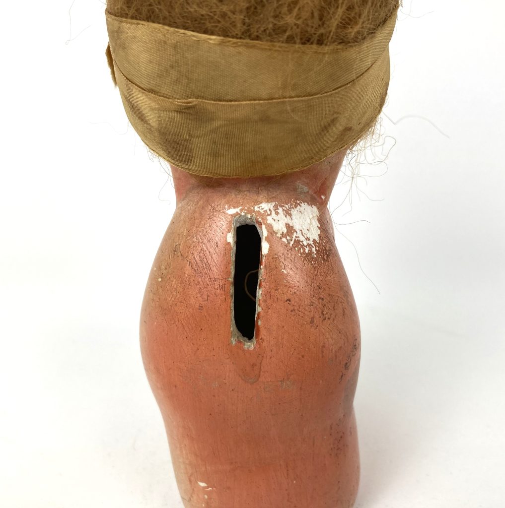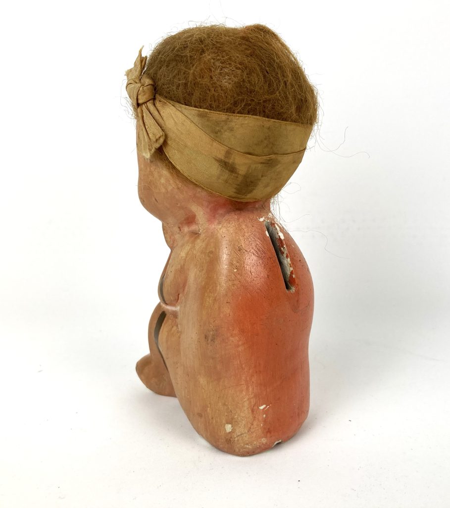 Oude bruine spaarpot van een zittend kindje van gips met haartjes. De spaarpot kan niet worden geopend. Hier en daar is de verf beschadigd.