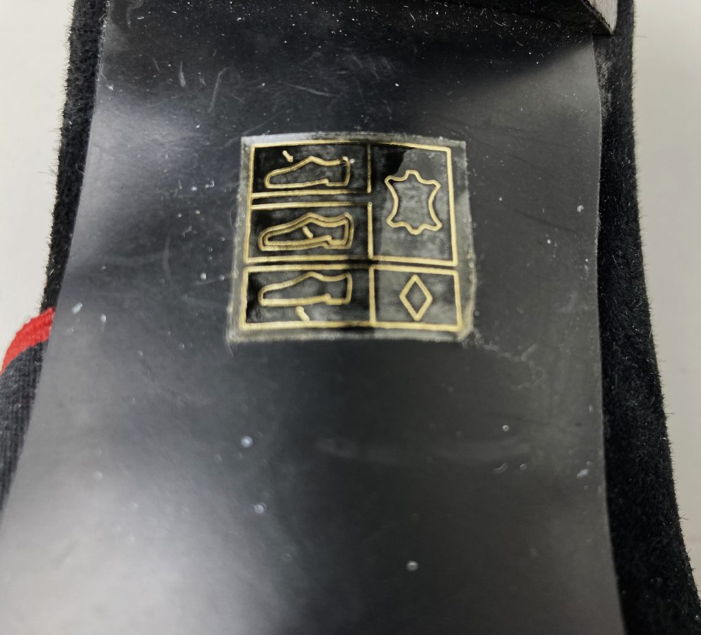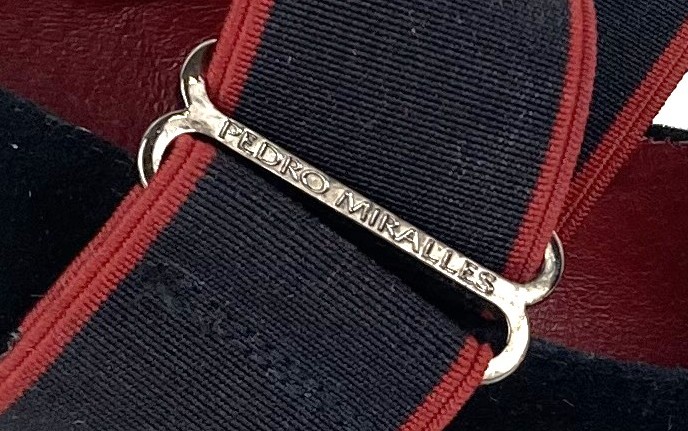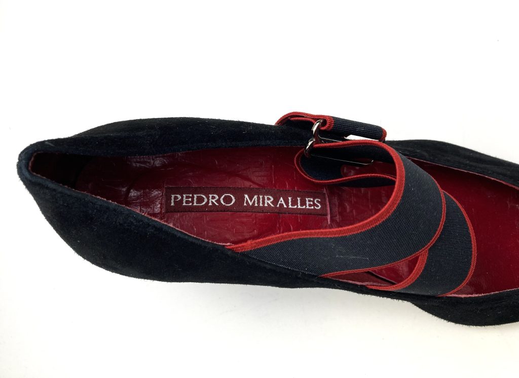 Met rood randje langs de elastieken wreefband en rode leren voering. Binnenzool van rood leer met logo. Met goudkleurige metalen sier gesp met naam Pedro Miralles.