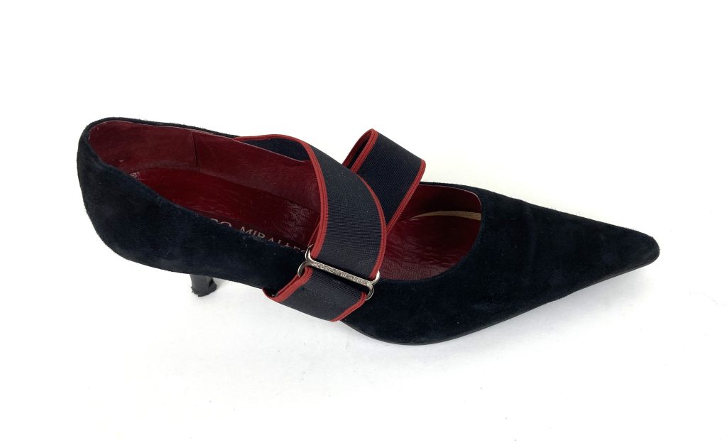 Zwart met rode suède pumps van Pedro Miralles (Spanje). Met naaldhak van 6 cm en puntige neus.
