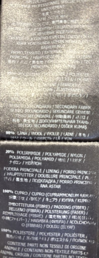 80 % wol, 20% polyamide ; voering 95% polyester 5% elasthan