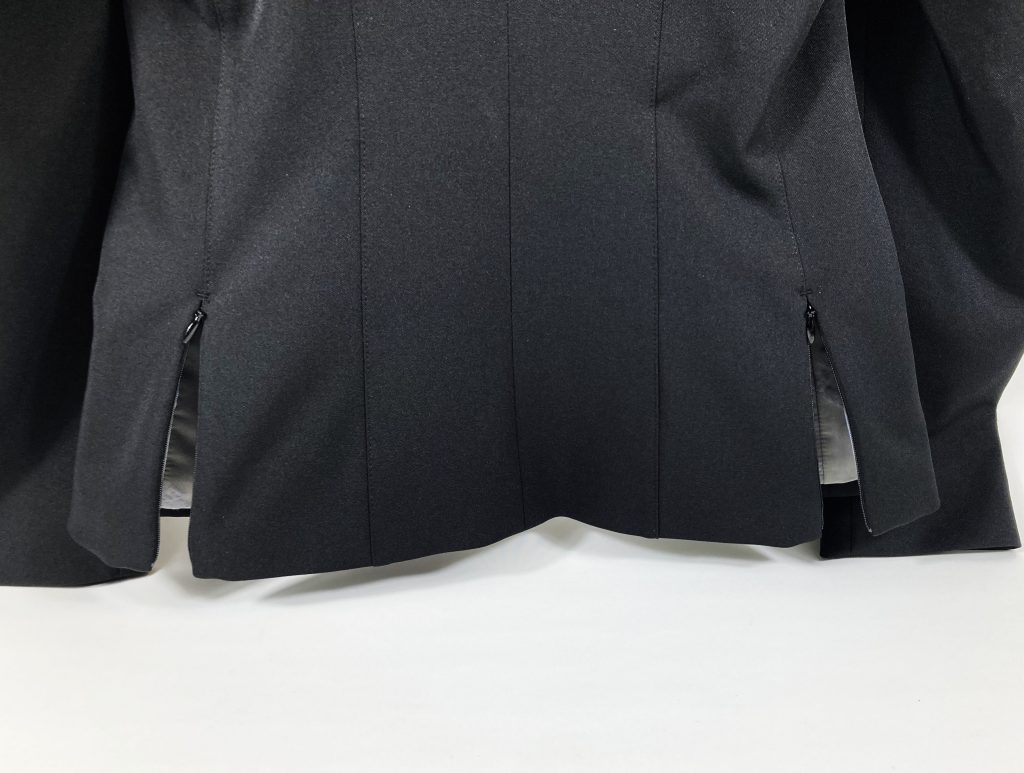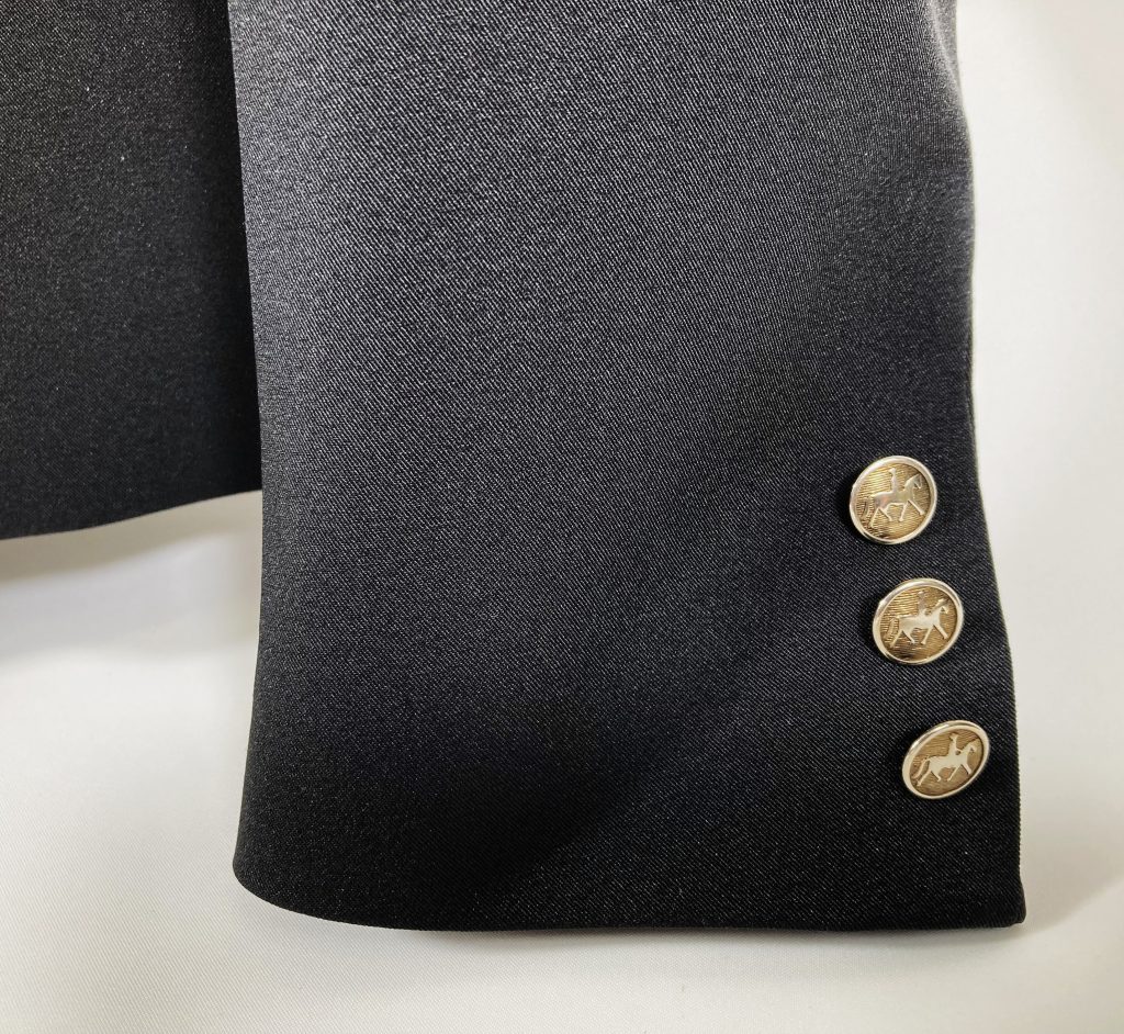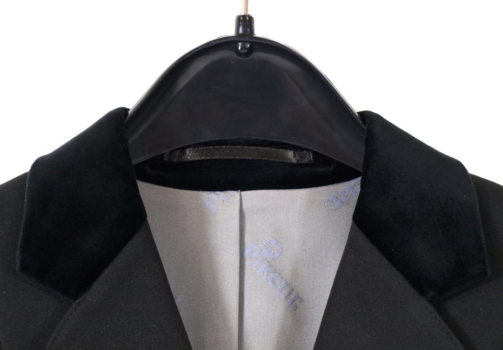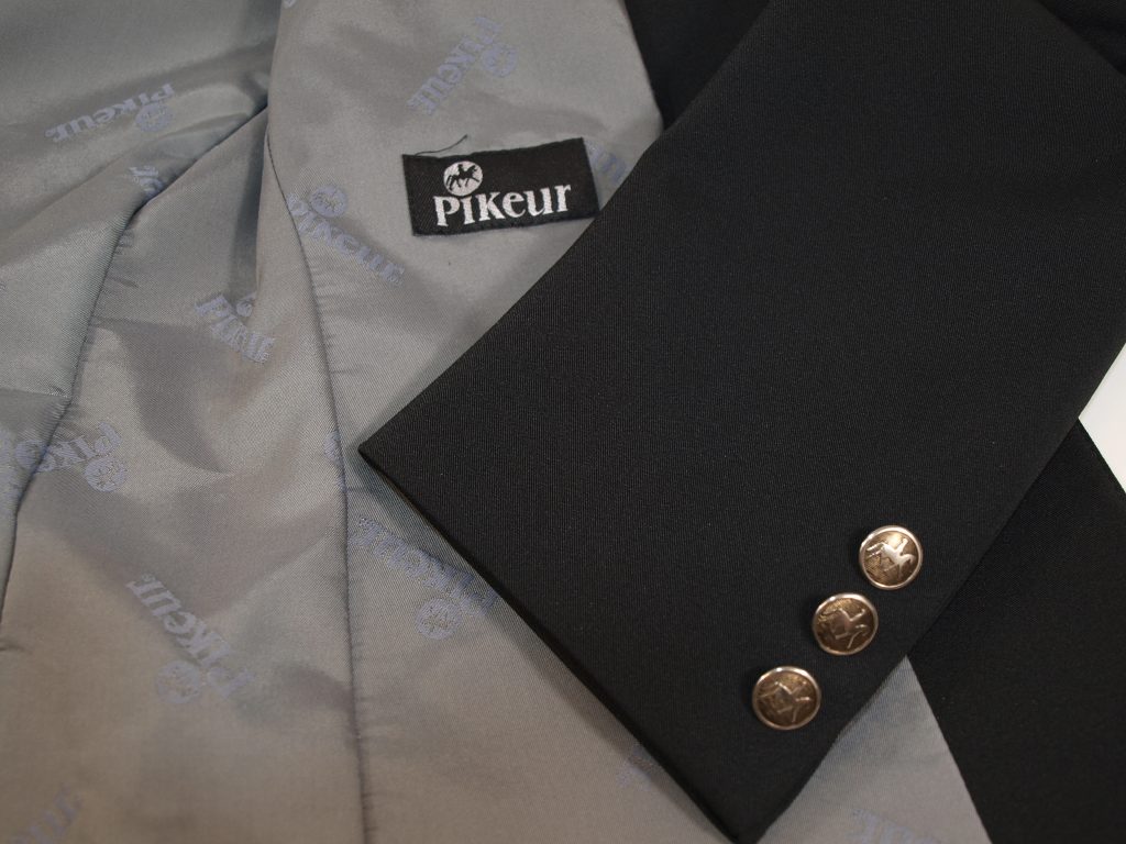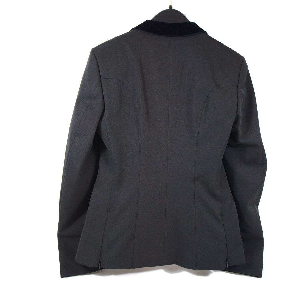 Kleur: zwart. Maat: 76 (lengtemaat). Getailleerd. Kort model. Met fluwelen boord. Zakjes met ritssluitingen aan de voorzijde. Dubbele split met ritssluiting aan de achterzijde. Met fraaie zilverkleurige knopen. Afmetingen: taille: 38 cm. Van schoudernaad tot schoudernaad: 42 cm. Mouwlengte: 62 cm. Het jasje heeft een geborduurd Pikeur logo boven de rechter zak en is machine wasbaar.