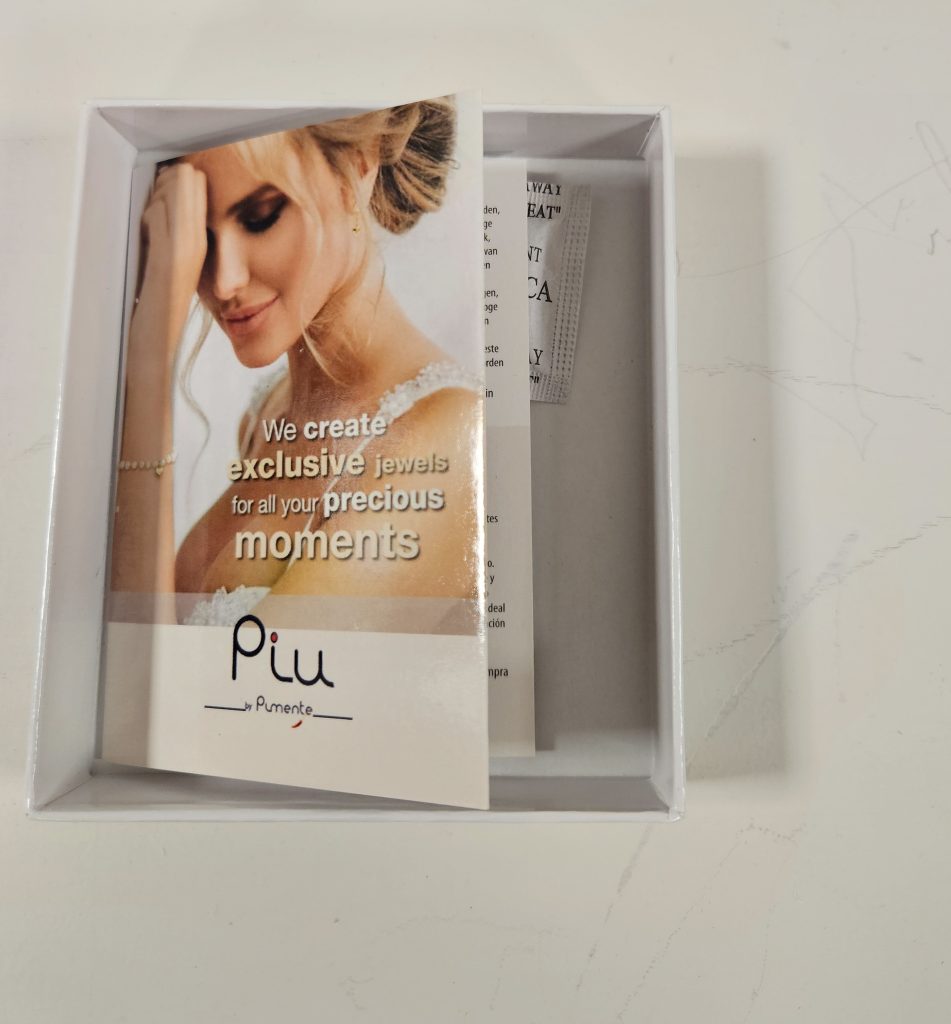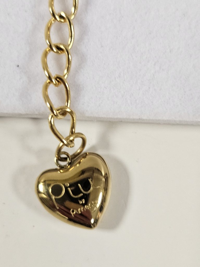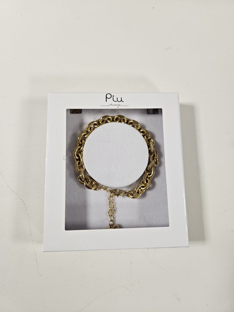 Een mooie goudkleurig verguld schakelarmbandje van Piu -in originele verpakking – compleet met bijbehorende documentatie. Lengte van armbandje is 17 cm – inclusief verstelbaar deel 24 cm.