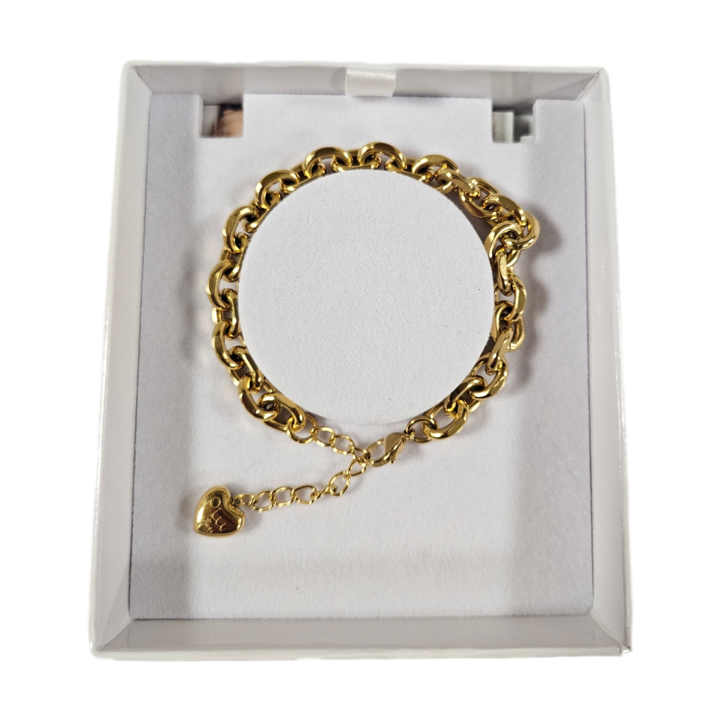 Voeg een vleugje liefde toe aan je sieradencollectie met deze schakelarmband van Piu. De armband is verguld in een warme goudkleurige finish en is voorzien van een stijlvol hartje dat symbool staat voor liefde en verbondenheid.