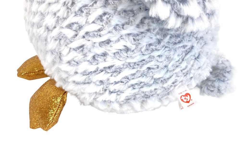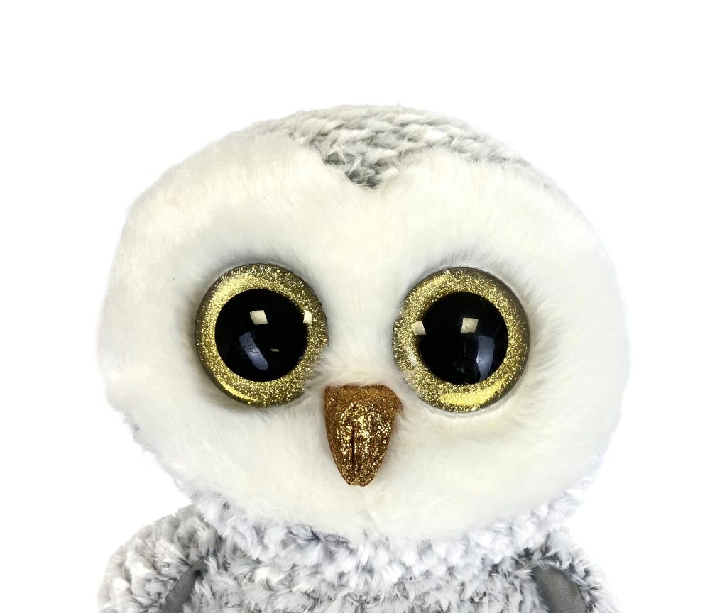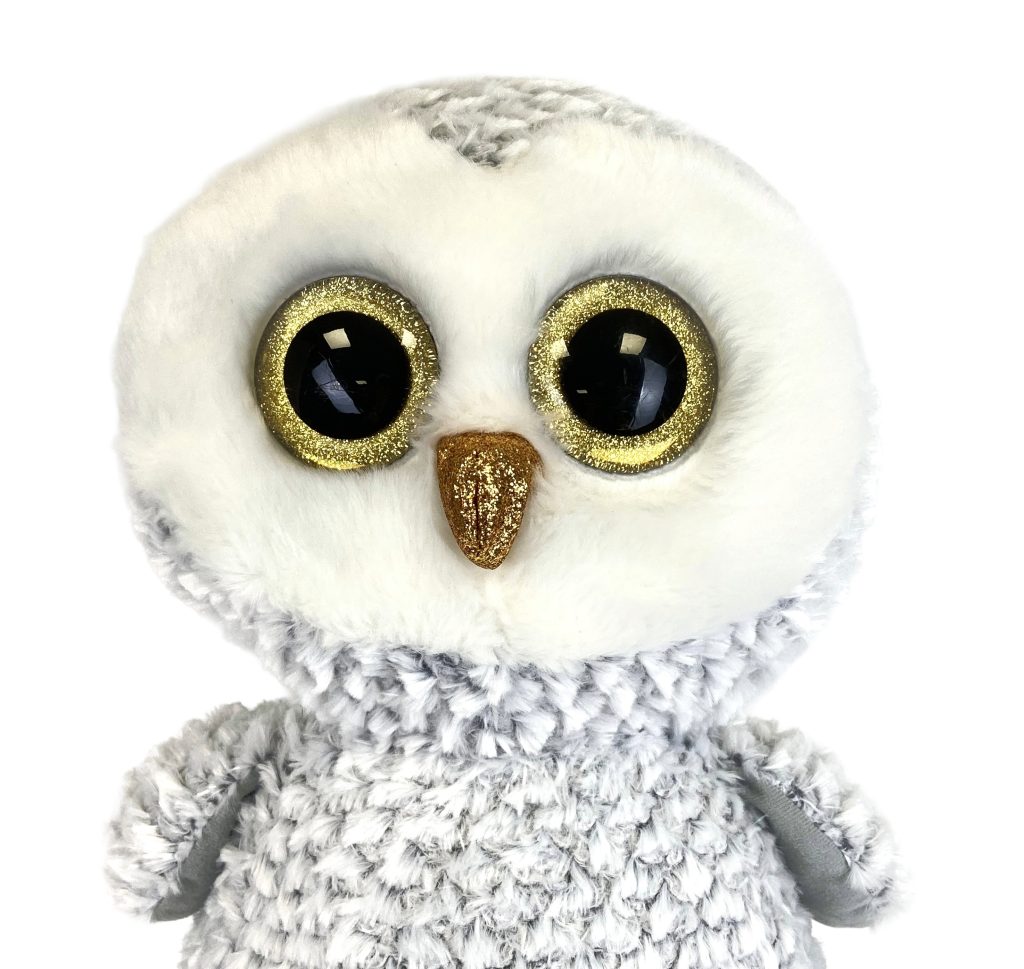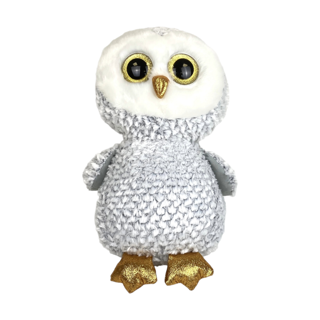 Pluchen knuffel uil Owlette van Ty Beanie Boo. Formaat XL (42 cm). In licht grijs met wit en gouden oogjes en pootjes. Nieuw zonder prijskaartje.