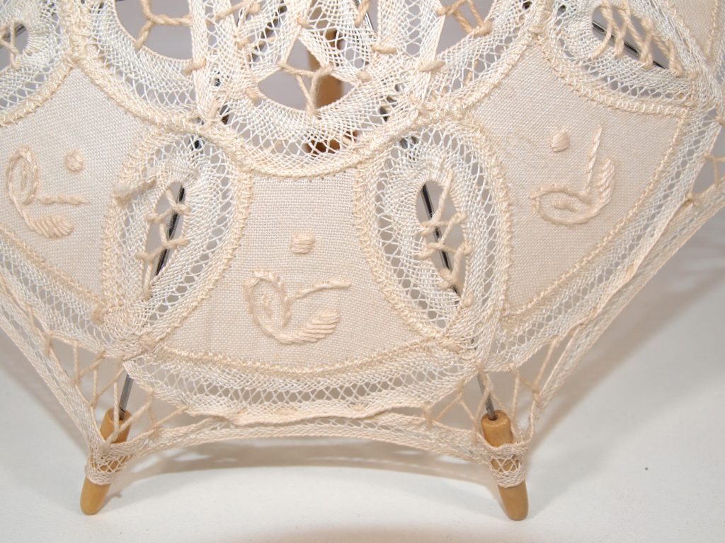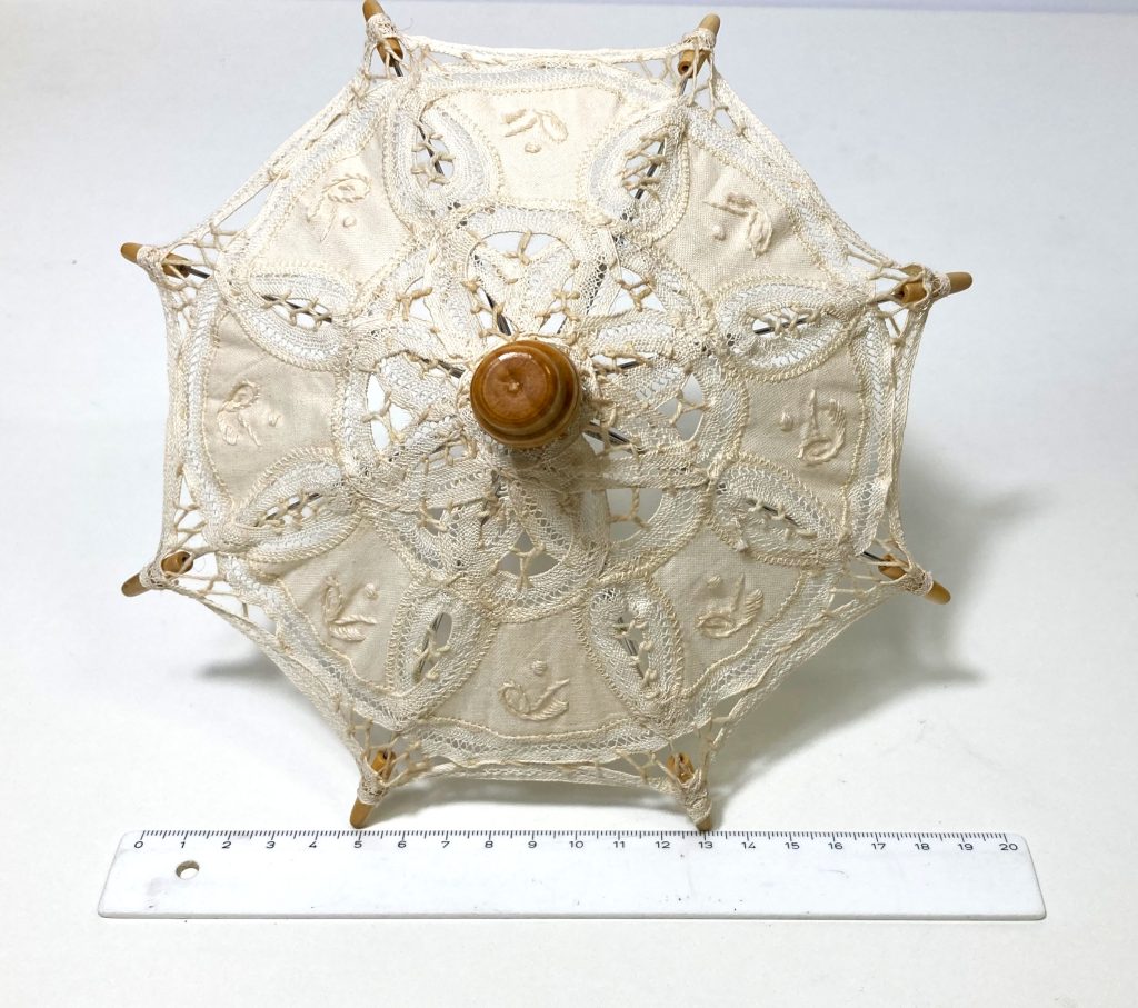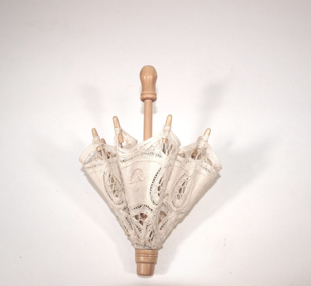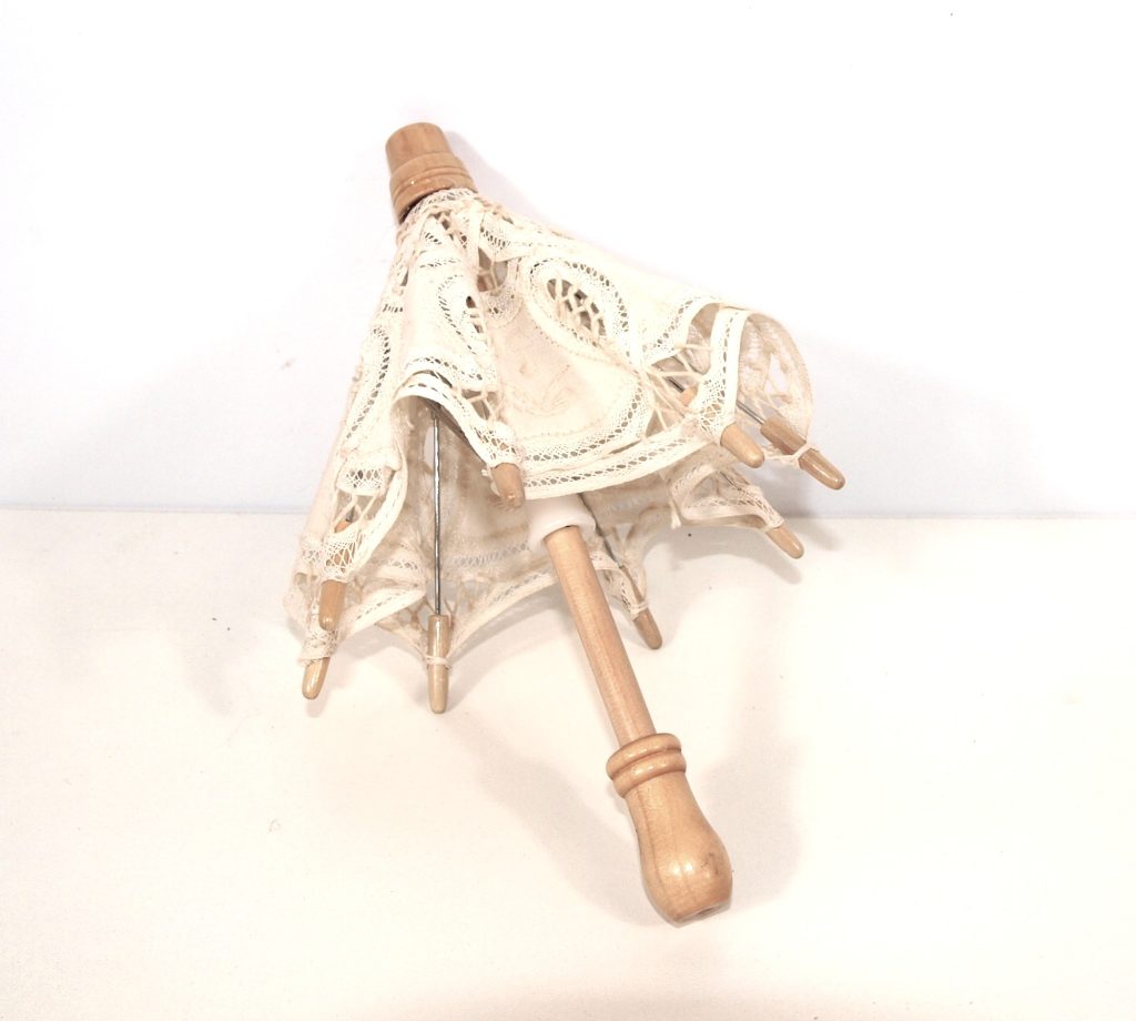 Poppen parasol / paraplu. Materiaal: katoen, kant en hout.