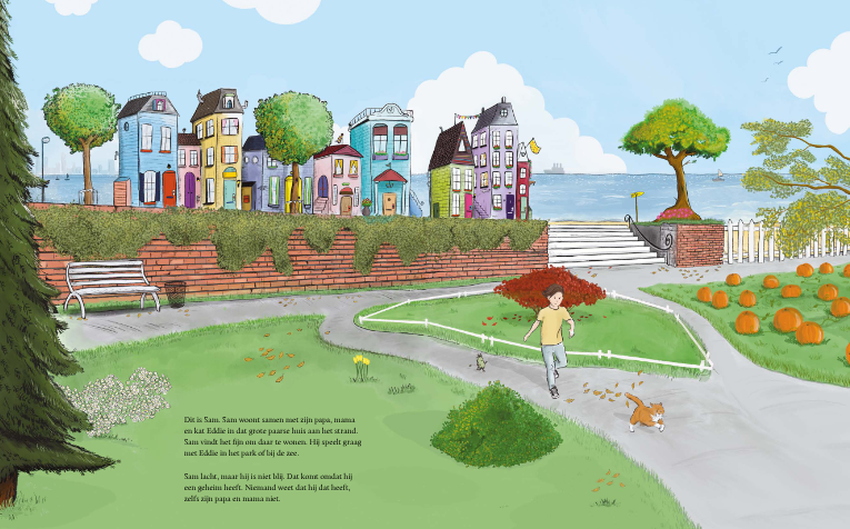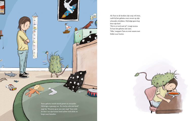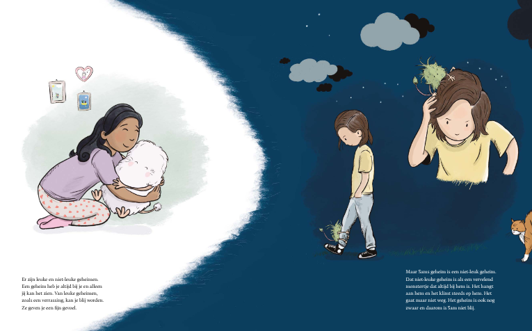 Sam lacht, maar hij is niet blij. Dat komt omdat hij een geheim heeft, een niet-leuk geheim. Niemand weet dat hij het heeft. Hij zou het wel aan iemand willen vertellen, maar dat durft hij niet.