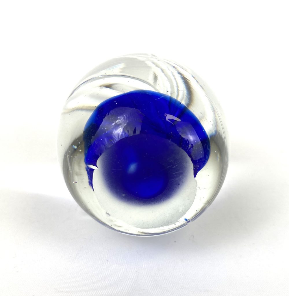 Ei-vormige glazen presse-papier in azuur blauw/transparant.