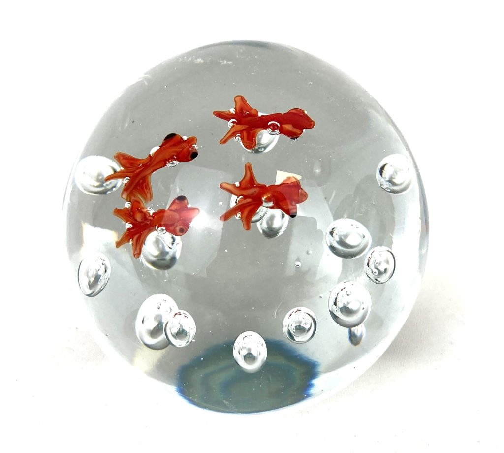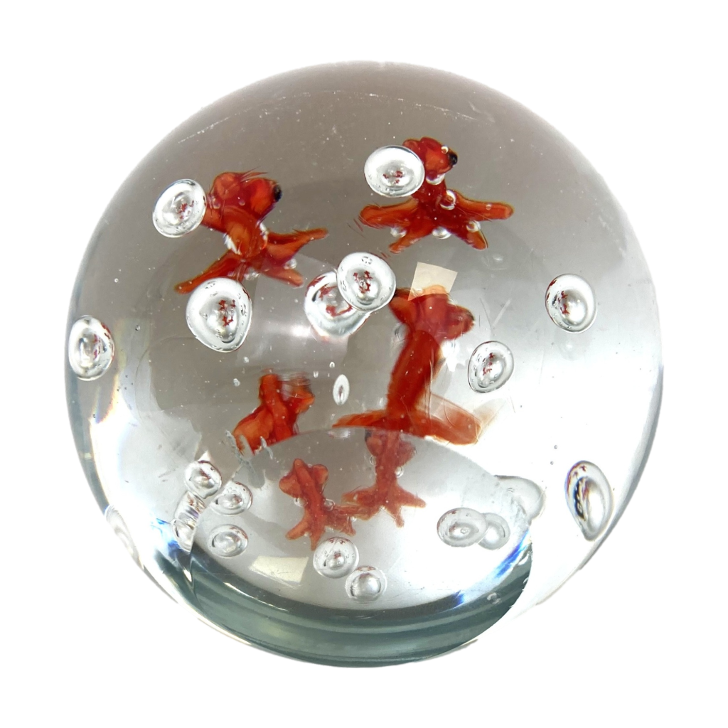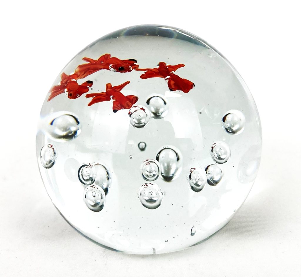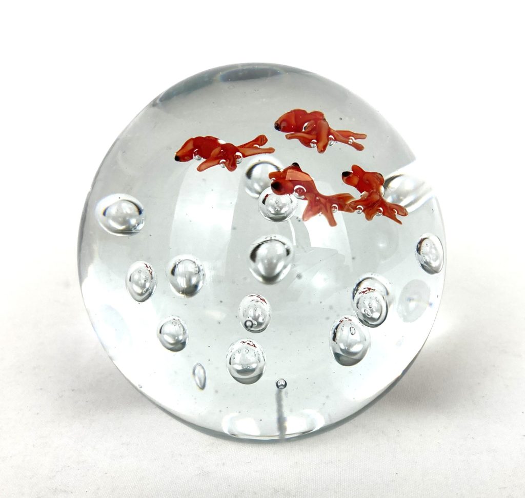 Glazen bol presse-papier met goudvisjes en luchtbellen. Hoogte: 8 cm. In uitstekende staat.